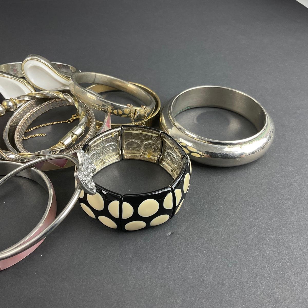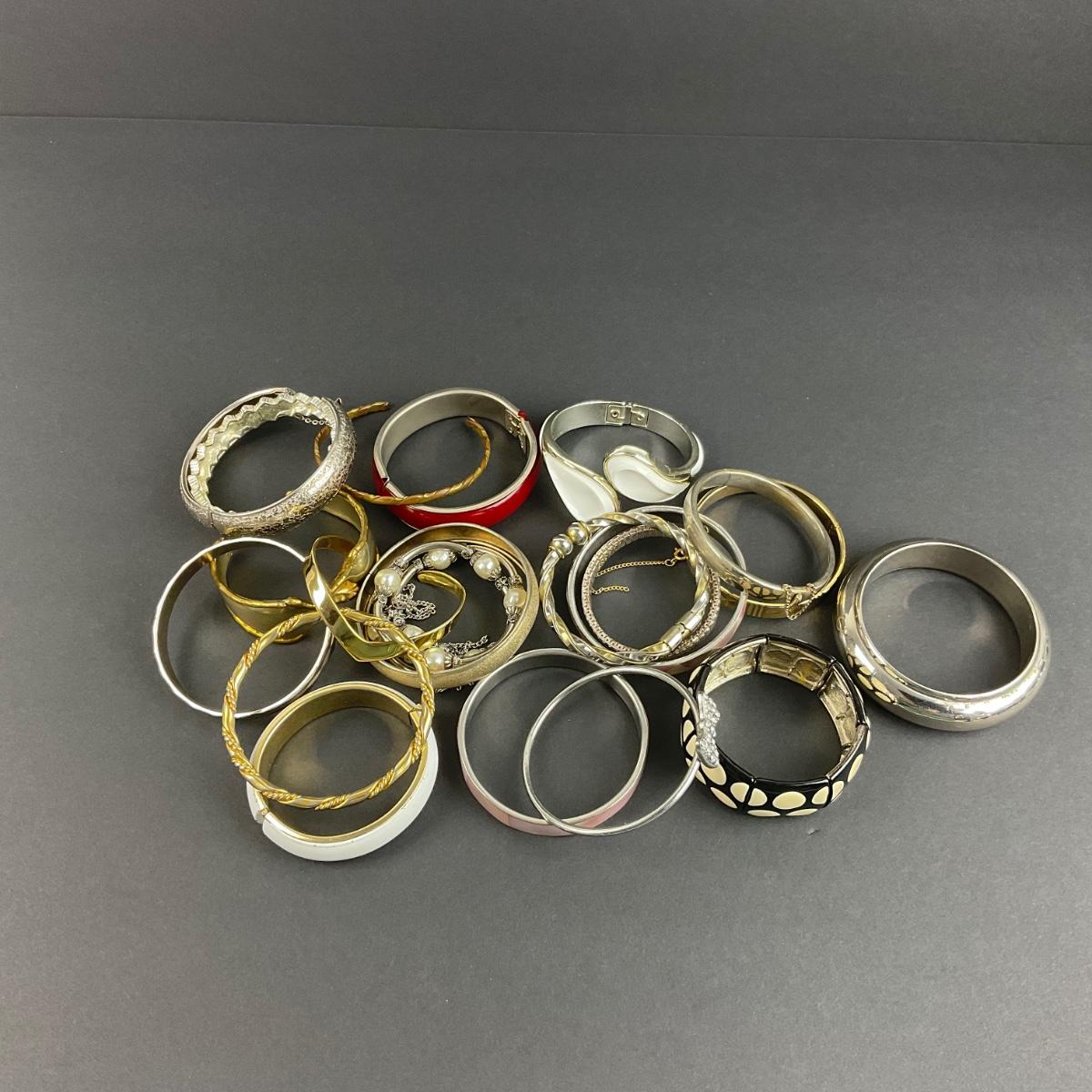 21 miscellaneous assortment of bangles. Please see photos for details and condition. Any condition statement is given as a courtesy to a client, is an opinion, and should not be treated as a statement of fact. Reference to condition written, oral or within a condition report shall not be regarded as a full account of condition and may not include all defects, alterations, or restorations. Absence of a condition report does not imply a lot is flawless or lacking imperfections or damage. Katherine’s Auction & Appraisal Service shall have no responsibility for any error or omission. Returns shall not be accepted on the basis of condition. ::: Shipping is available on this lot. If you require shipping you must let us know at the close of the auction. We will coordinate with you after the item has been won. Shipping fees will include insurance up to or exceeding the value of all items being mailed. If you have any questions regarding this lot please contact the auctioneer either via this website, by direct email or by phone. PICK UP TIMES and other important information can be found in the TERMS and DESCRIPTION of the auction. Please take a look for pertinent information. Thanks!