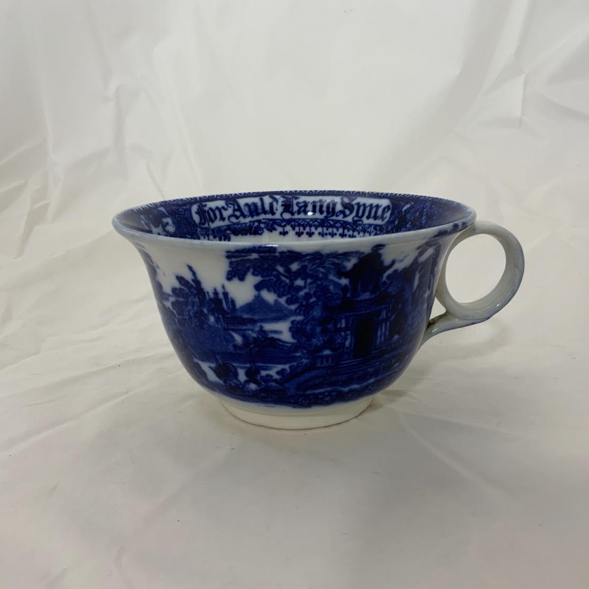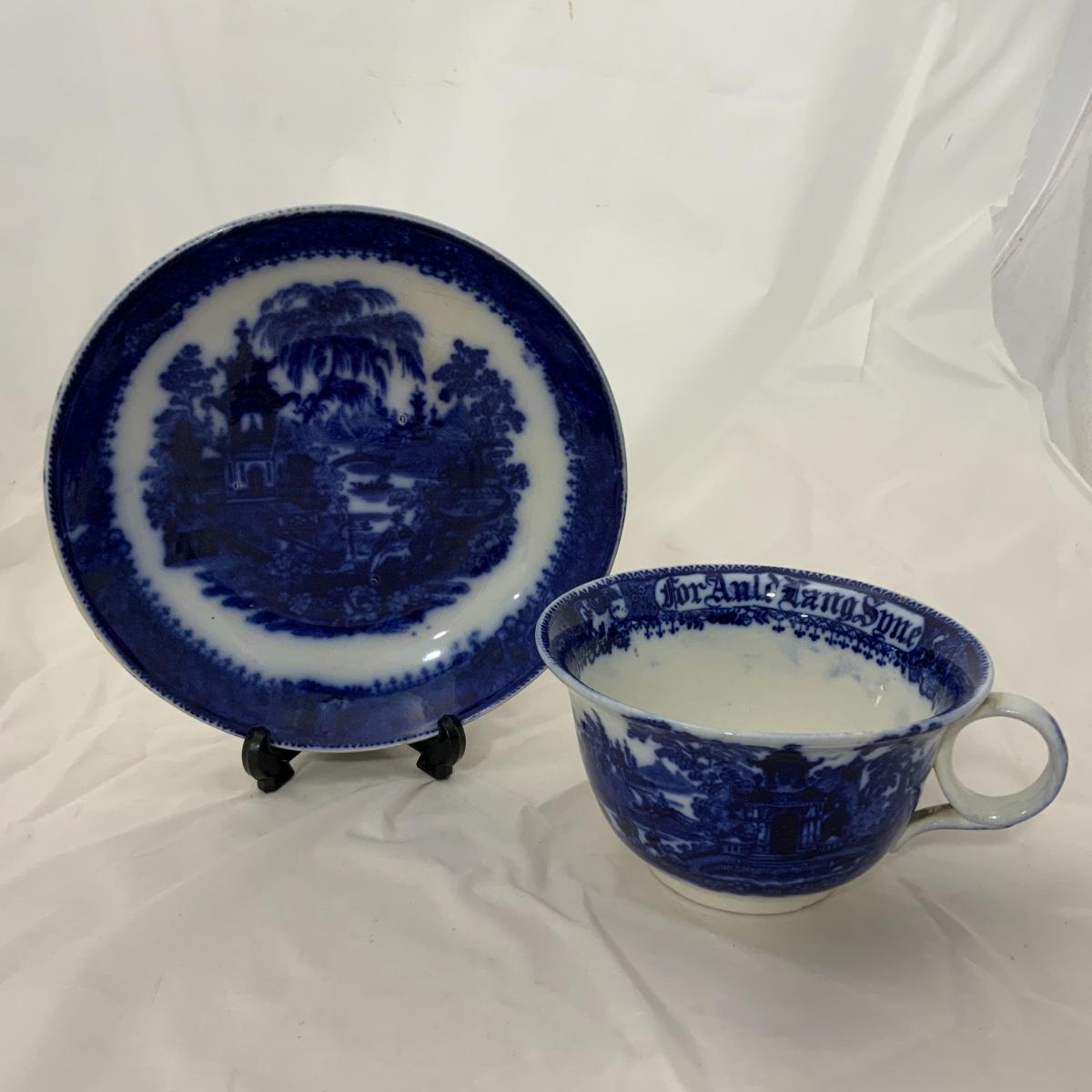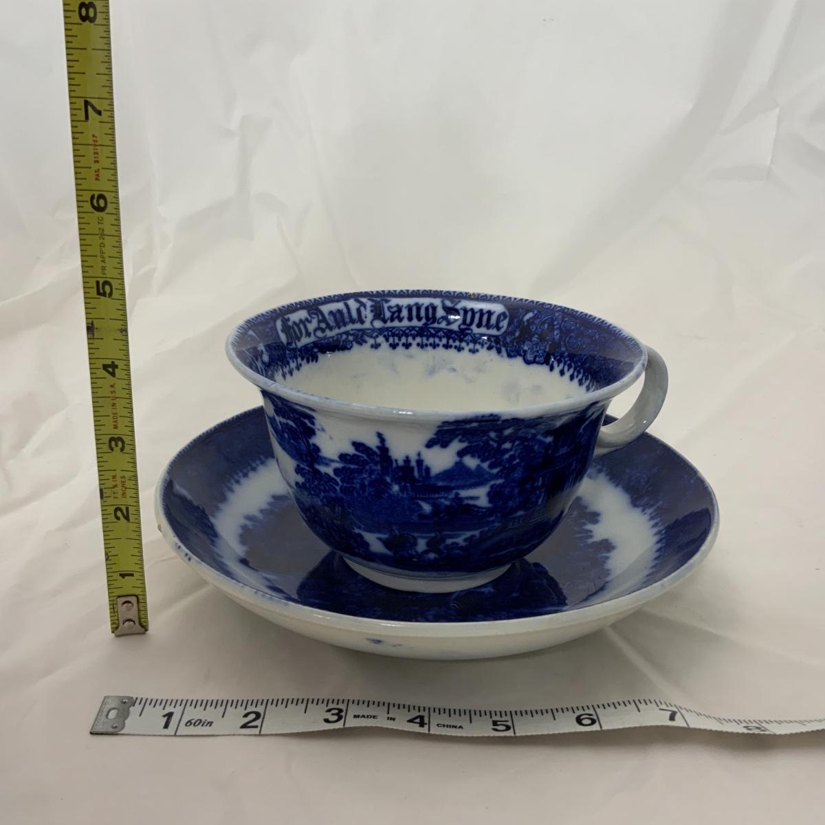 From the Estate of Peter Radovanovich: Oversized Cup and Saucer in the Flow Blue Colorway. Neither piece are marked with a maker. The cup has the words For Auld Lang Syne on the interior rim. There is a small chip that has been repaired on the cup on the reverse of the saying. If you are buying as a display piece, no one will ever know! Please see photos for details and condition. ::: Shipping is available on this lot. If you require shipping you must let us know at the close of the auction. We will coordinate with you after the item has been won. Shipping fees will include insurance up to or exceeding the value of all items being mailed. If you have any questions regarding this lot please contact the auctioneer either via this website, by direct email or by phone. PICK UP TIMES and other important information can be found in the TERMS and DESCRIPTION of the auction. Please take a look for pertinent information. Thanks!