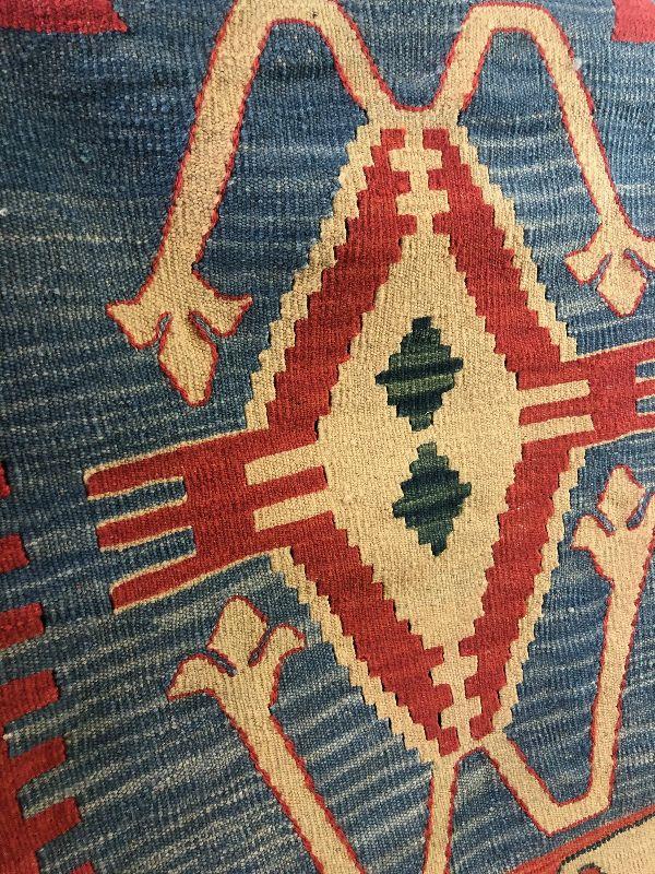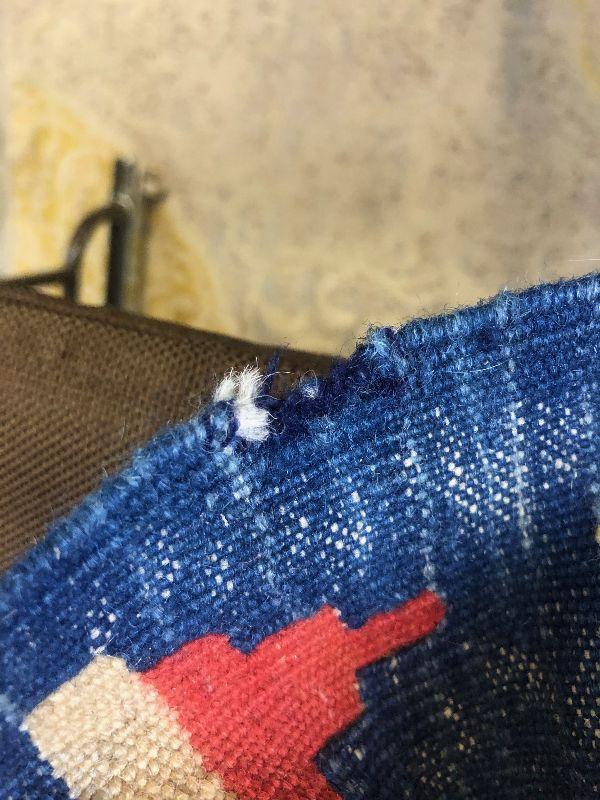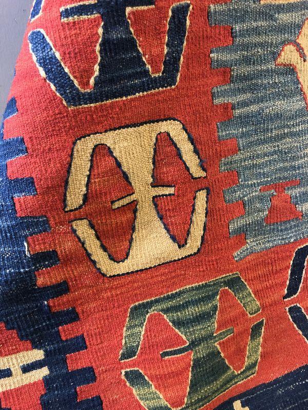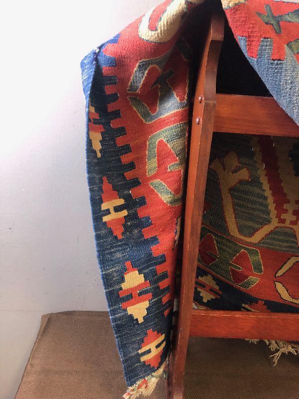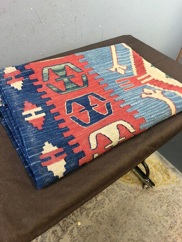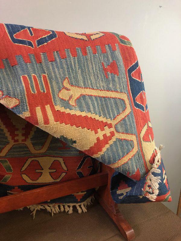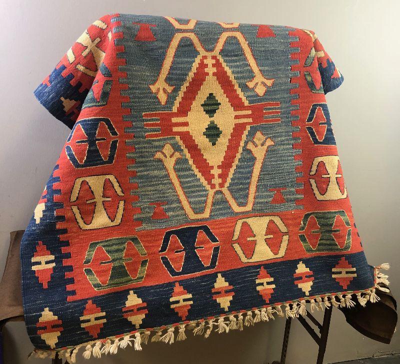 Red, Tan and Blue Tribal - Moroccan or Algerian (educated guess) All wool! Good Condition a could of spots of wear. A Couple of fringe areas missing fringe. 48 x 68