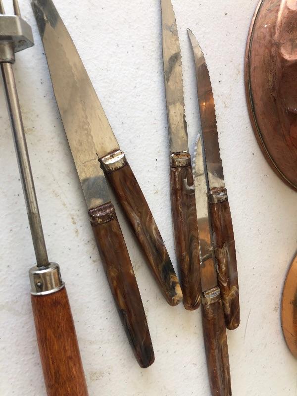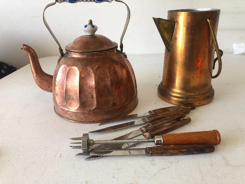 Tea pot, water pitcher, steak knives and kitchen tool retro used condition. This is an ONSITE Auction all items will need to be picked up on location. Please see auction description for pick up procedures.