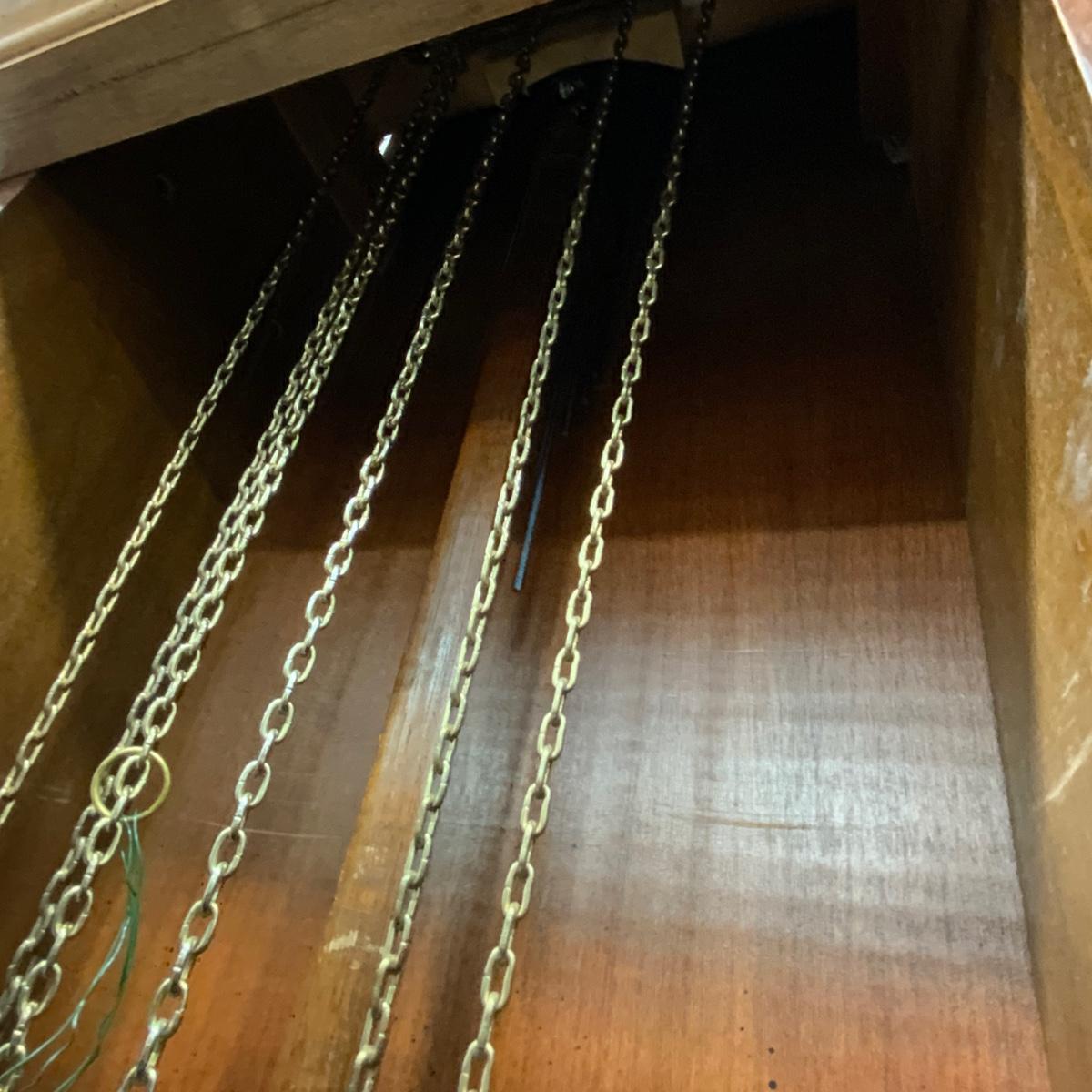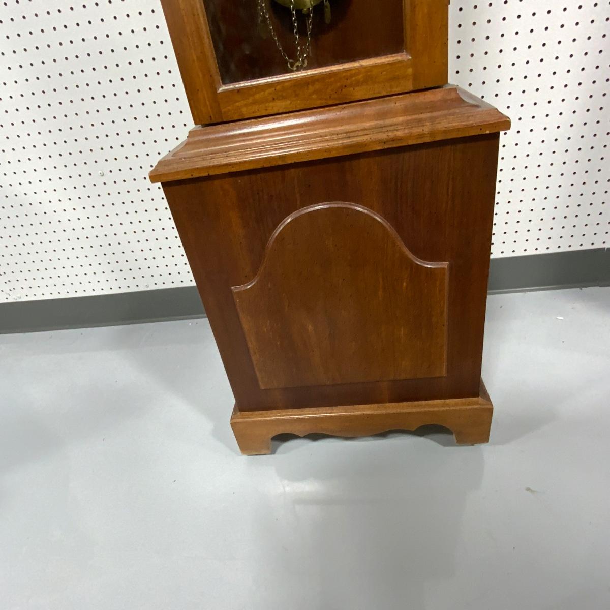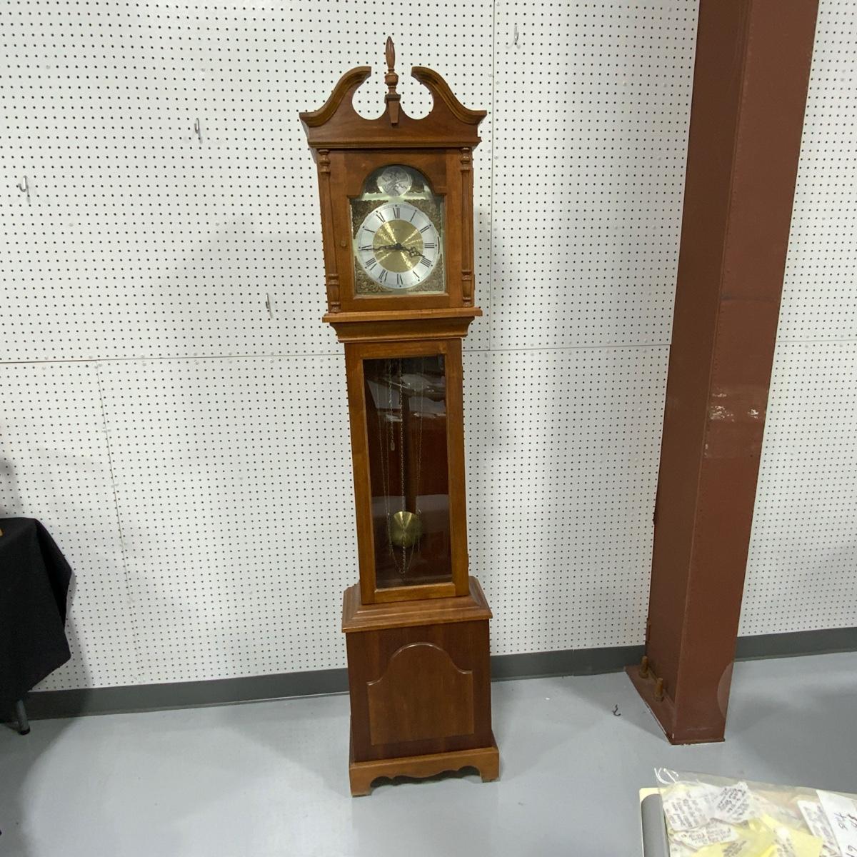 Vintage Ridgeway Grandfather Clock. Weight - Driven. Original Pendulum and weights included. Please see photos for details and condition. ::: Shipping is NOT available on this lot. If you have any questions regarding this lot please contact the auctioneer either via this website, by direct email or by phone. PICK UP TIMES and other important information can be found in the TERMS and DESCRIPTION of the auction. Please take a look for pertinent information. Thanks!