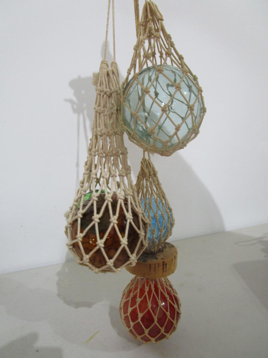 goblet 8" high x 3" around, bowl 8" around x 2.5" high, glass balls in netting is 21"