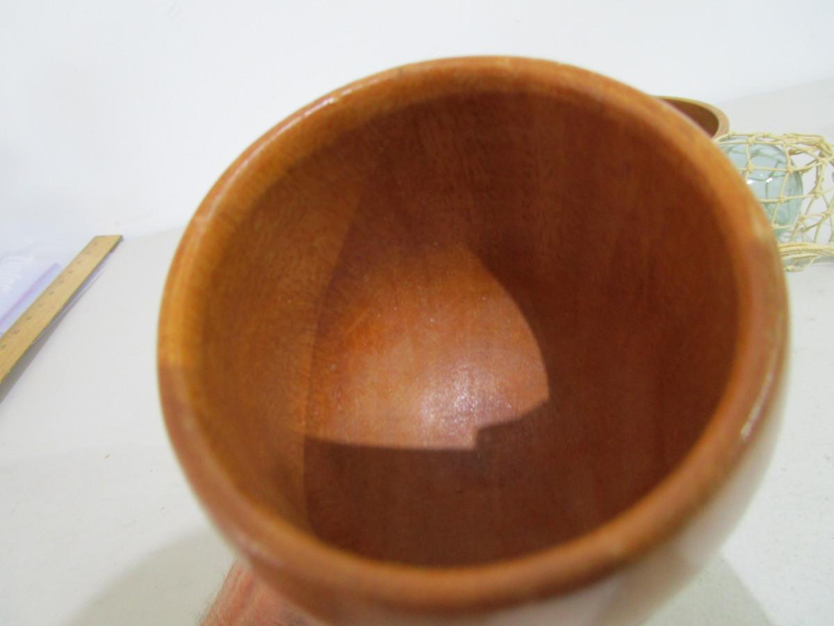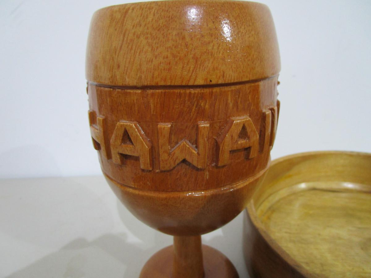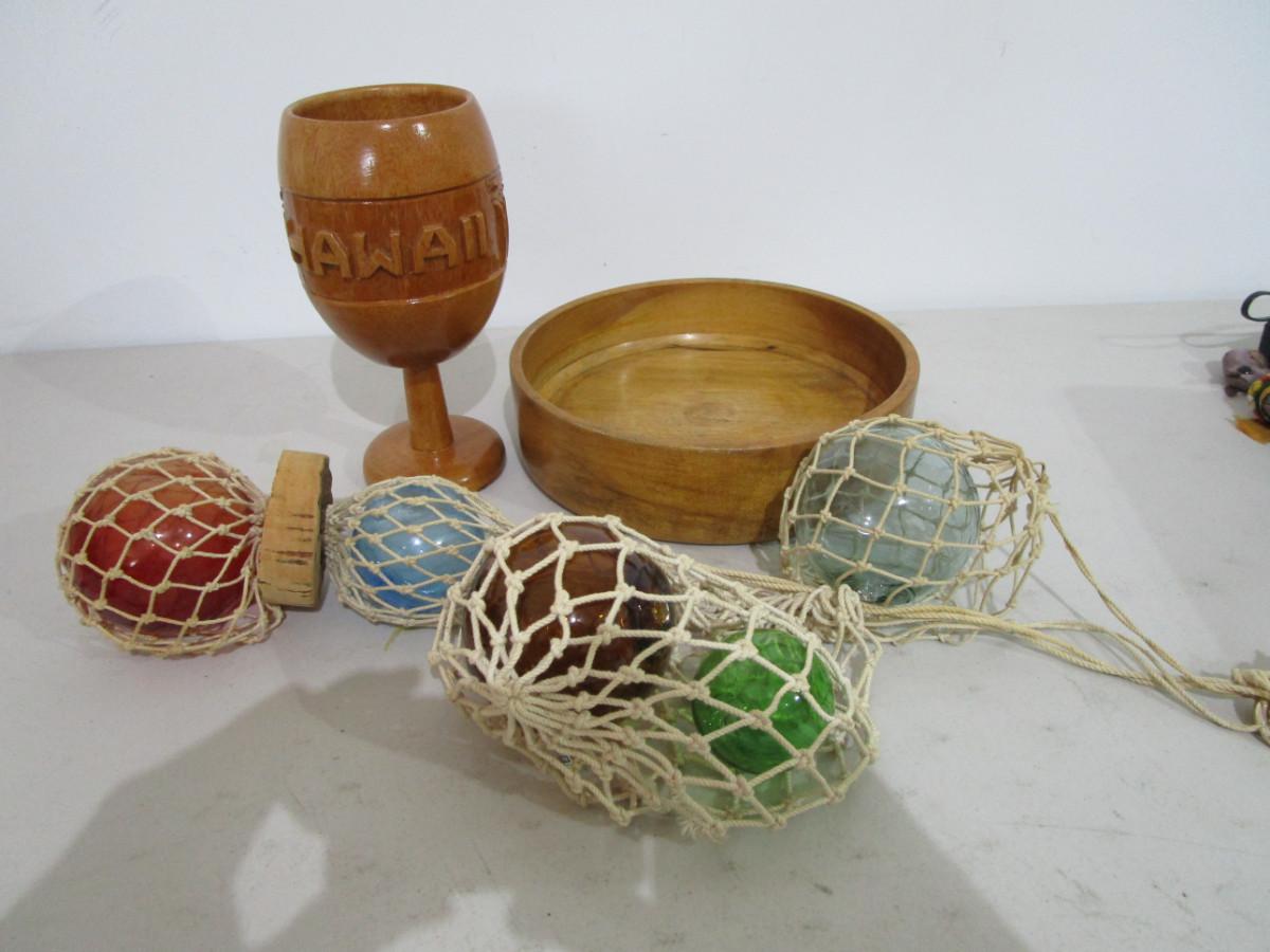 #98 Wooden Hawaii goblet, wooden bowl, decorative glass balls in netting