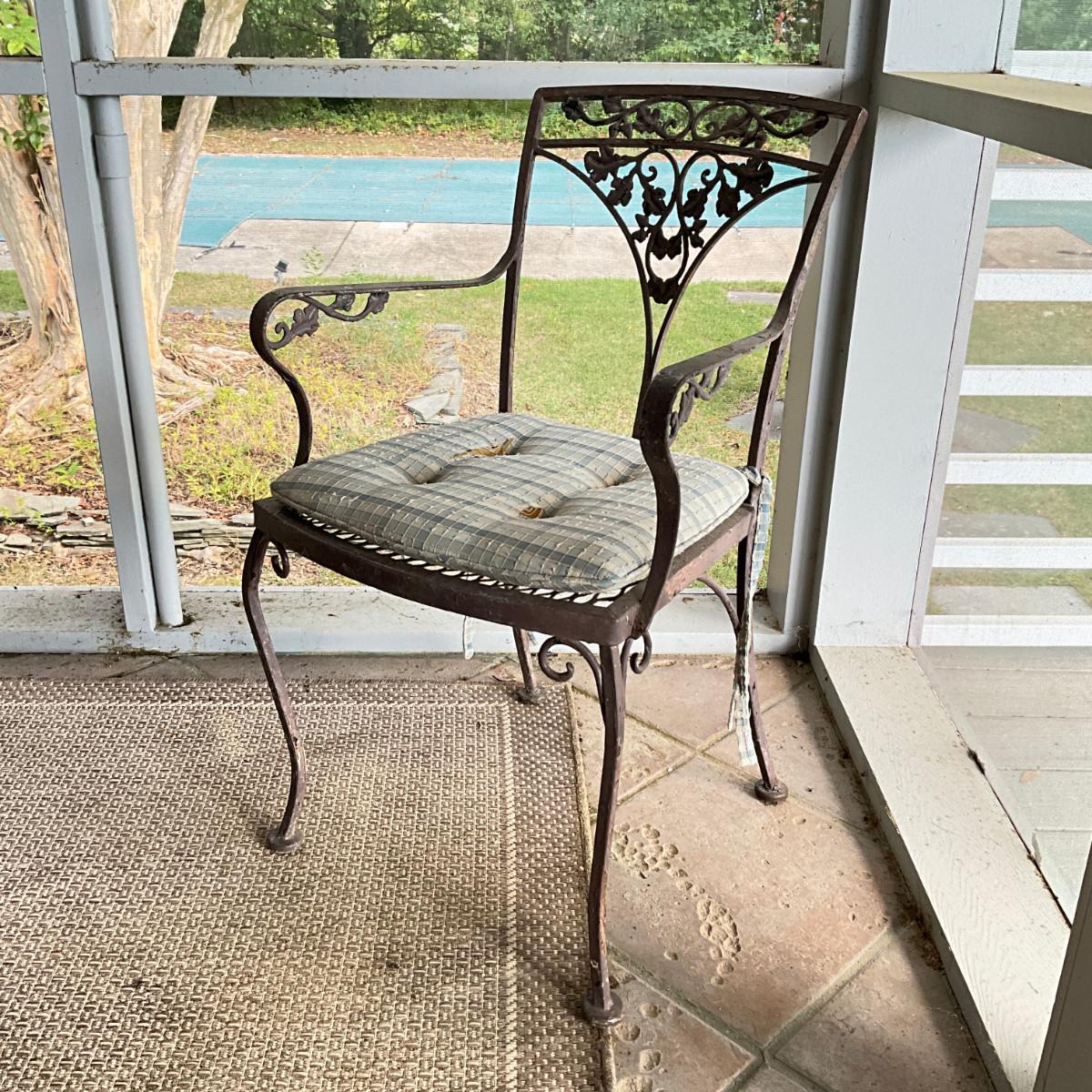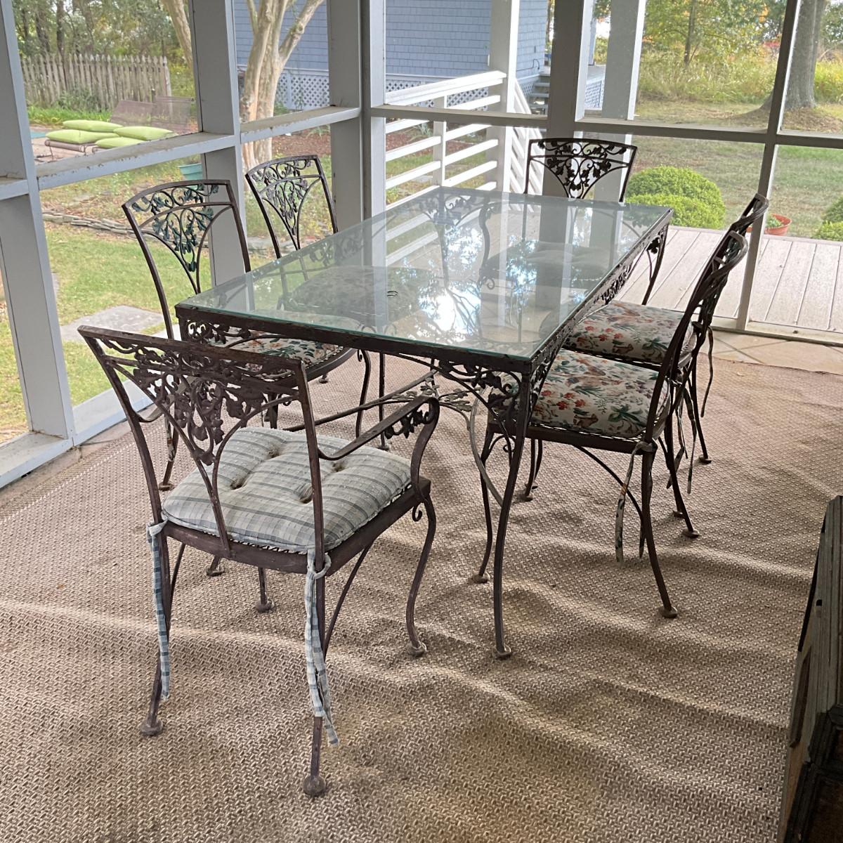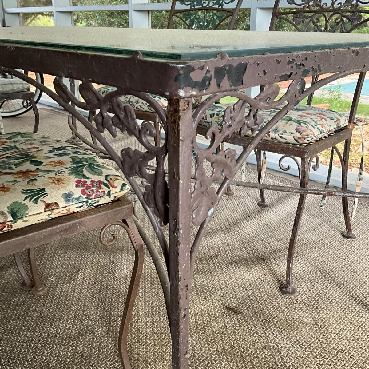 981 Vintage Woodard Glass Top Wrought Iron Outdoor Patio Table With 6 Matching Chairs