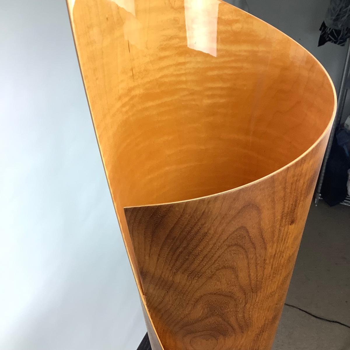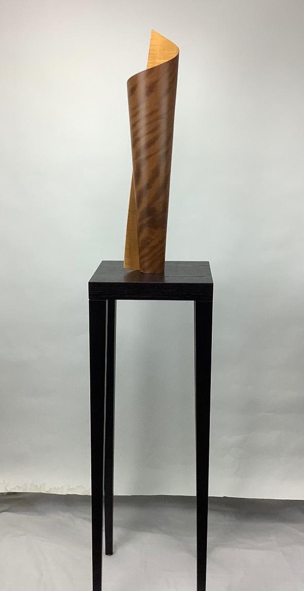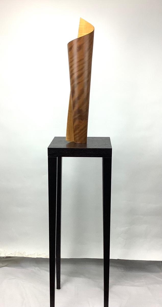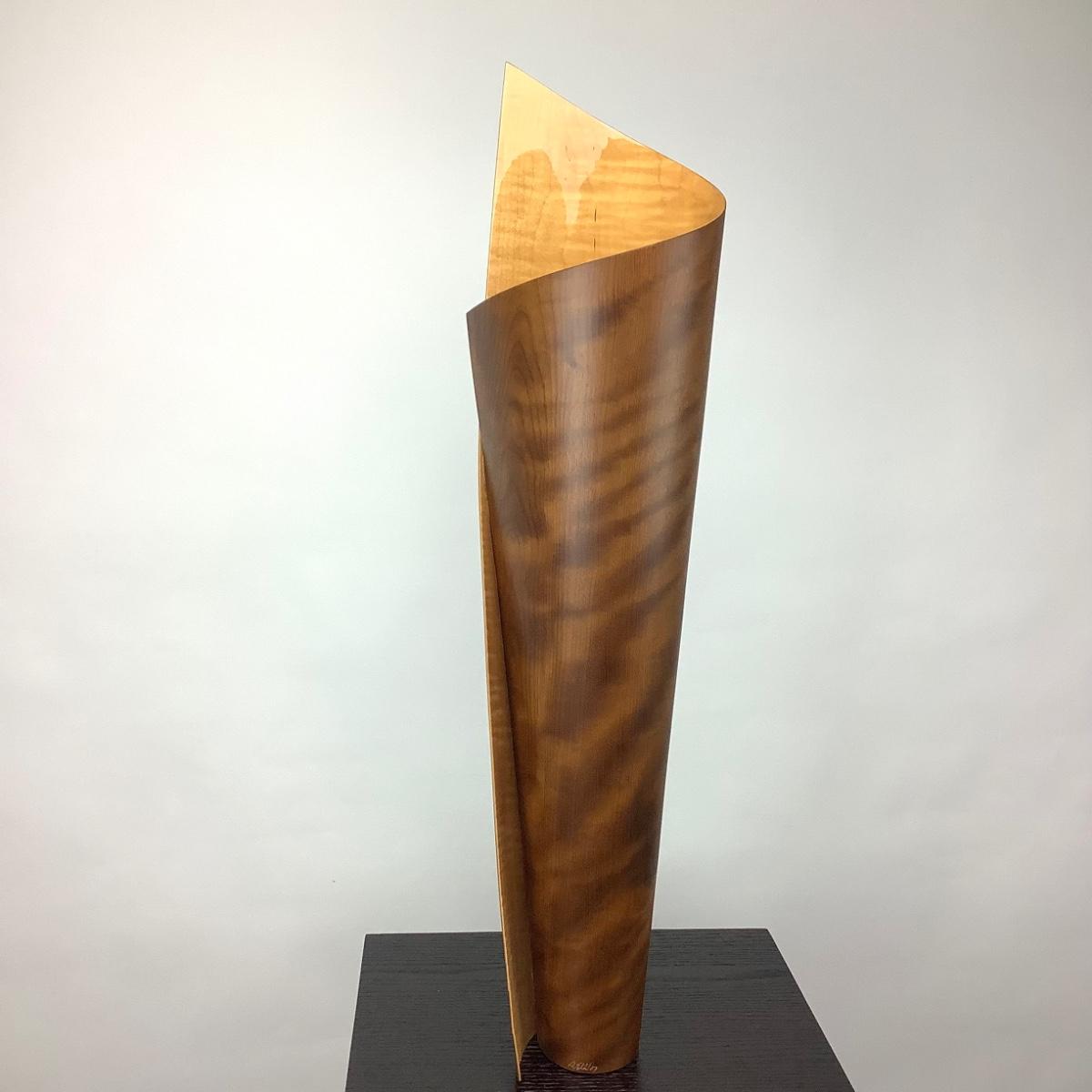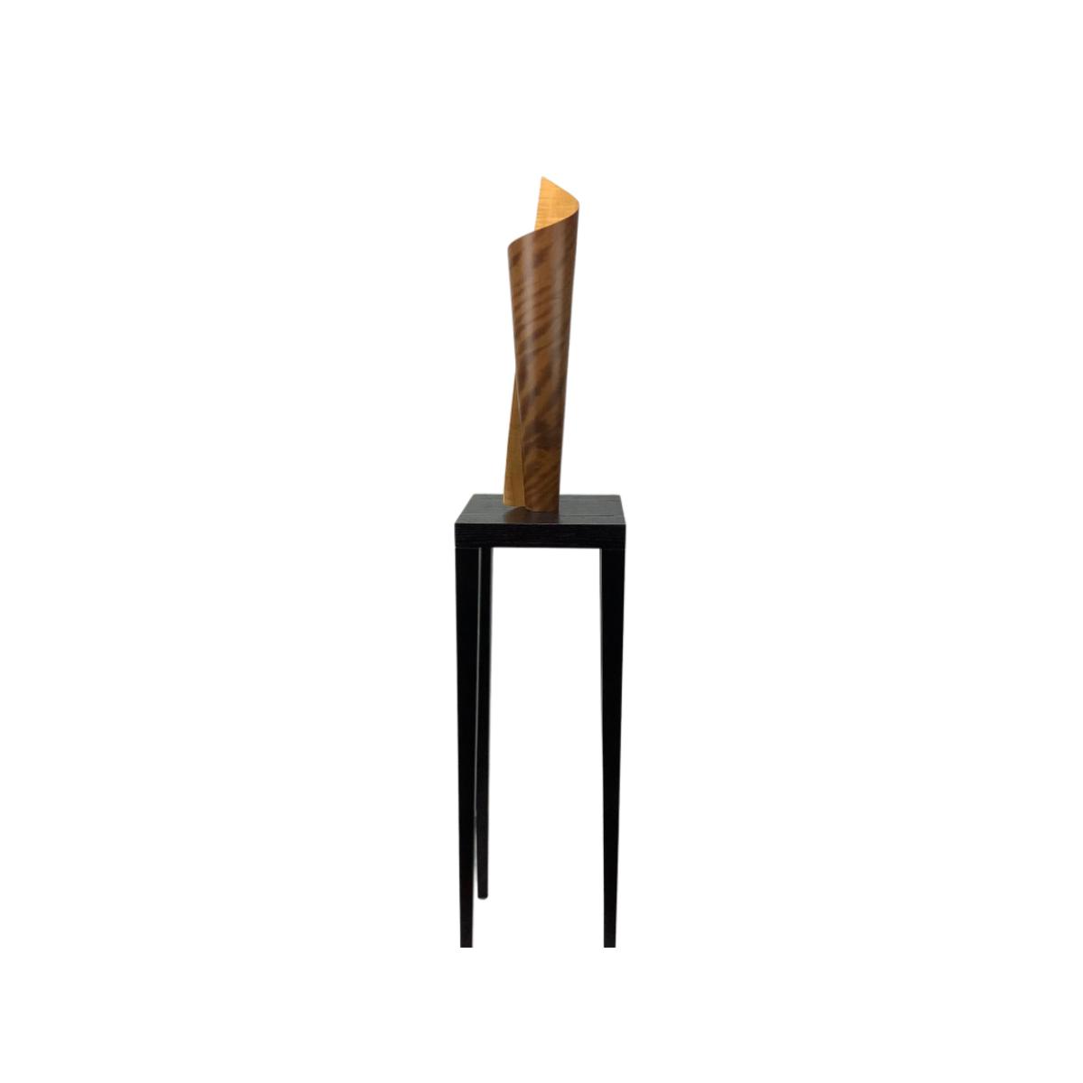 The Vase attached to the black stand, the overall height is 70" and the width is 14". The curled wooden vase is signed by the artist and there is a tiny hairline crack on the inside of the very bottom. The vase evolved from a form series Schleeh has been exploring for over 25 years. The objects he creates resonates the wonder he feels working with the fantastic material-beeswing and maple wood. The vase ca be used for live flowers just be sure to wipe the exterior of the wooden vase from any moisture.