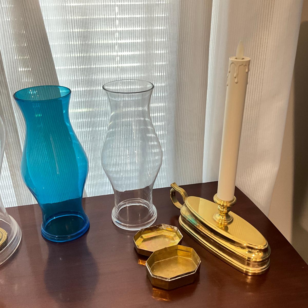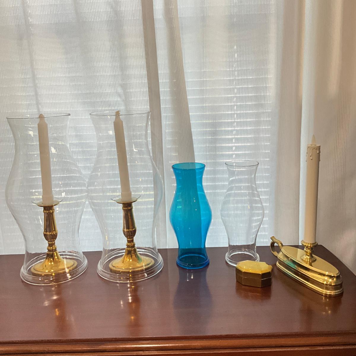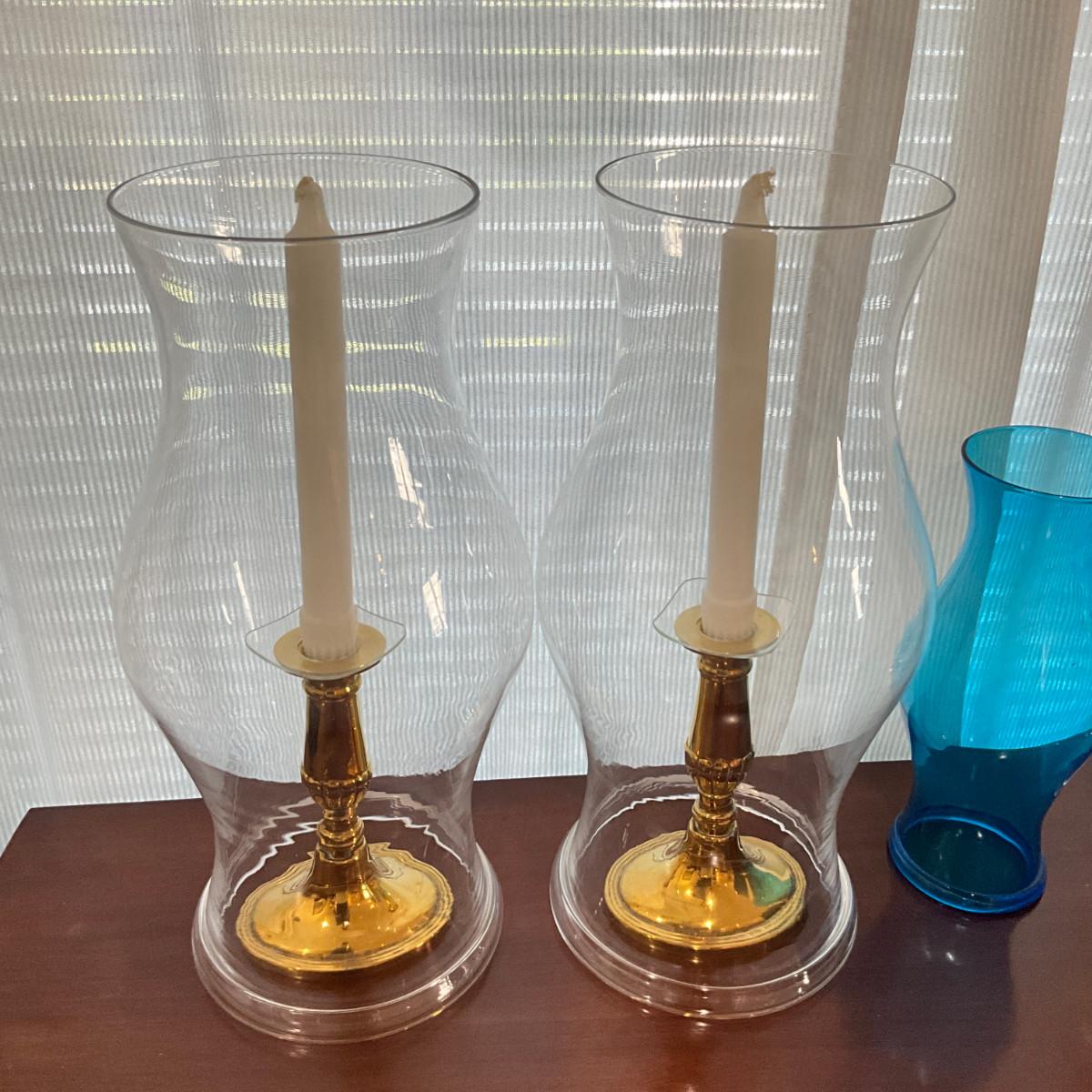 983 Pair of Brass Candlesticks with Glass Hurricane Shades With Two Smaller Hurricane Shades & Battery Operated Candle Lamp