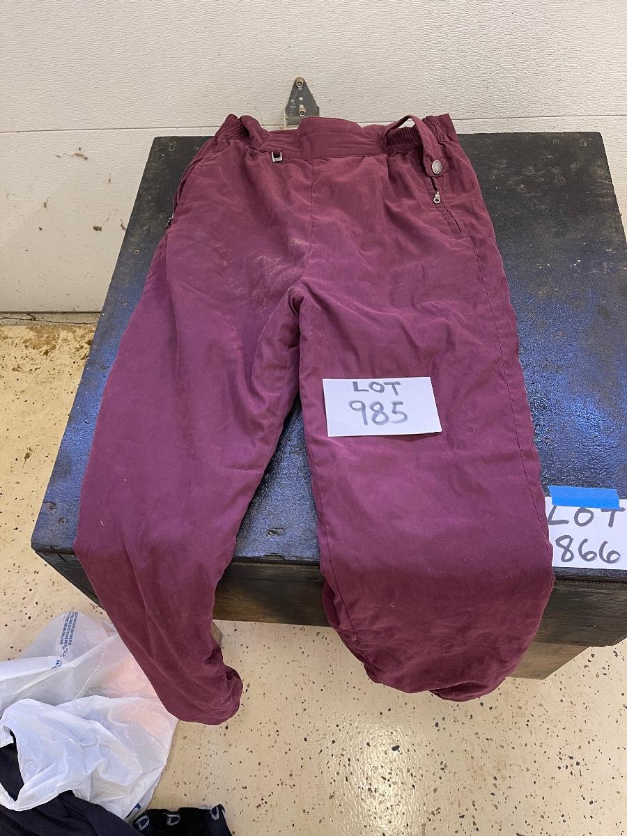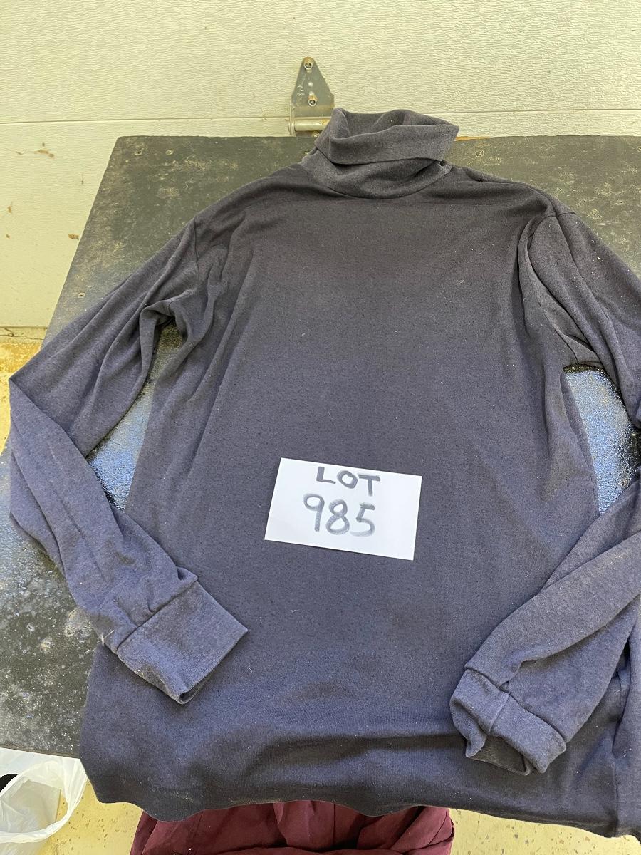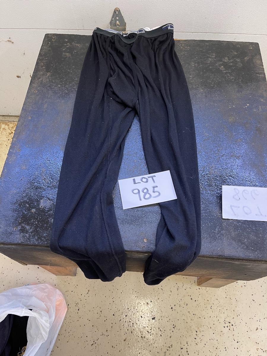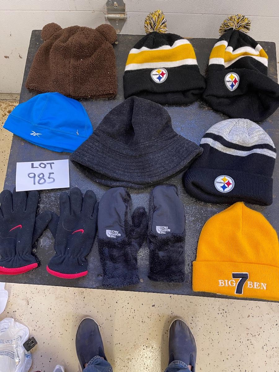 (1) Large turtle neck sweater-size L, (1) med size pair insulated winter pants, (1) thermal long johns, (4) Pittsburgh Steelers winter knitted beanies, (2) pairs of gloves, (3) misc beanies, IPhones lighting charging cords and plugs.