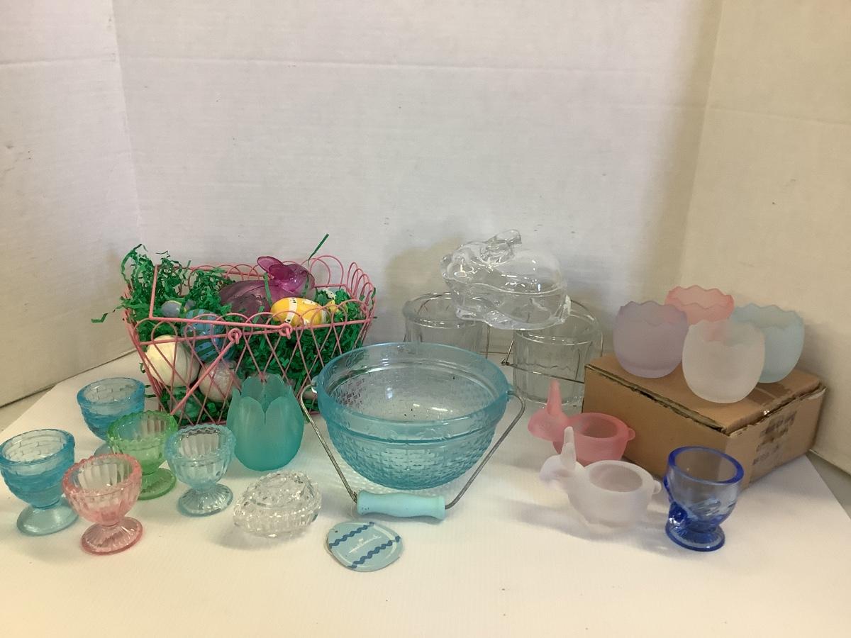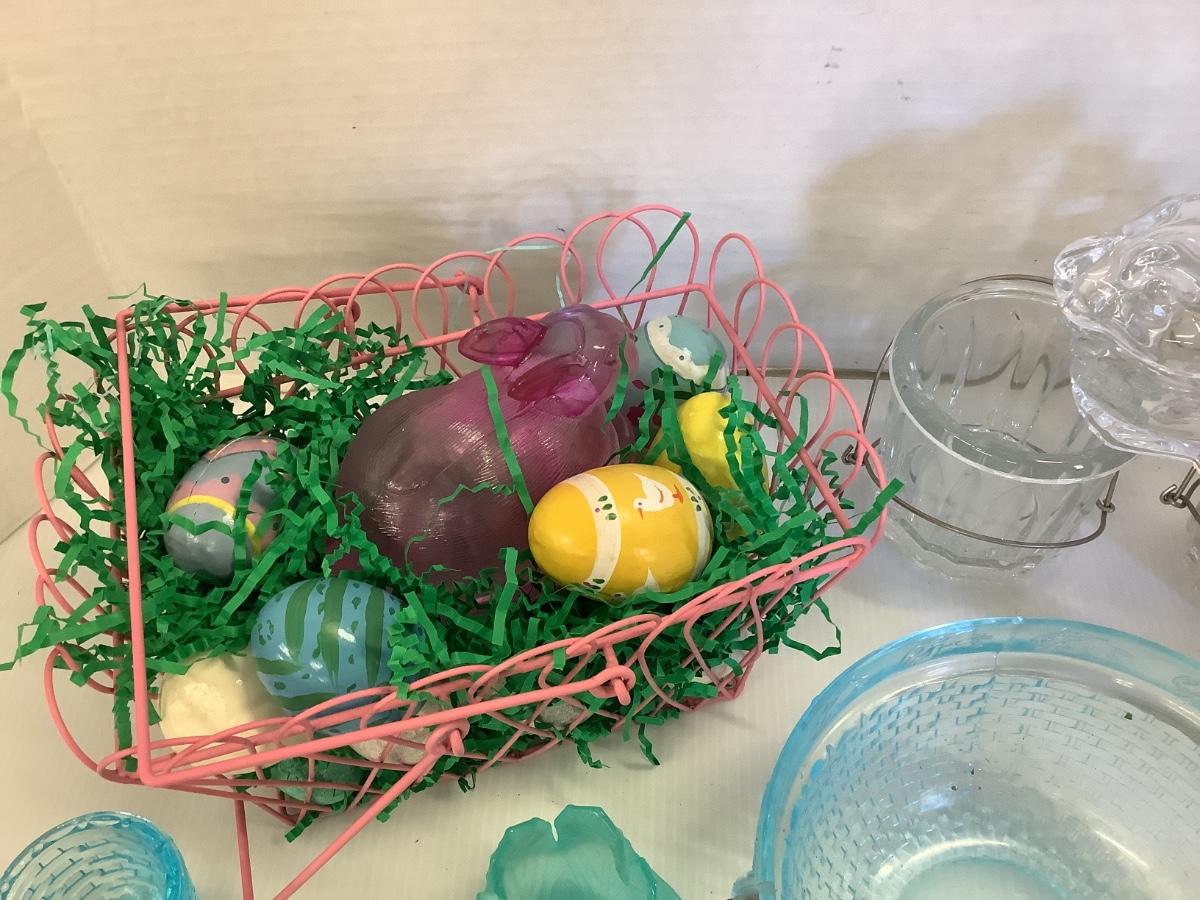 Set of four frosted colored egg shaped votives, set of 5 glass egg cups , glass covered bunny and egg dish, wire basket ith wooden eggs and covered pink bunny dish
