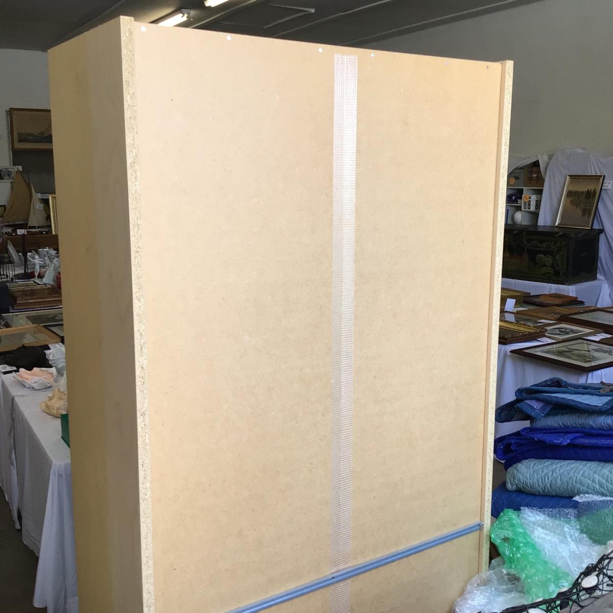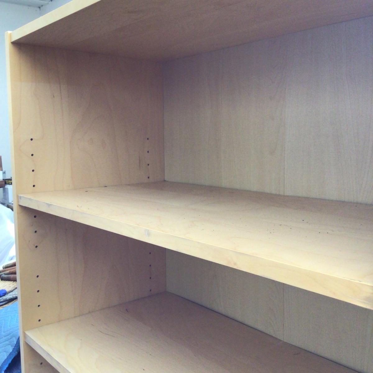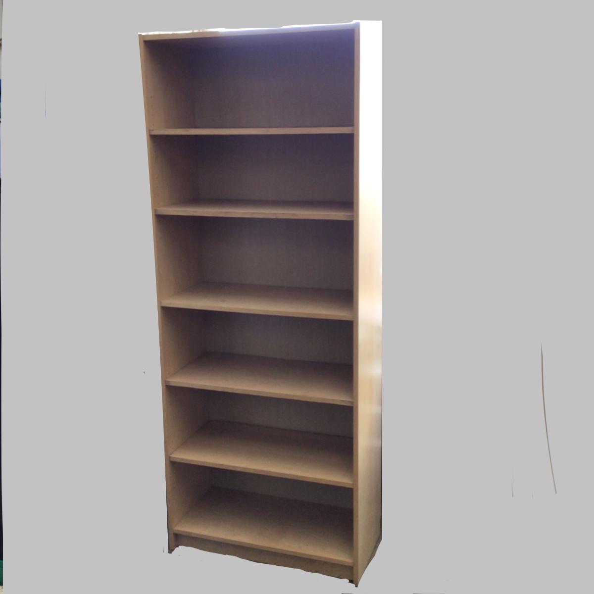 6 Tier Pressed Wood Light Pine Laminate Shelving Unit. Shelves are adjustable. The interior and exterior sides do babe some sun bleaching. See pics for details.