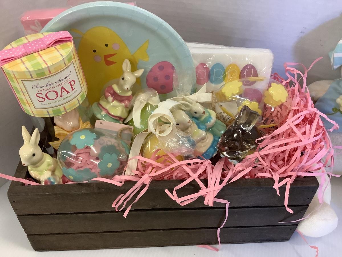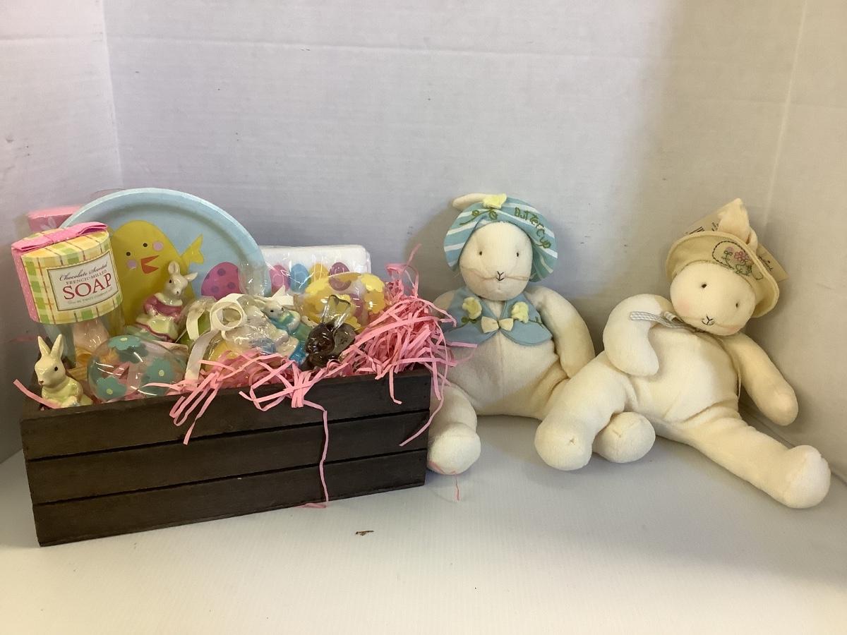 2 hallmark bunnies with easter crate filled with french soap and decorative easter eggs