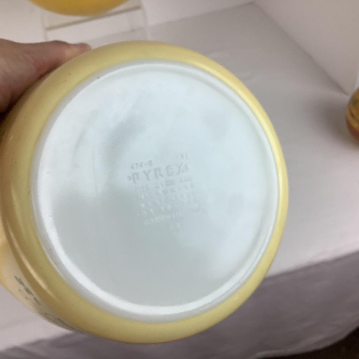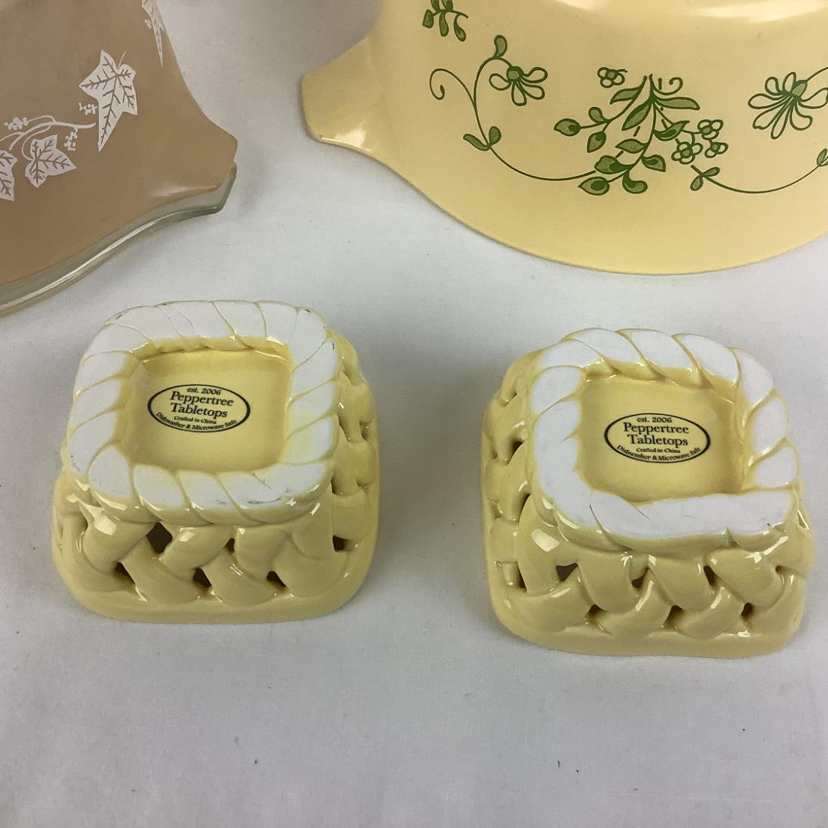 Creamer, 2 woven dishes, pyrex bowls , 1- with lid , measuring 11" diameter , 9,5" diameter, 8" diameter