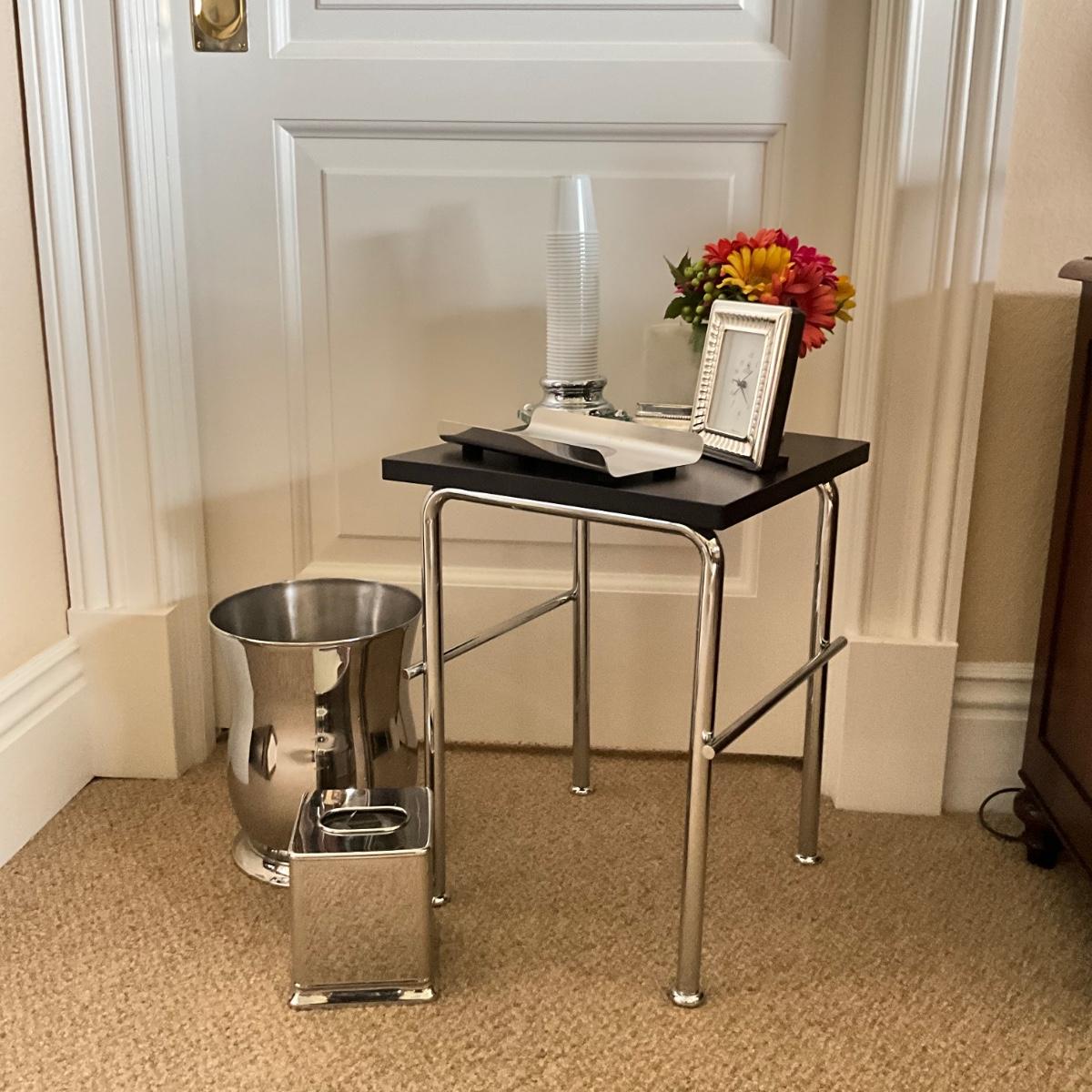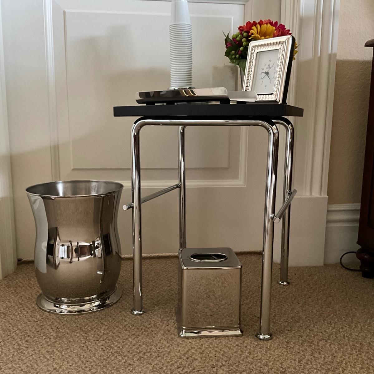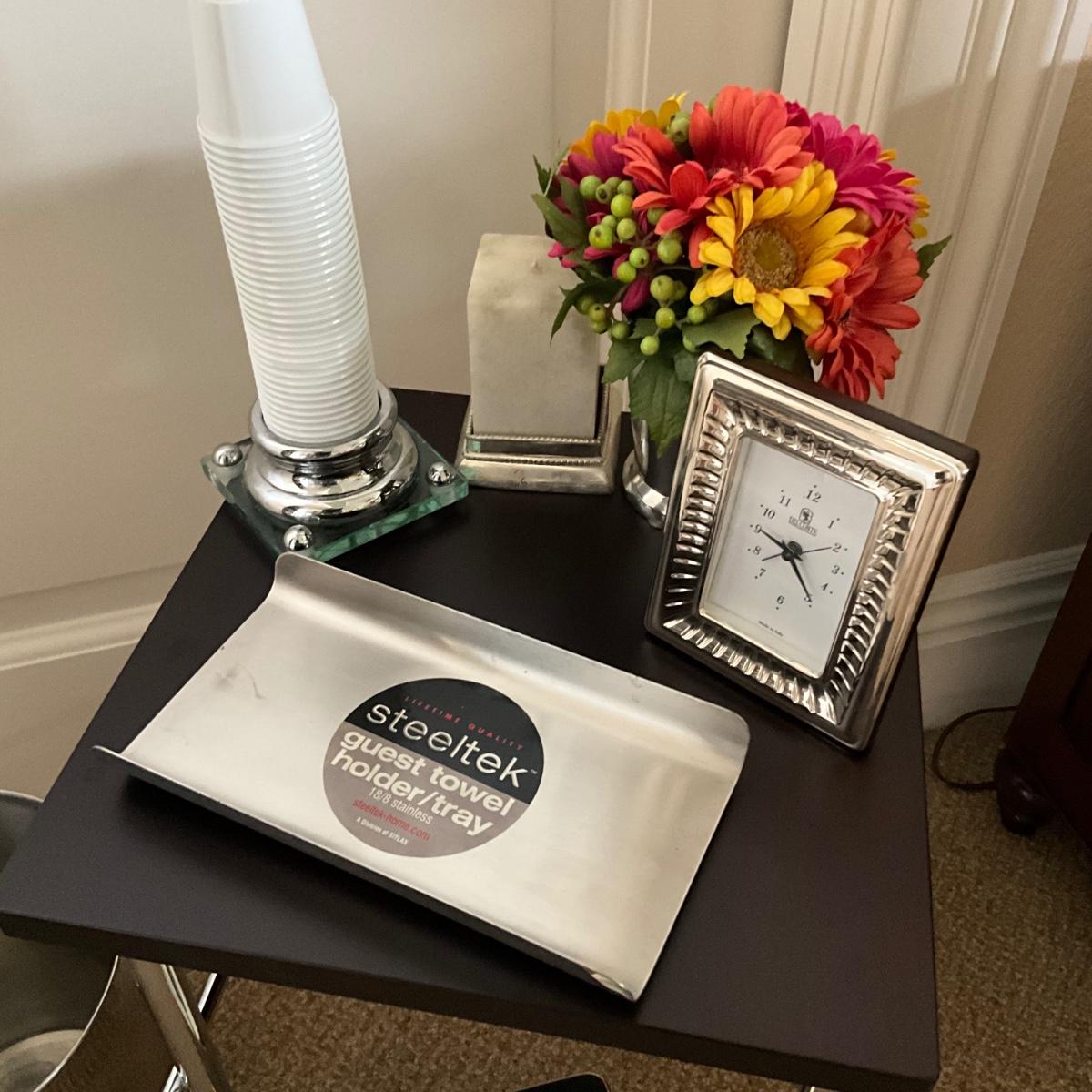 Small table with clock , cup holder, flower vase, waste can, tissue holder and decorative candle