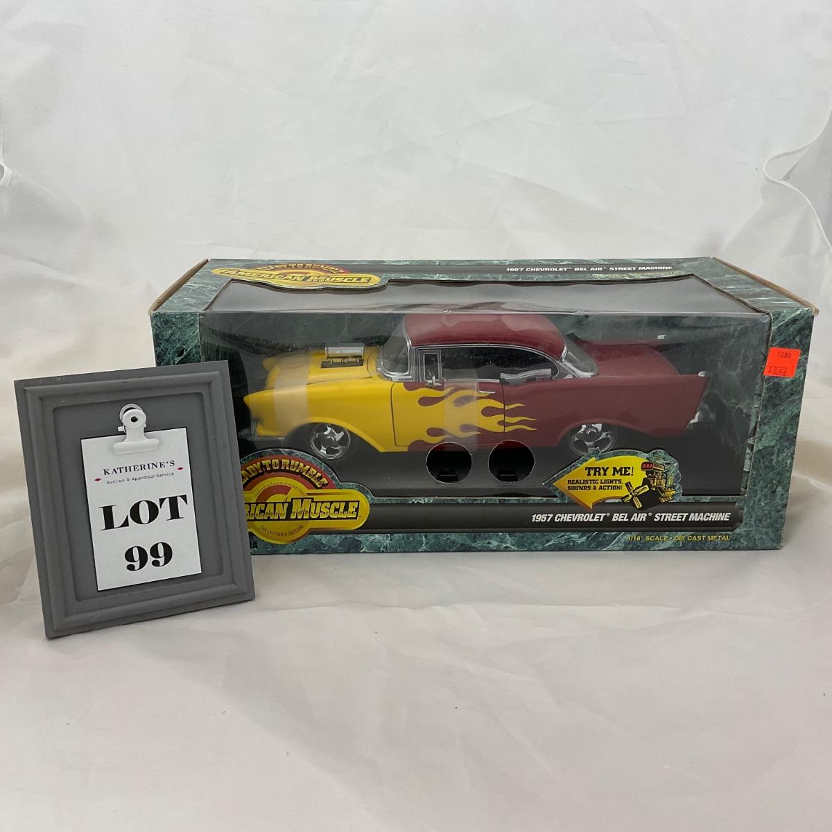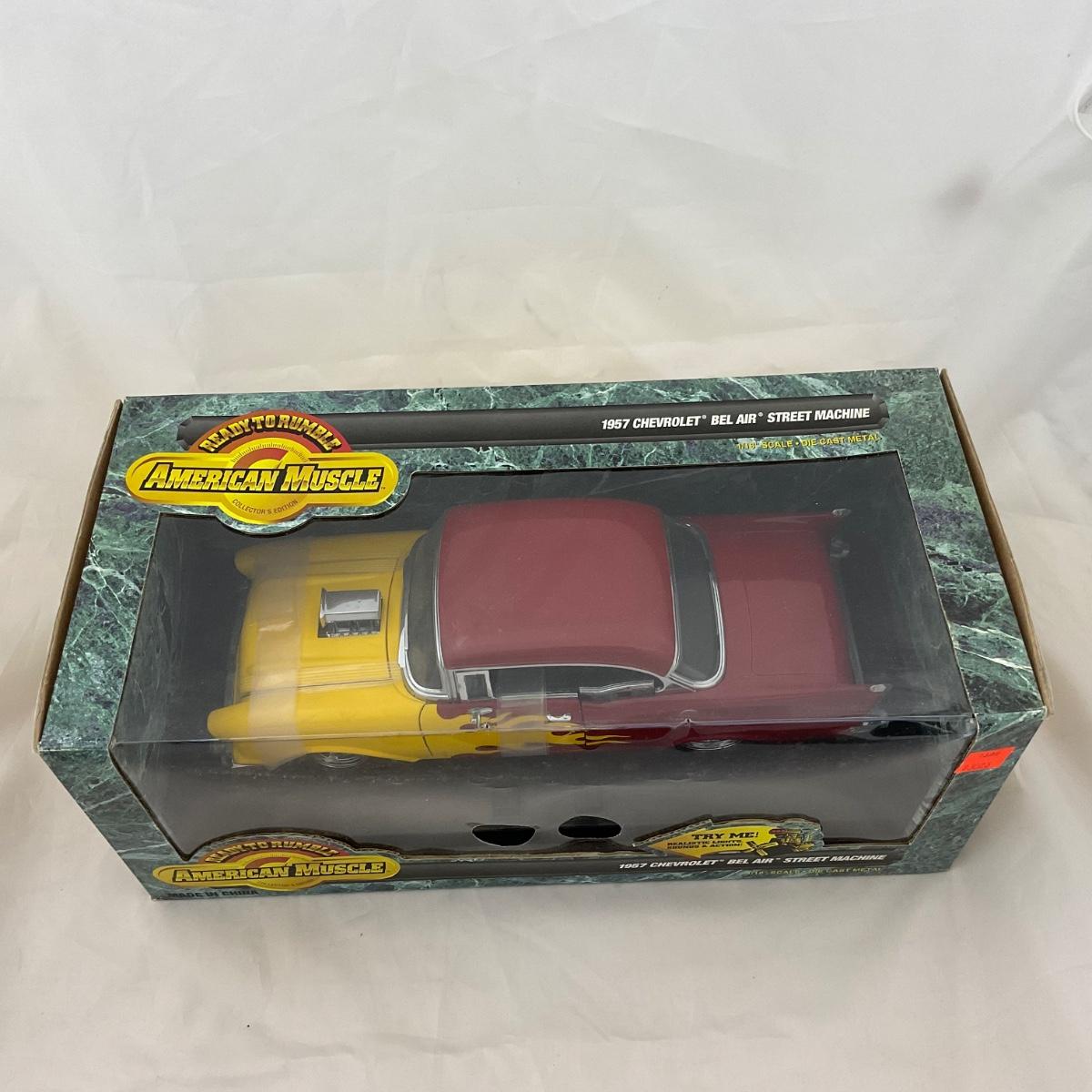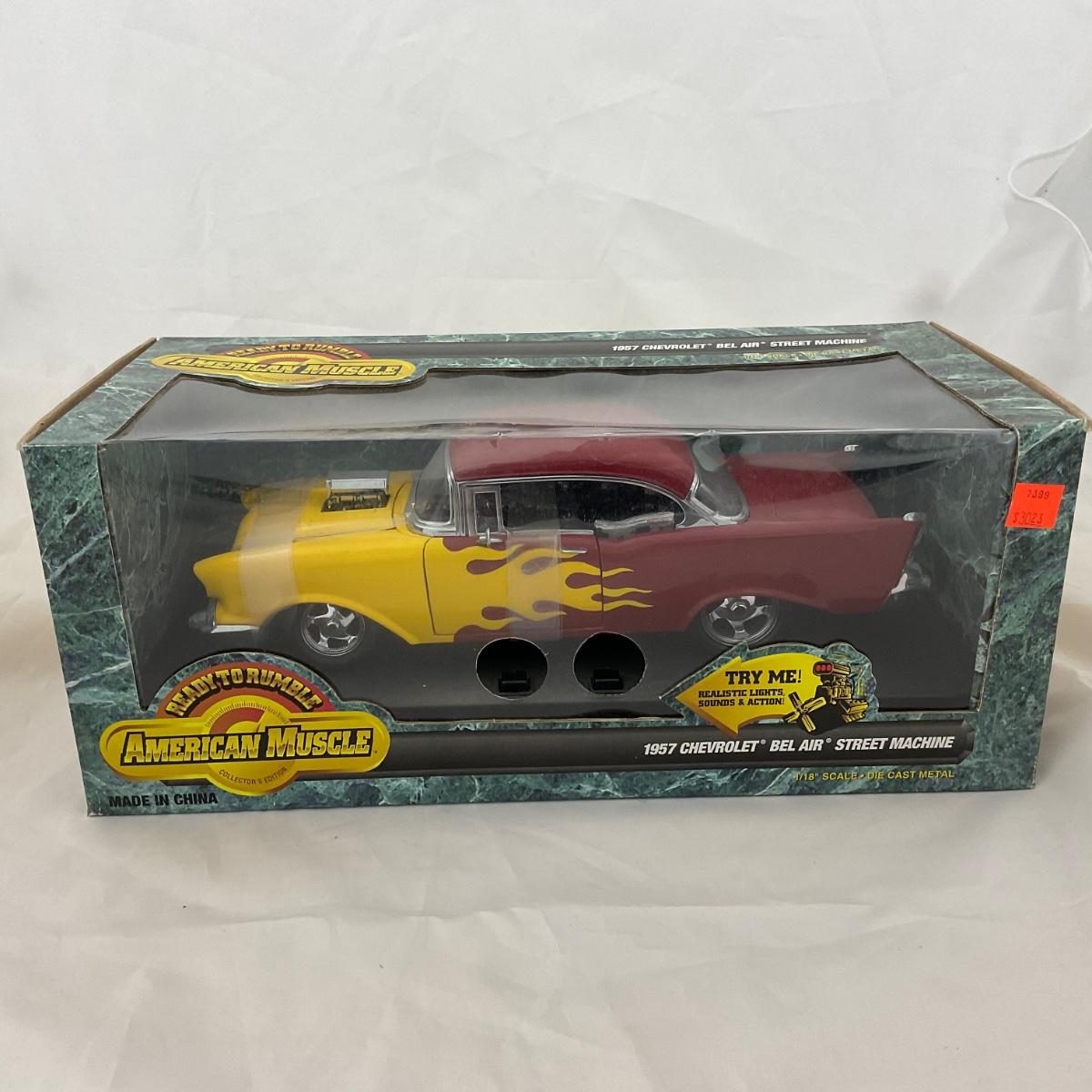 One die cast 1:18 scale 1957 Chevrolet Bel Air Street Machine in box. Please see photos for details and condition. ::: Shipping is available on this lot. If you require shipping you must let us know at the close of the auction. We will coordinate with you after the item has been won. Shipping fees will include insurance up to or exceeding the value of all items being mailed. If you have any questions regarding this lot please contact the auctioneer either via this website, by direct email or by phone. PICK UP TIMES and other important information can be found in the TERMS and DESCRIPTION of the auction. Please take a look for pertinent information. Thanks!