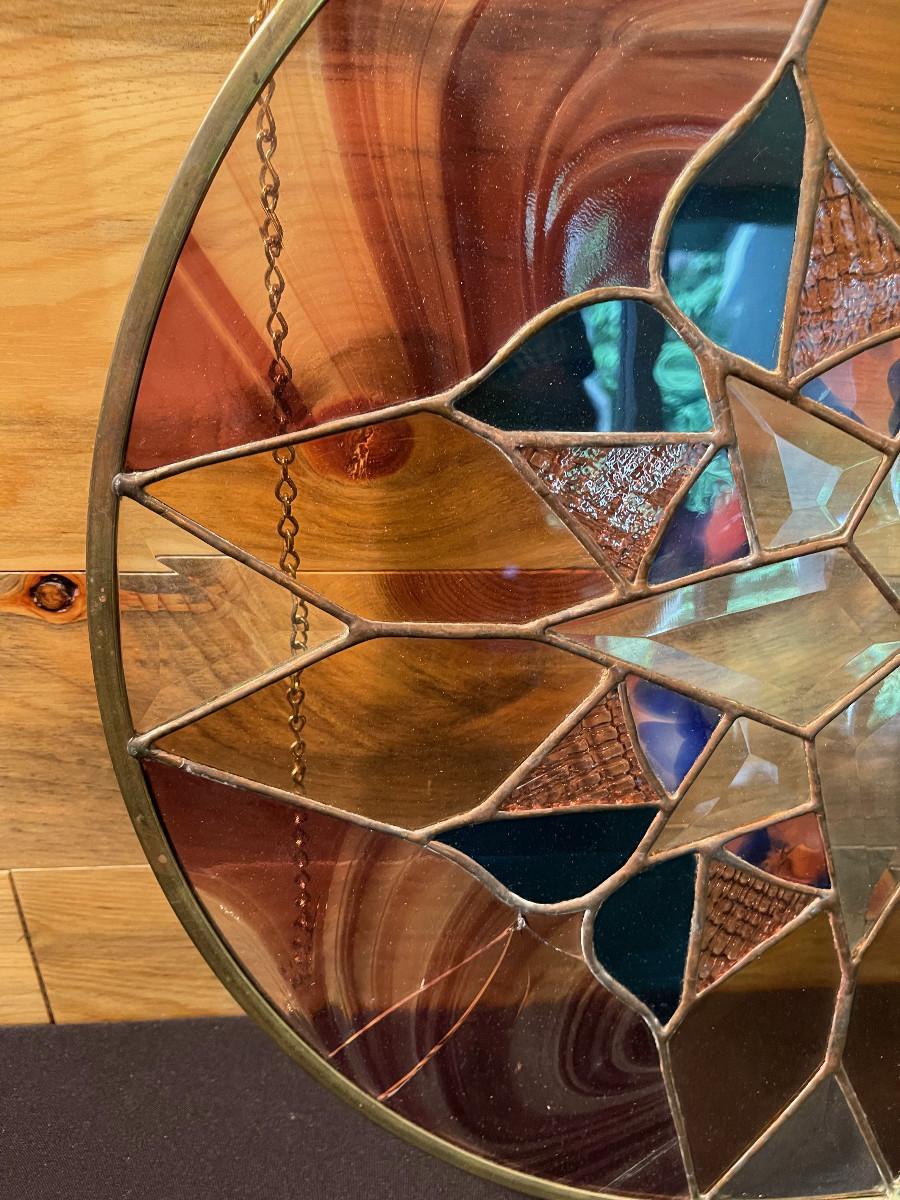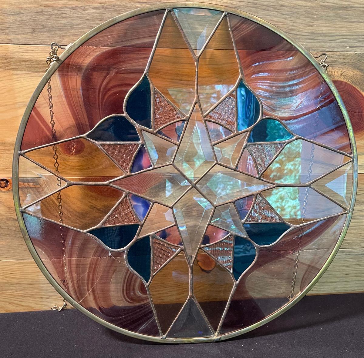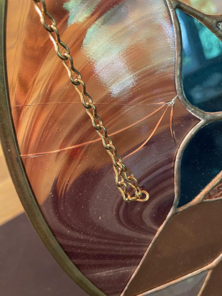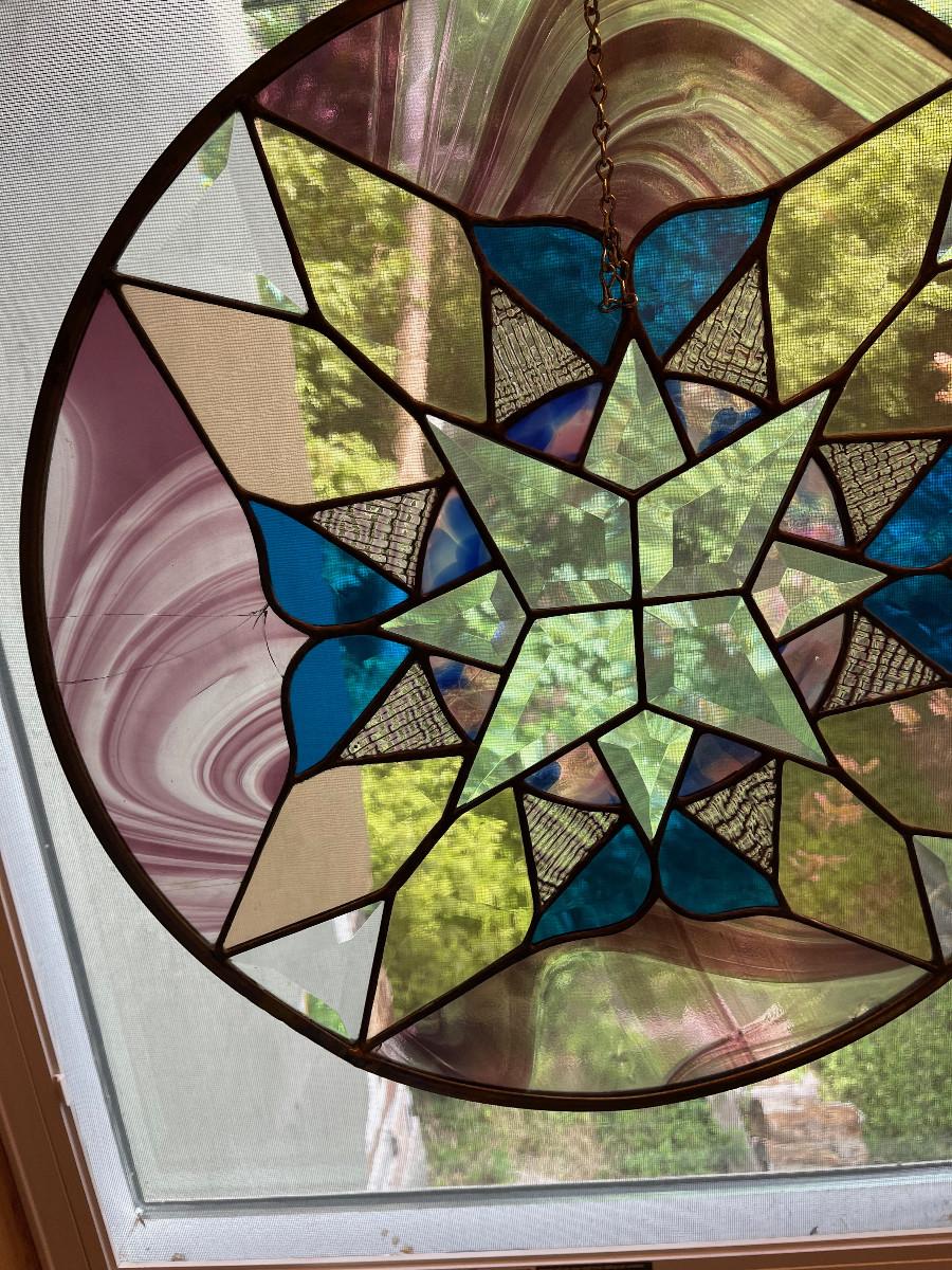 1 panel has a crack in it. Purple and Blue Glass. Hand Made.
