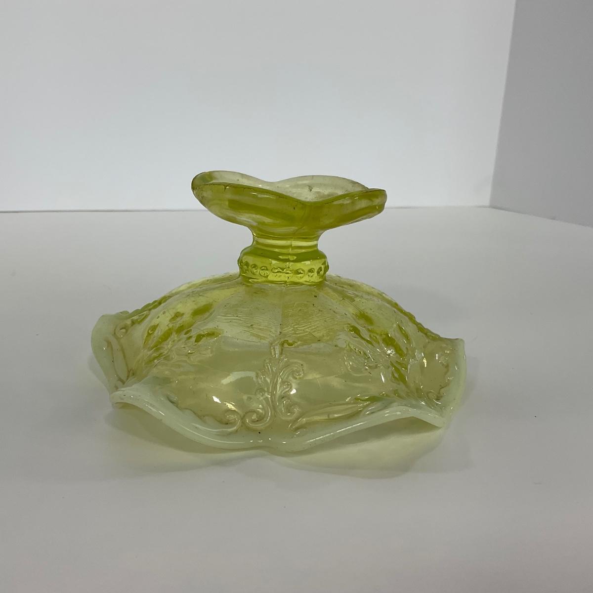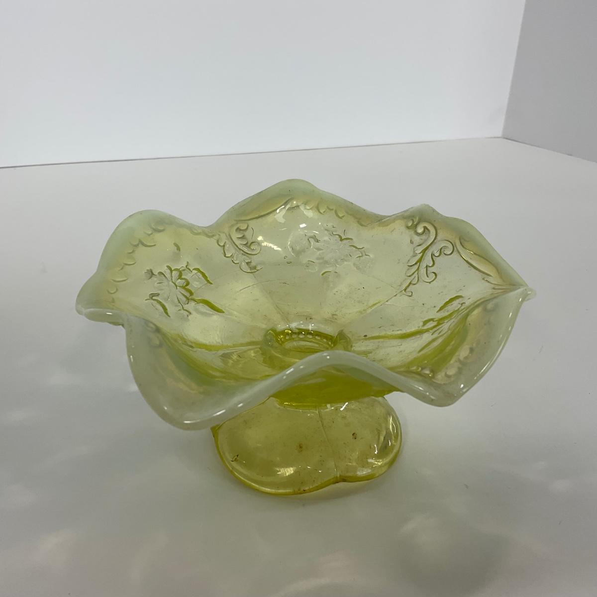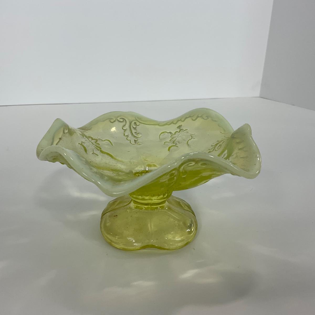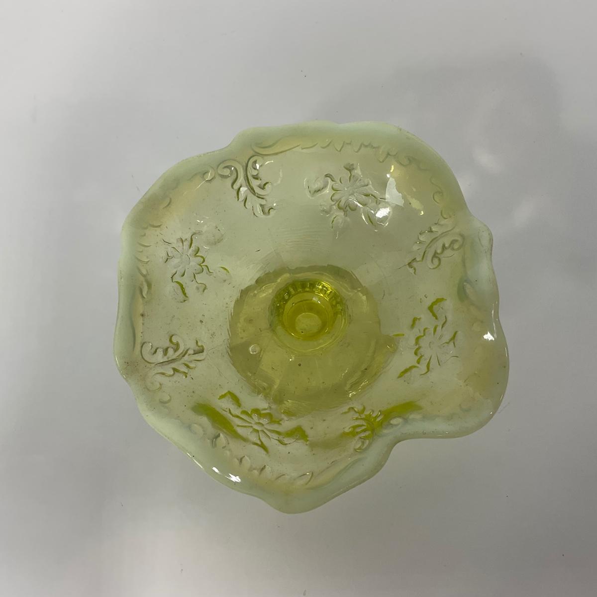One intricate opalescent vaseline short compote. I am Uranium glass so I DO GLOW under blacklight. Please see photos for details and condition. ::: Shipping is available on this lot. If you require shipping you must let us know at the close of the auction. We will coordinate with you after the item has been won. Shipping fees will include insurance up to or exceeding the value of all items being mailed. If you have any questions regarding this lot please contact the auctioneer either via this website, by direct email or by phone. PICK UP TIMES and other important information can be found in the TERMS and DESCRIPTION of the auction. Please take a look for pertinent information. Thanks!