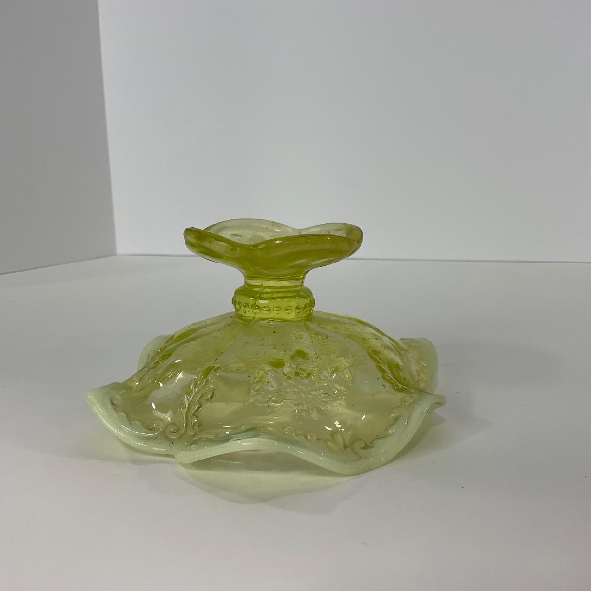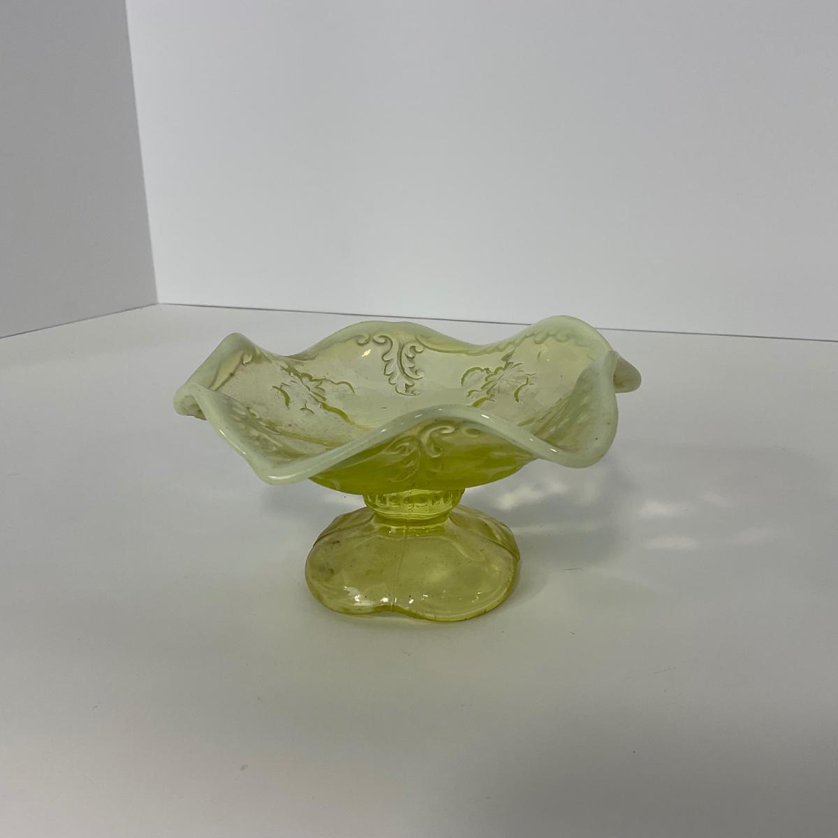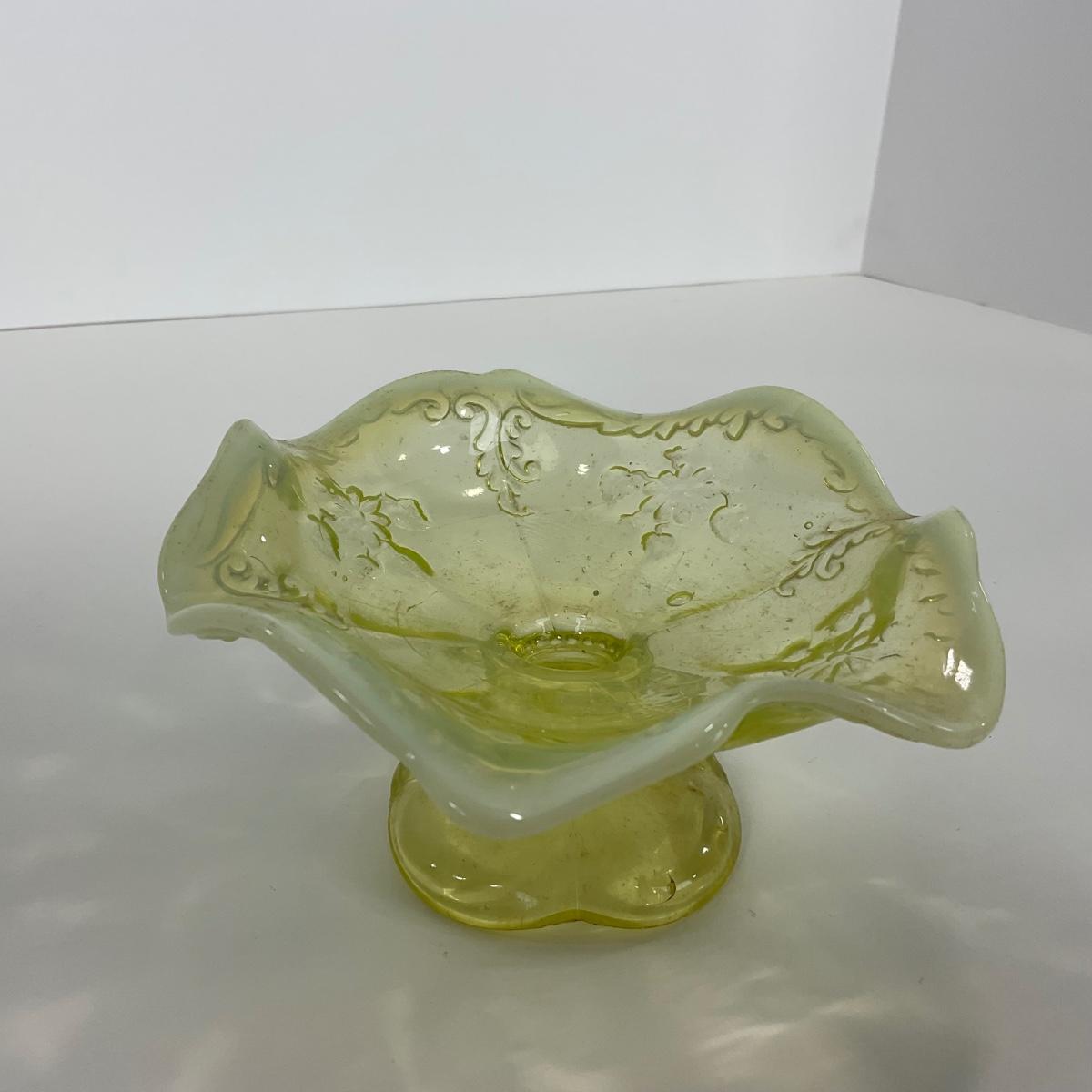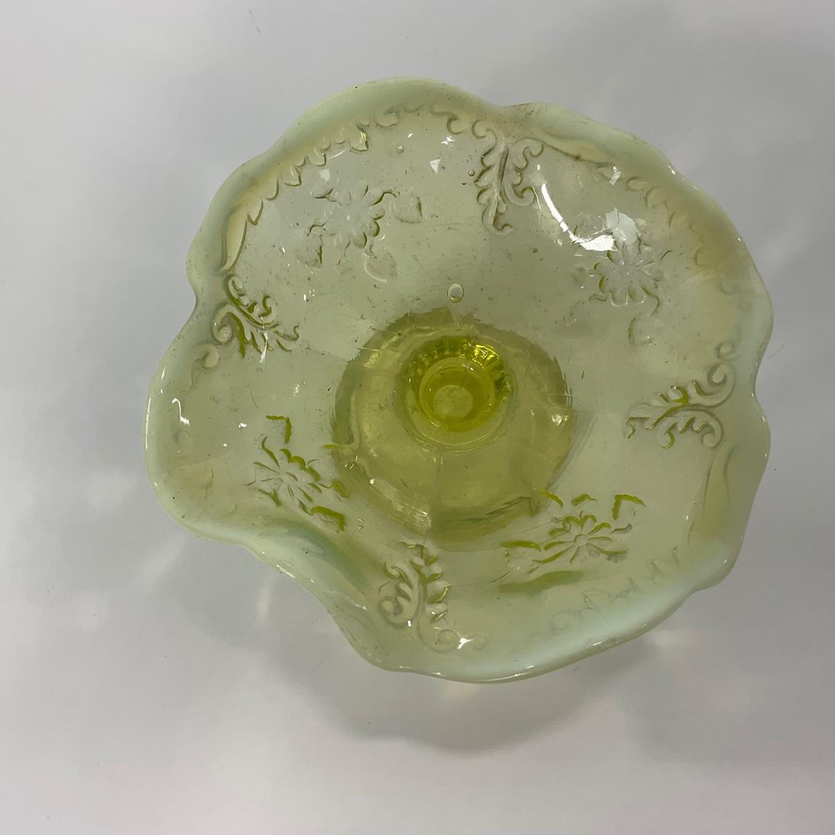 One intricate opalescent vaseline short compote. I am Uranium glass so I DO GLOW under blacklight. Please see photos for details and condition. ::: Shipping is available on this lot. If you require shipping you must let us know at the close of the auction. We will coordinate with you after the item has been won. Shipping fees will include insurance up to or exceeding the value of all items being mailed. If you have any questions regarding this lot please contact the auctioneer either via this website, by direct email or by phone. PICK UP TIMES and other important information can be found in the TERMS and DESCRIPTION of the auction. Please take a look for pertinent information. Thanks!