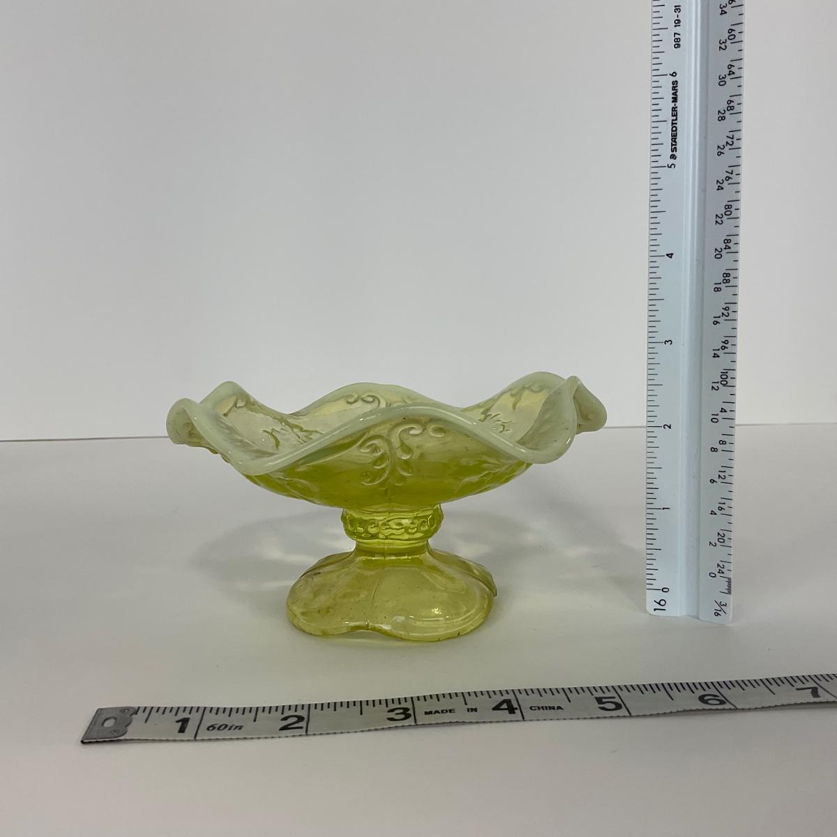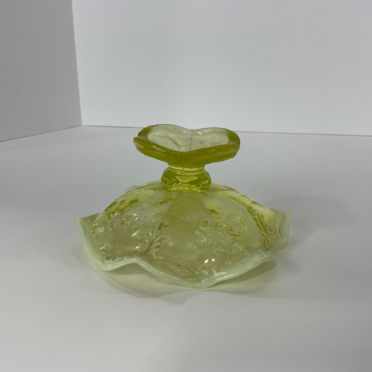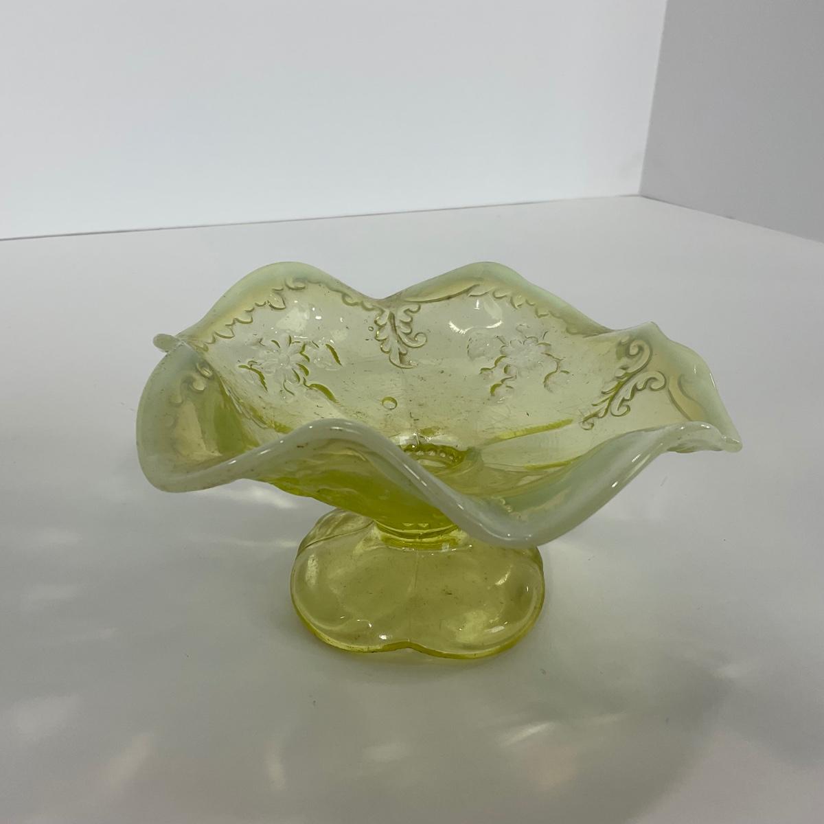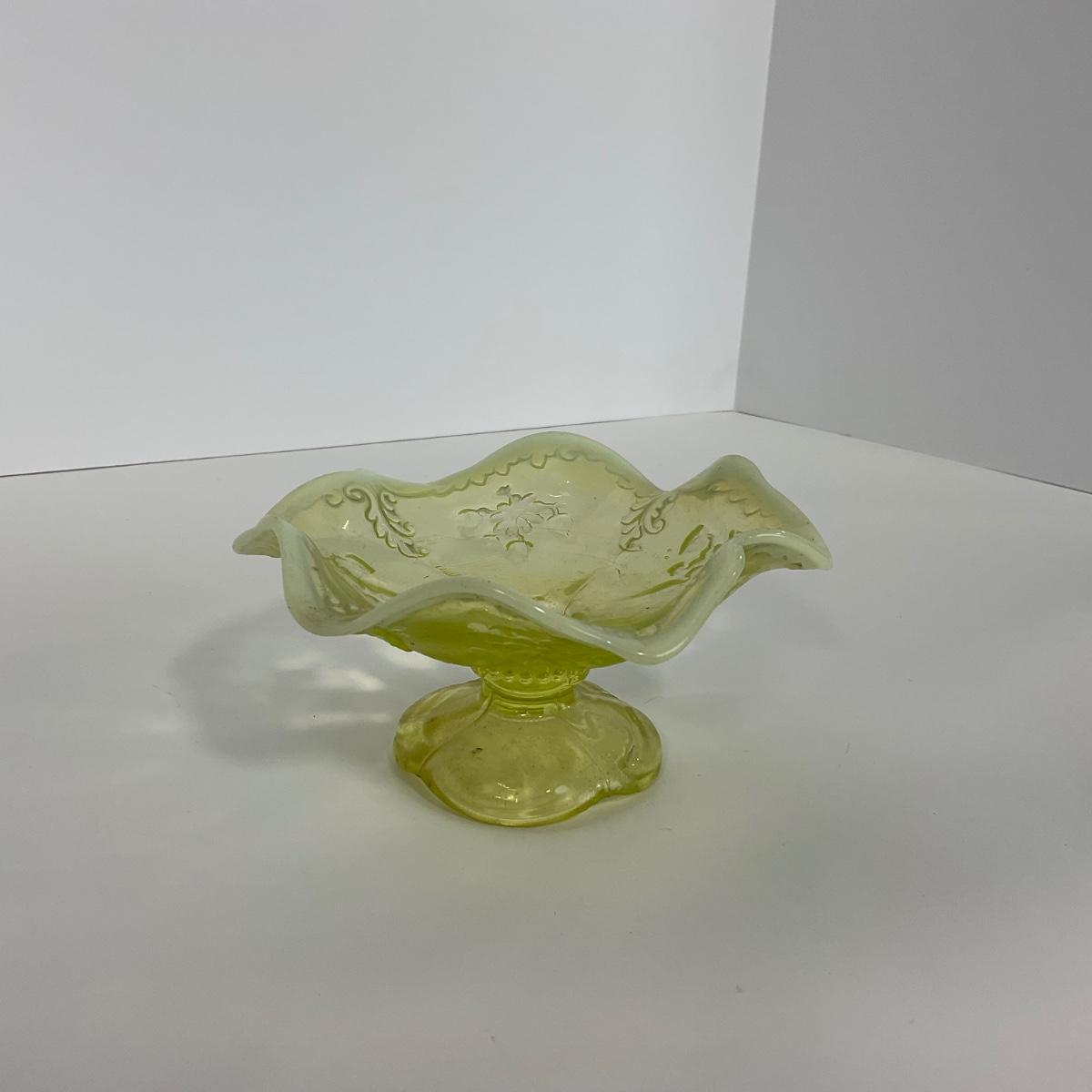 One intricate opalescent vaseline short compote. I am Uranium glass so I DO GLOW under blacklight. Please see photos for details and condition. ::: Shipping is available on this lot. If you require shipping you must let us know at the close of the auction. We will coordinate with you after the item has been won. Shipping fees will include insurance up to or exceeding the value of all items being mailed. If you have any questions regarding this lot please contact the auctioneer either via this website, by direct email or by phone. PICK UP TIMES and other important information can be found in the TERMS and DESCRIPTION of the auction. Please take a look for pertinent information. Thanks!