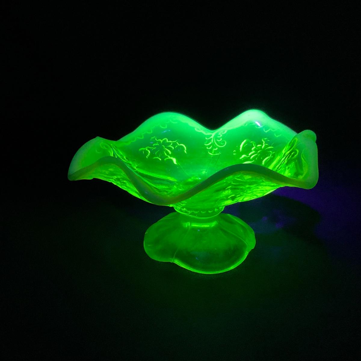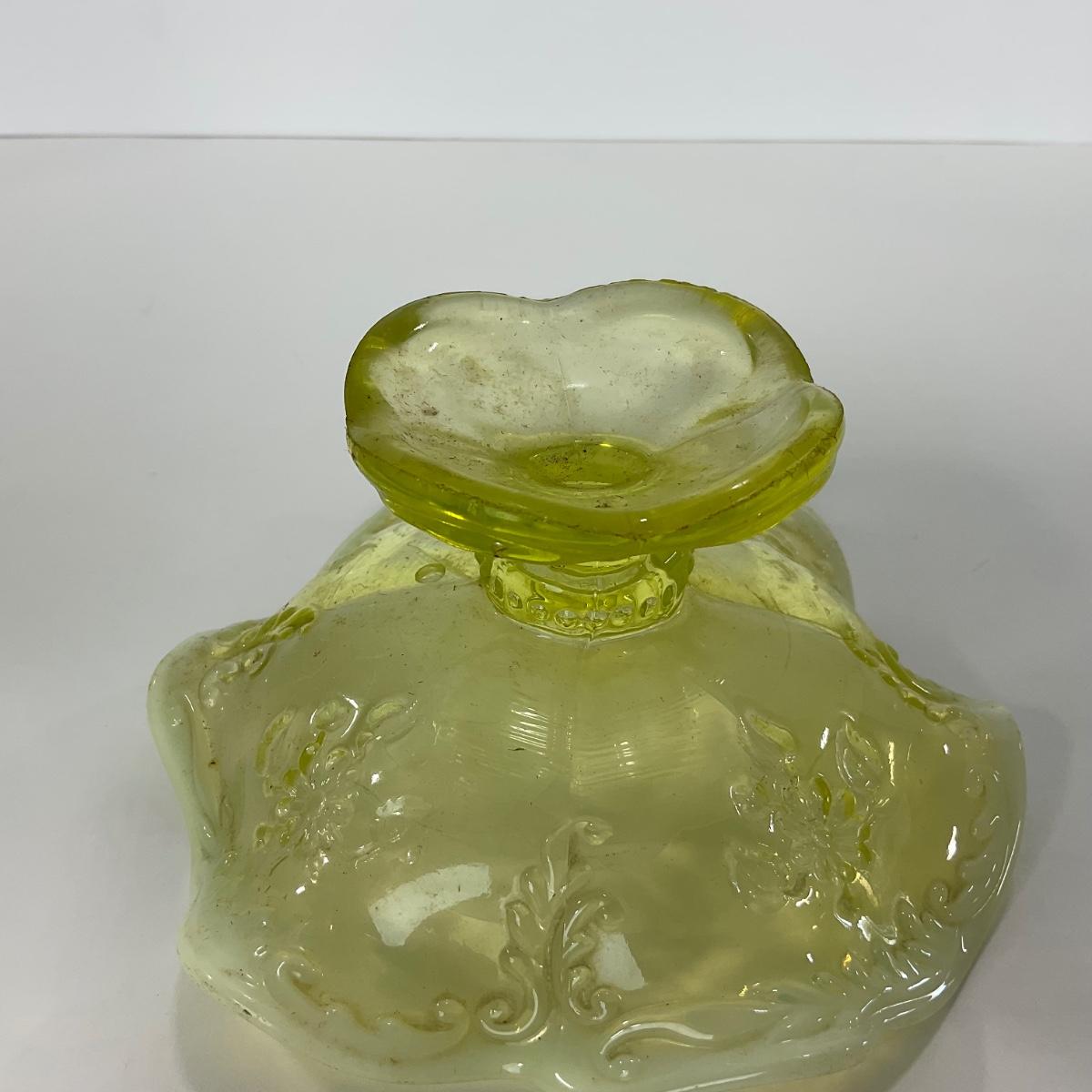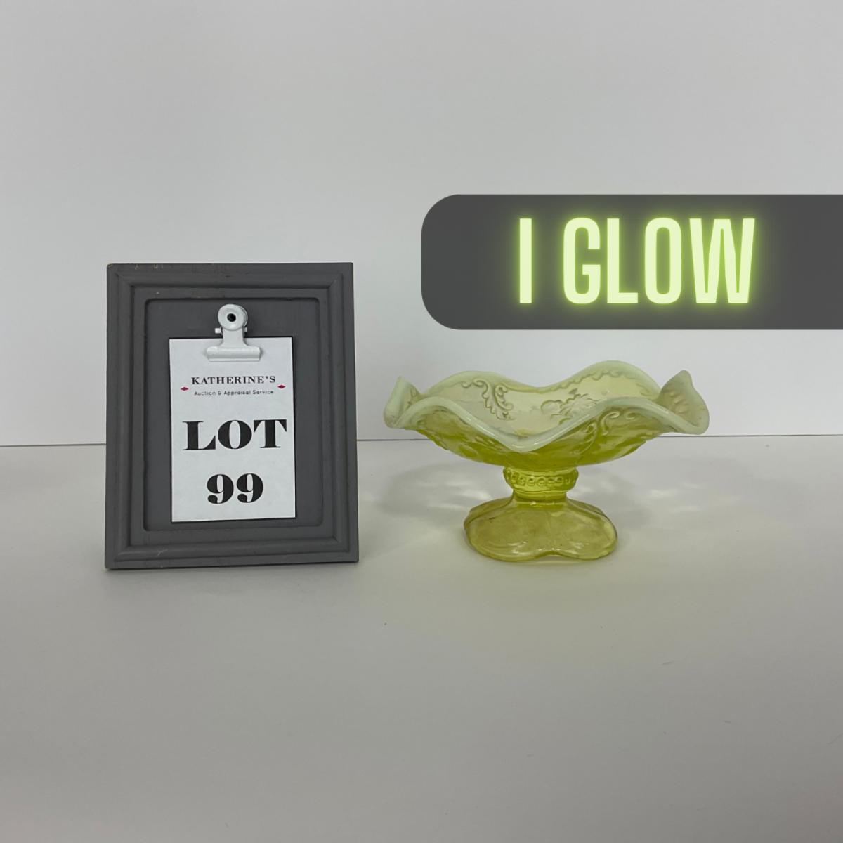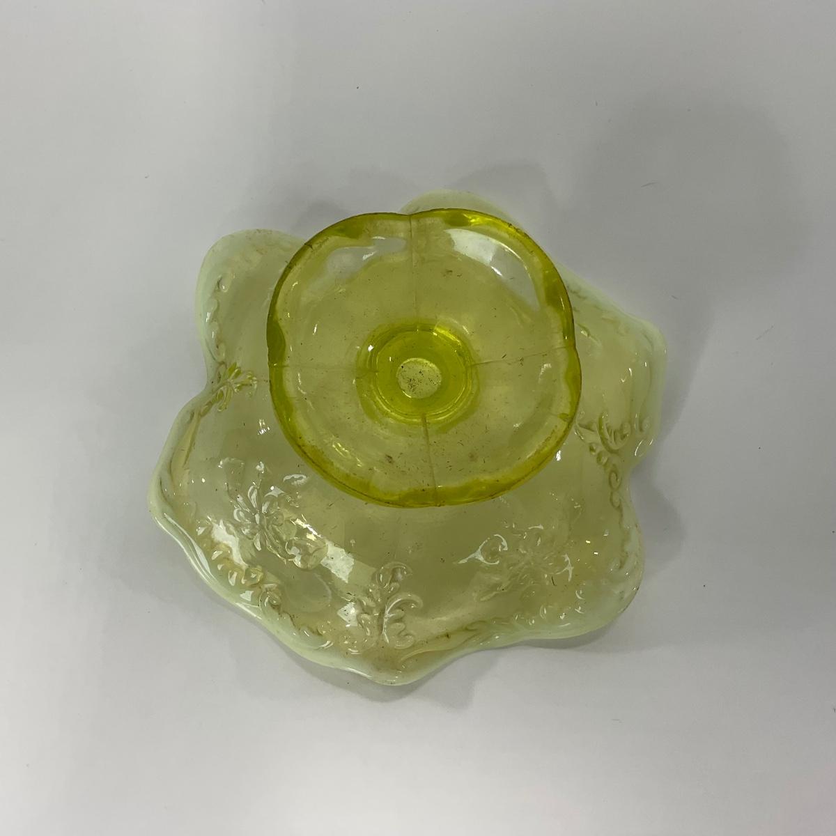 One intricate opalescent vaseline short compote. I am Uranium glass so I DO GLOW under blacklight. Please see photos for details and condition. ::: Shipping is available on this lot. If you require shipping you must let us know at the close of the auction. We will coordinate with you after the item has been won. Shipping fees will include insurance up to or exceeding the value of all items being mailed. If you have any questions regarding this lot please contact the auctioneer either via this website, by direct email or by phone. PICK UP TIMES and other important information can be found in the TERMS and DESCRIPTION of the auction. Please take a look for pertinent information. Thanks!
