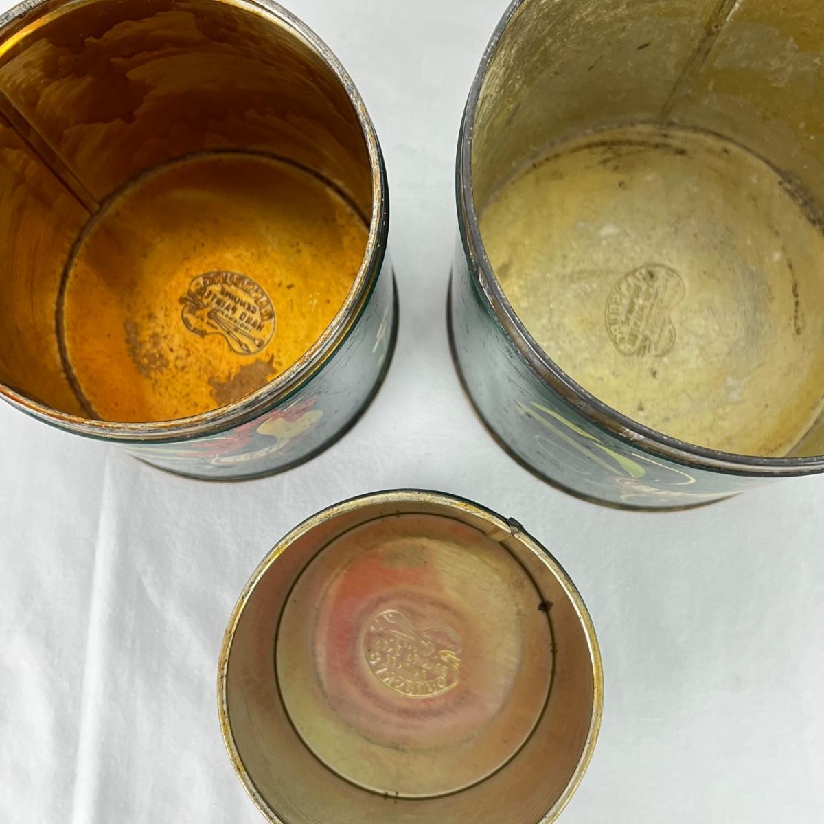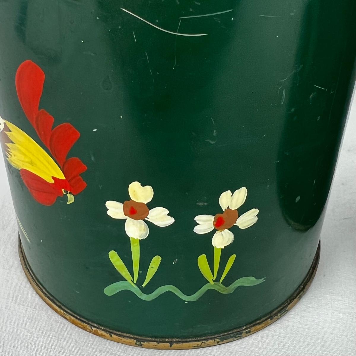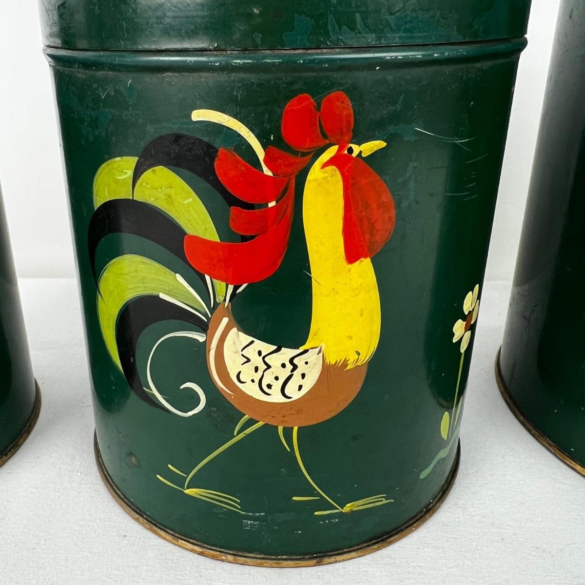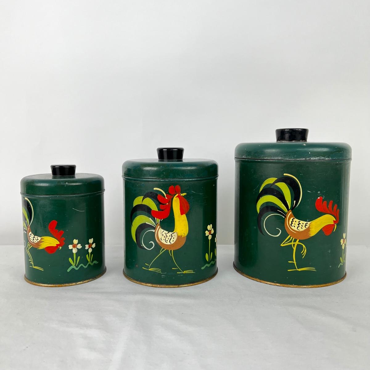 Tin hand painted green and rooster set of 3 canisters. Made in Indianapolis. Missing 1 of original set.