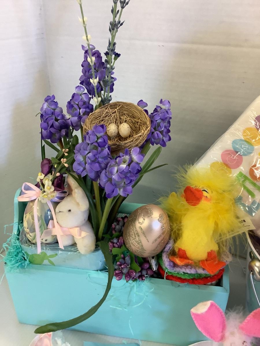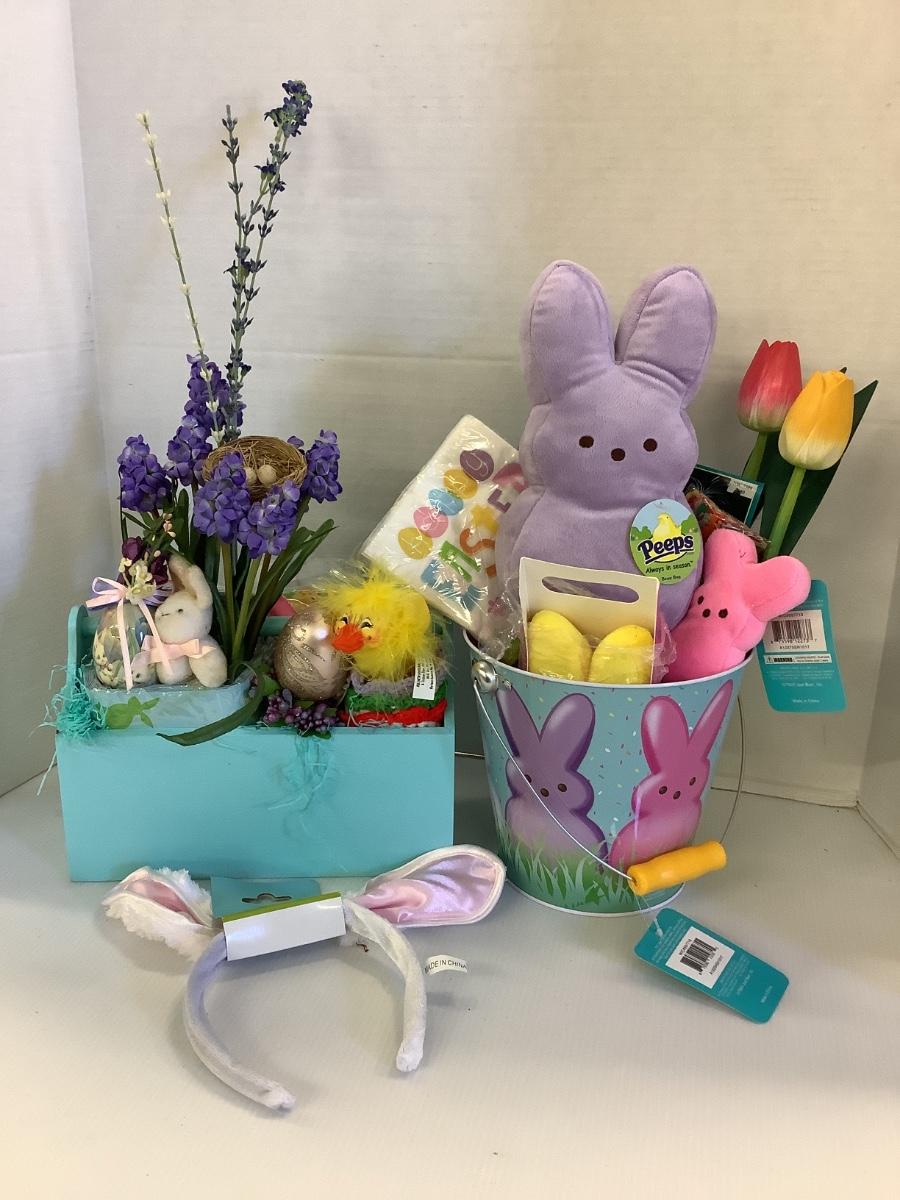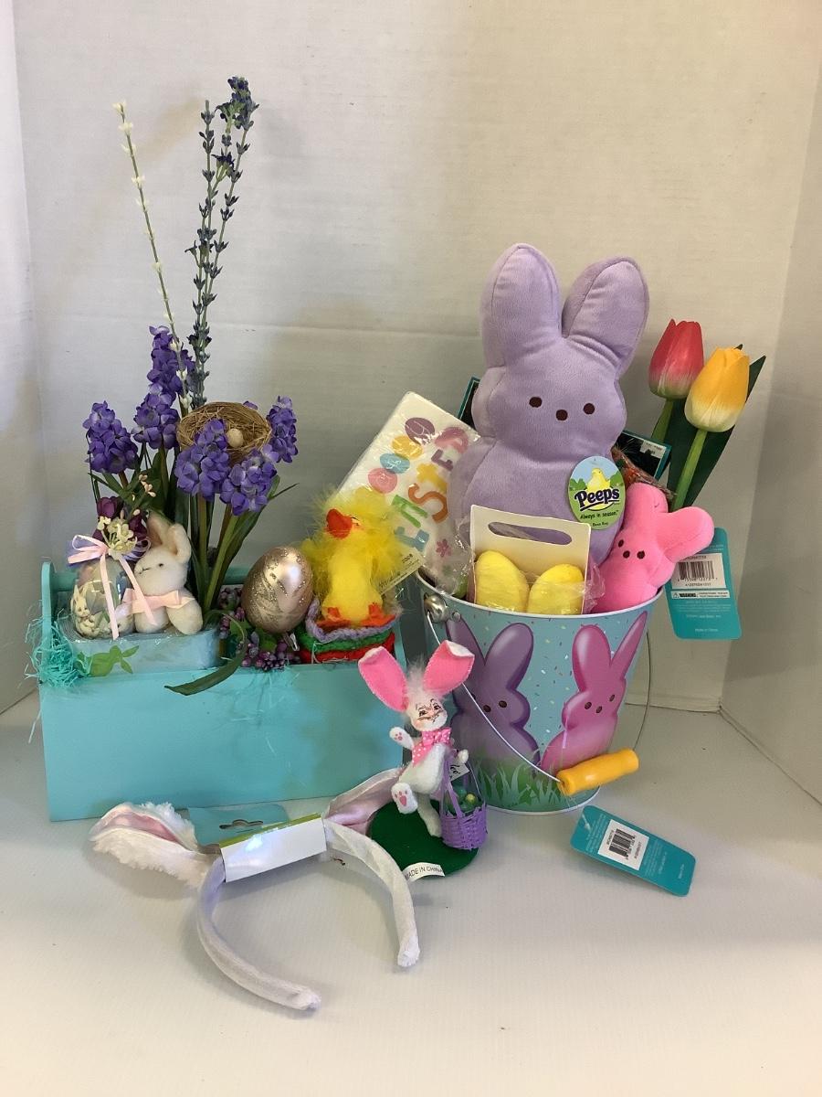 Peeps pail filled with Peeps stuffed toys, with napkins, confetti and wooden tulips, robins egg blue with annalee chick and silk hyacinth with