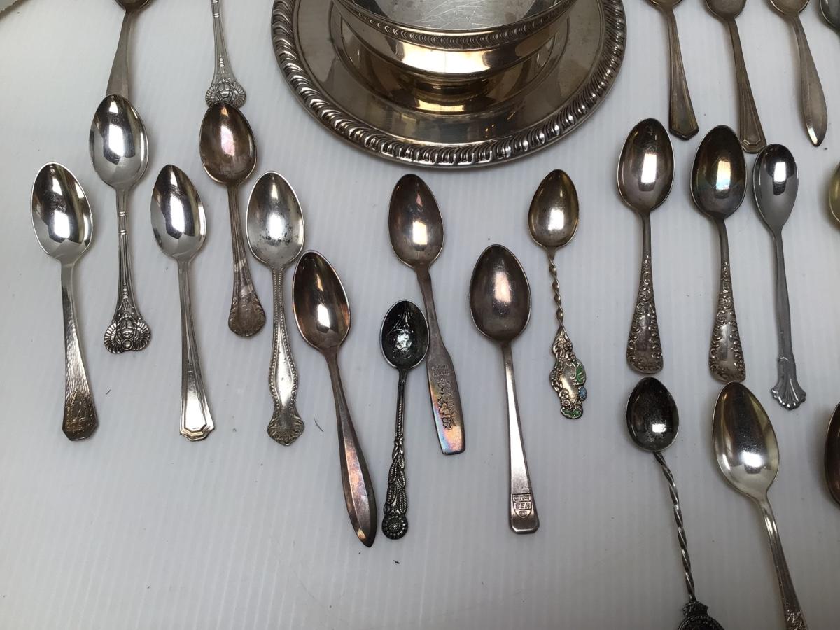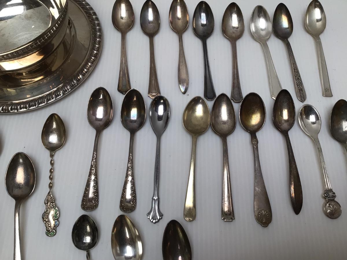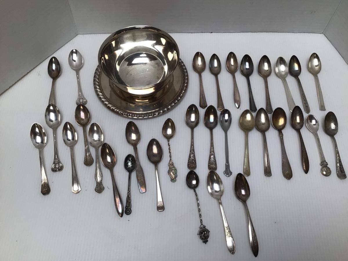 There are 32 spoons in this lot and small serving bowl with underplate, all are Silver plate.