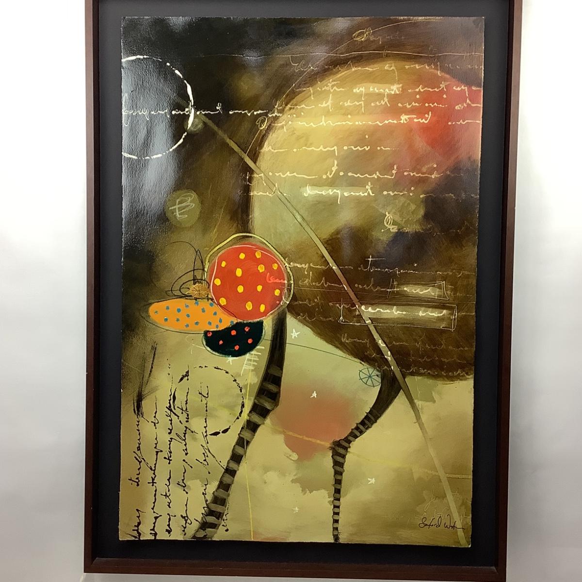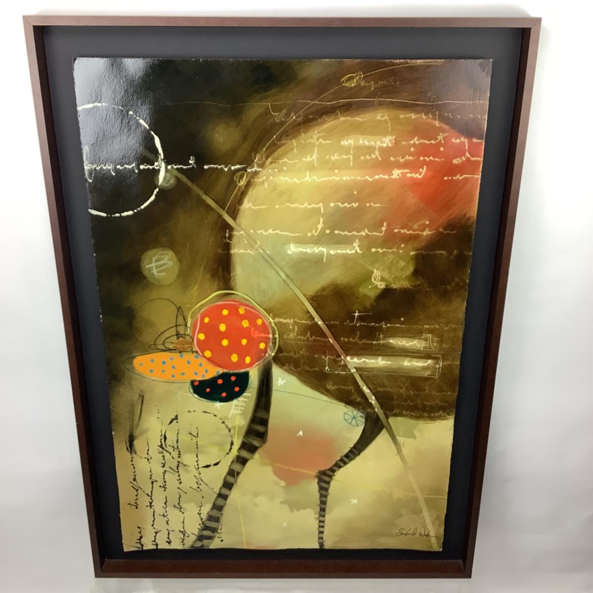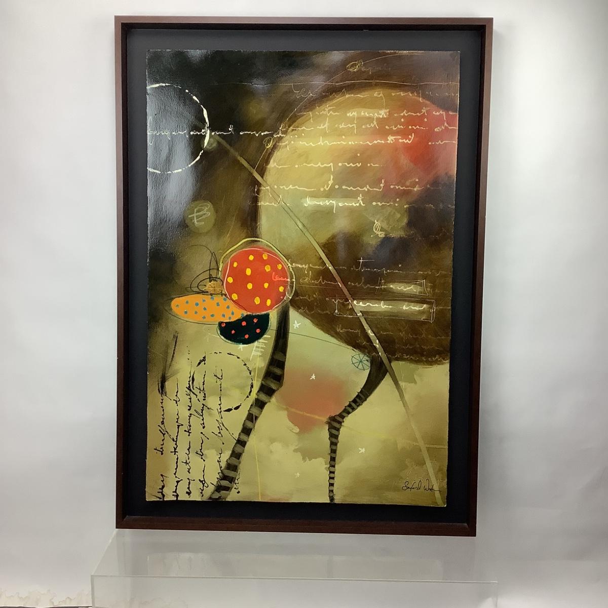 The acrylic painting on paper is large and mounted in a shadow box type frame with no glass. It measures 35.5" wide x 49.5" high. The artist Sanford Wakeman (born 1969) he concentrates on surreal sense of vitality-a life within the non-living. Educated at the University of Georgia Fine Arts, and the Savannah College of Art & Design. This is a large statement art piece.
