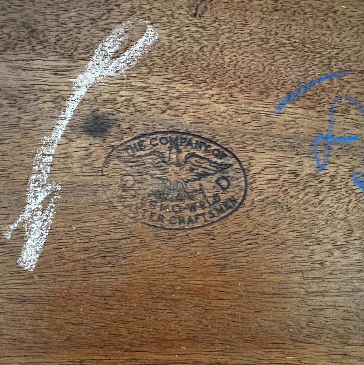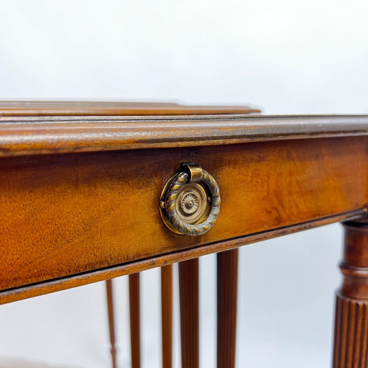 Sheraton style legs. Top table has a few stains and sun fading.
