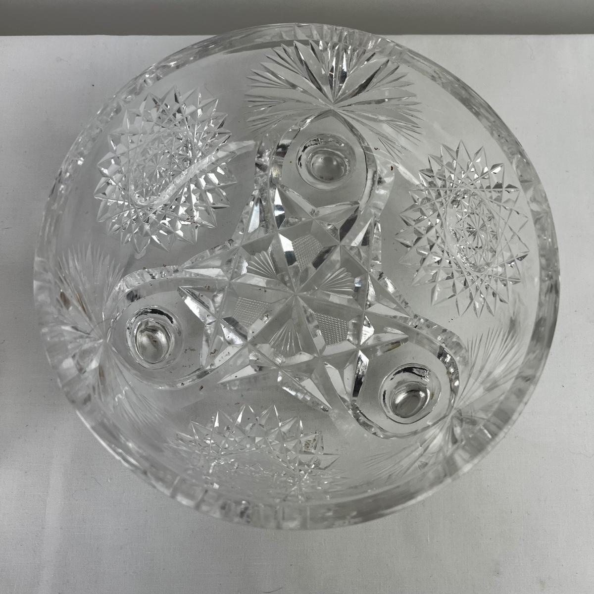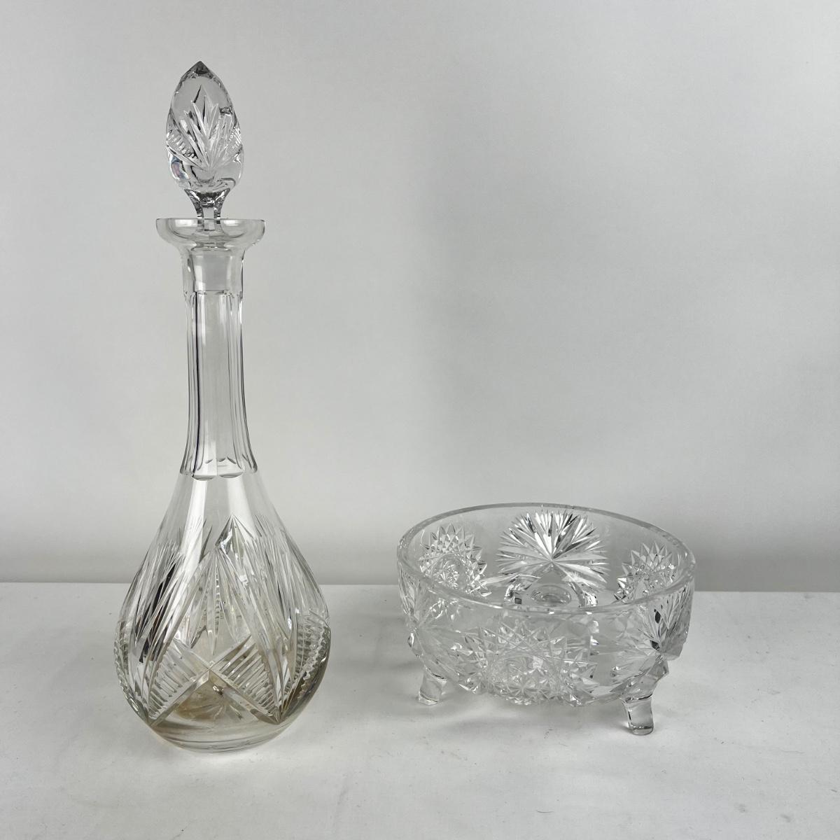 Decanter needs bottom inside scrubbed (16”H) & Footed bowl measures 7.25”Diameter x 4”H