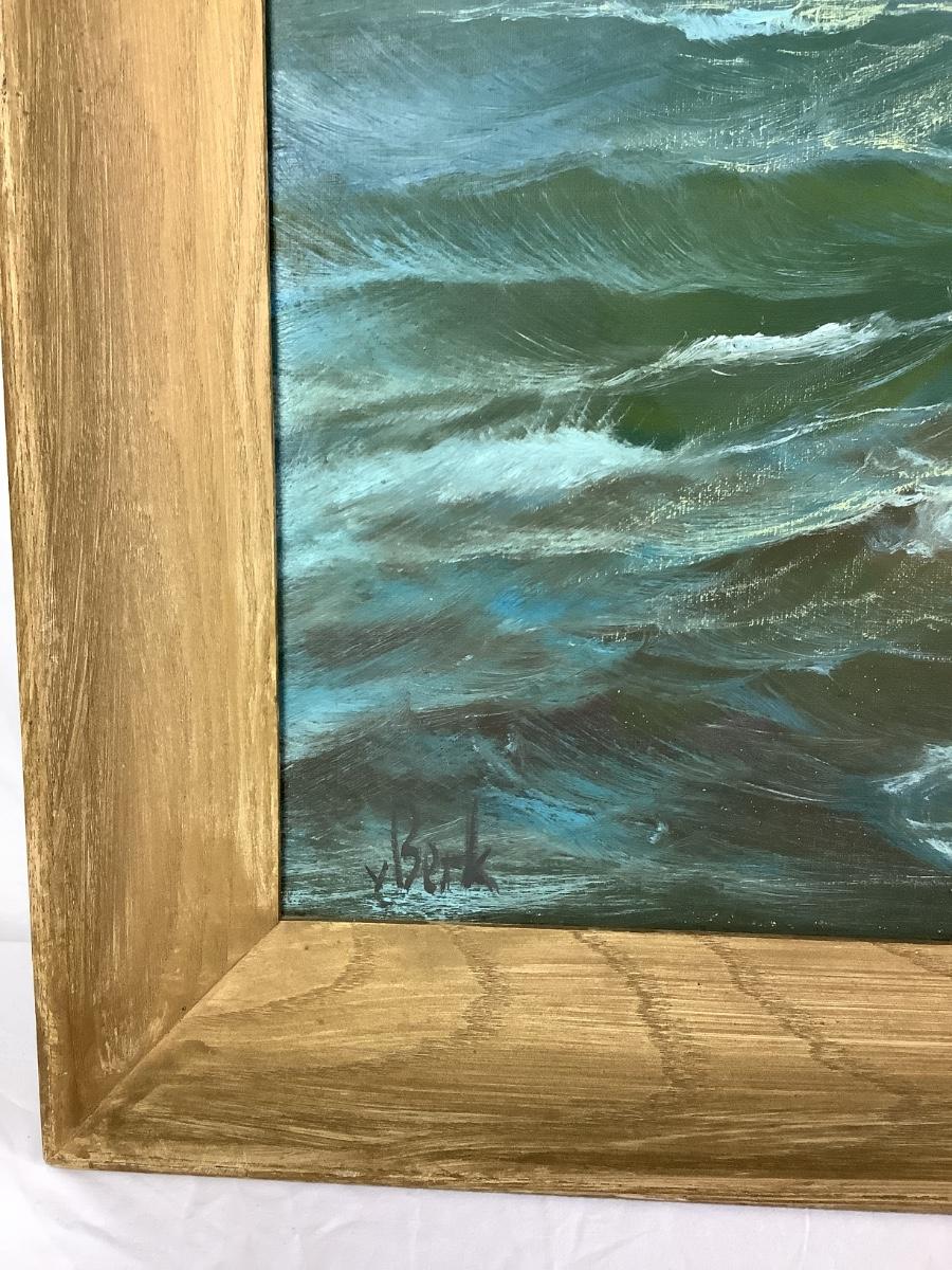 Original Vintage Oil Painting by Accomplished German Seascape Artist V. Berk. Scene of sailboat on rough seas. Painting is in a wooden frame and both the frame and painting are in good condition