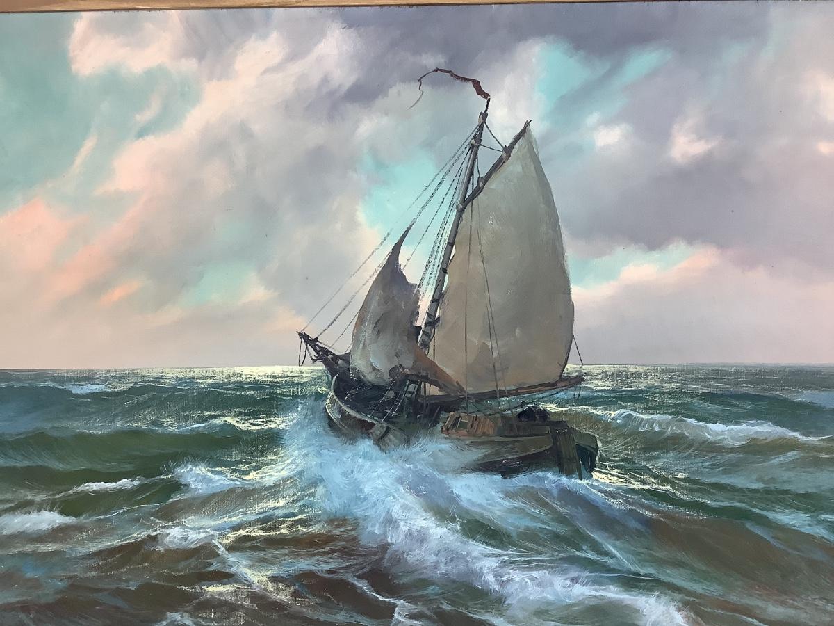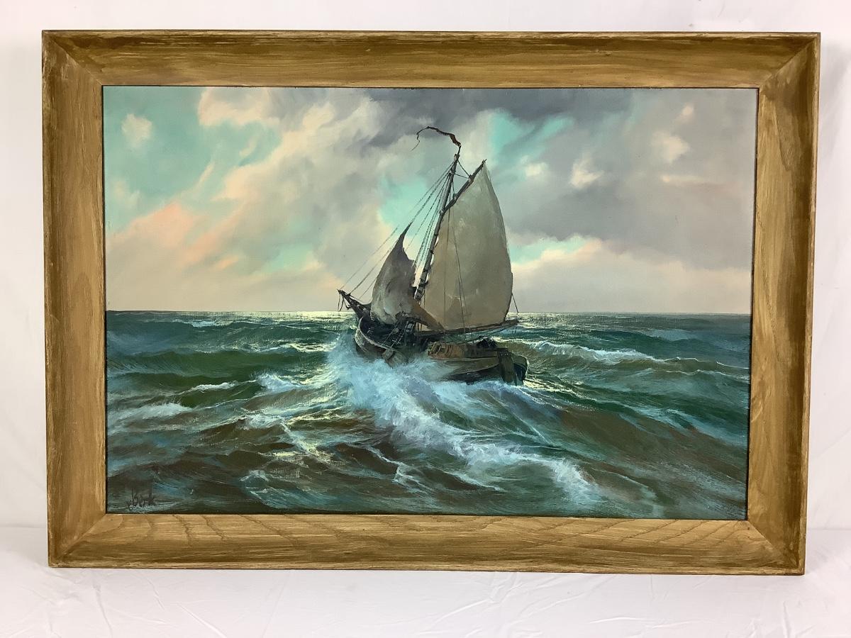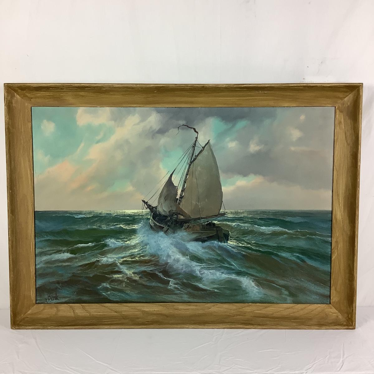 997 Original Vintage Oil Painting by Accomplished German Seascape Artist V. Berk. Scene of Sailboat on Rough Seas
