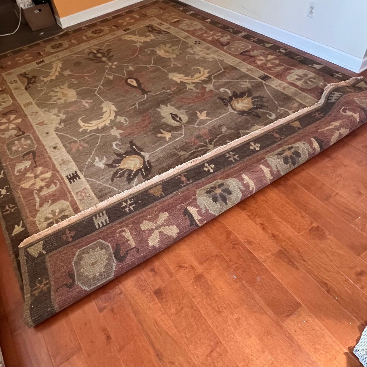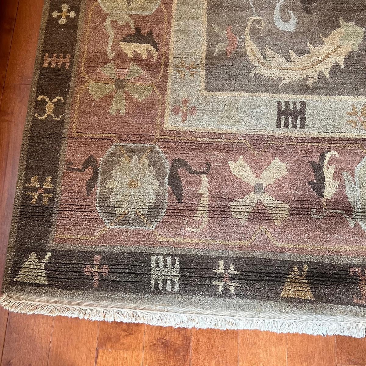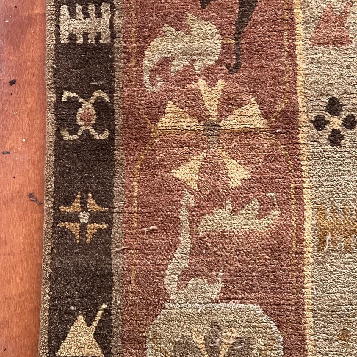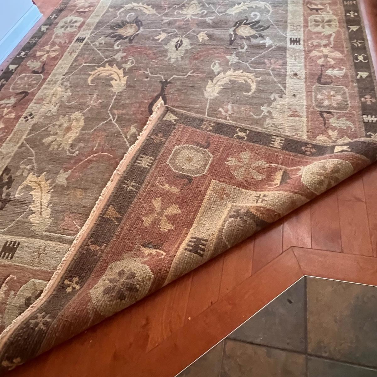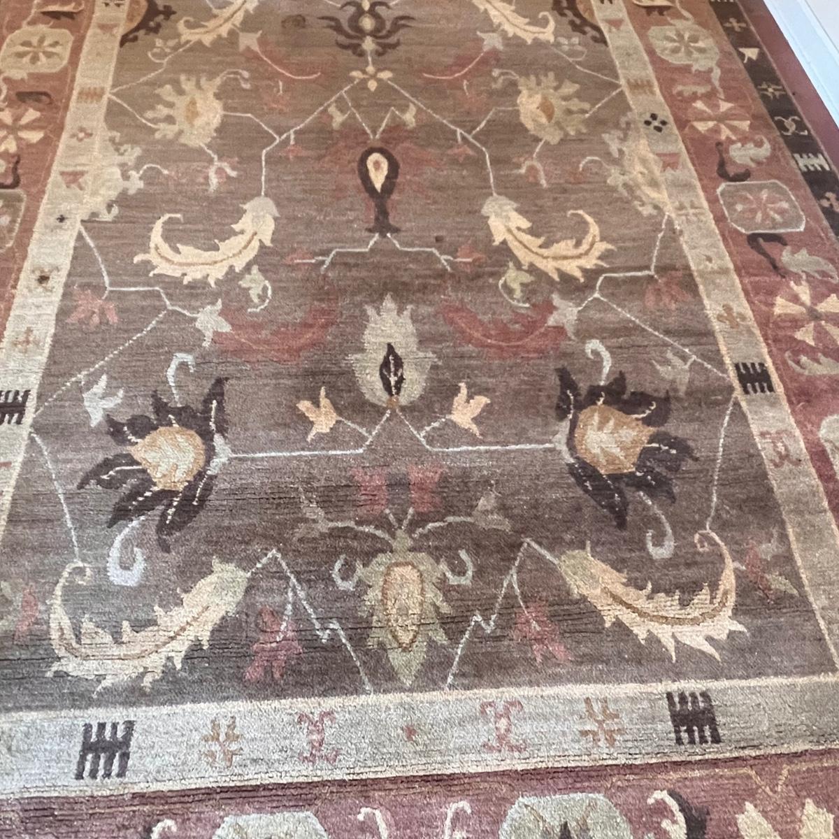 An attractive earth toned rug that will complement any room. This rug has shades of brown and tans with a botanical design. This is a fairly plush rug that appears to be wool, but no label to determine its mfg. The non-slip pad is included.