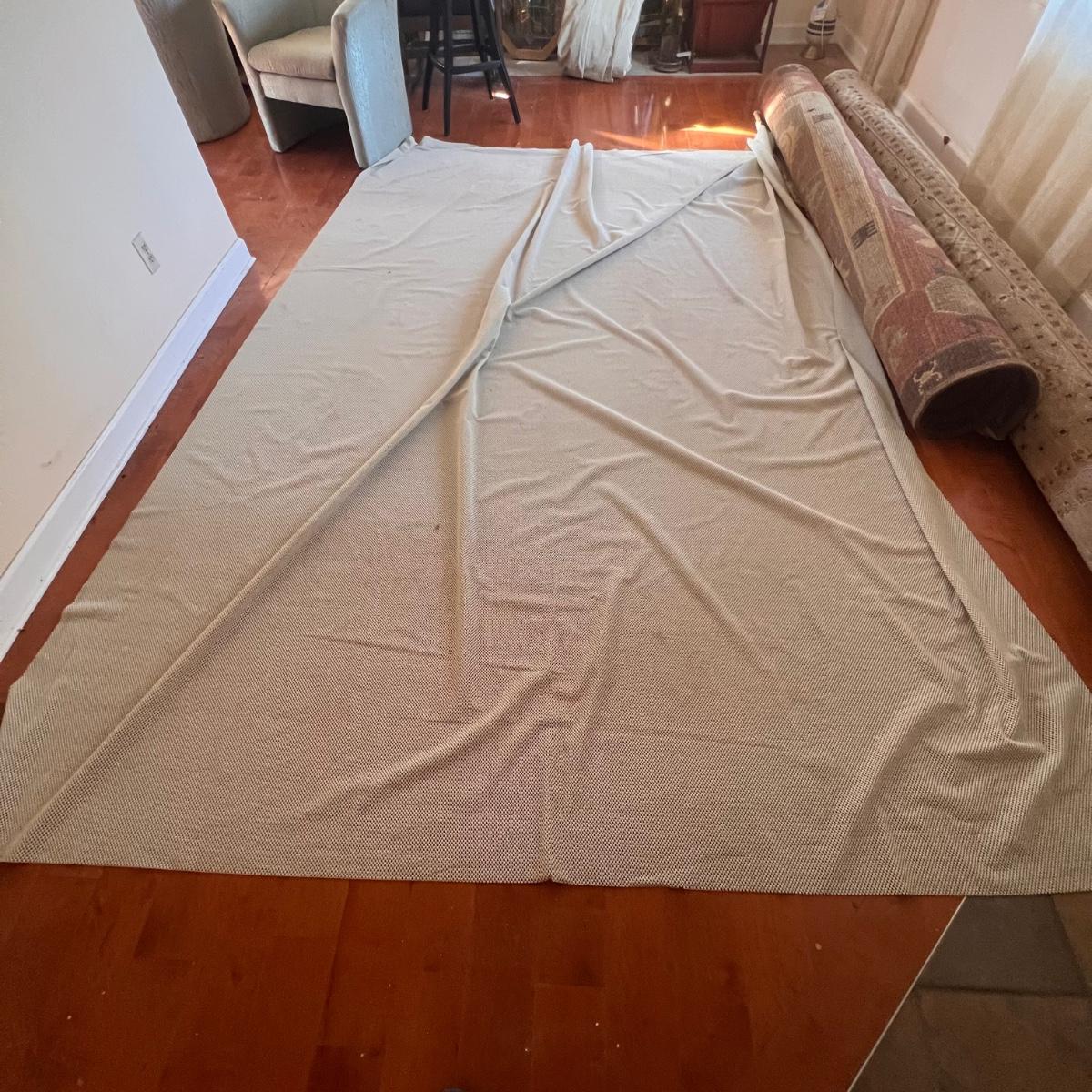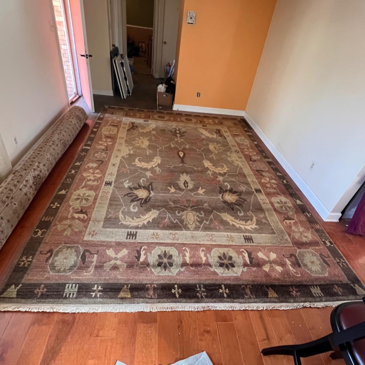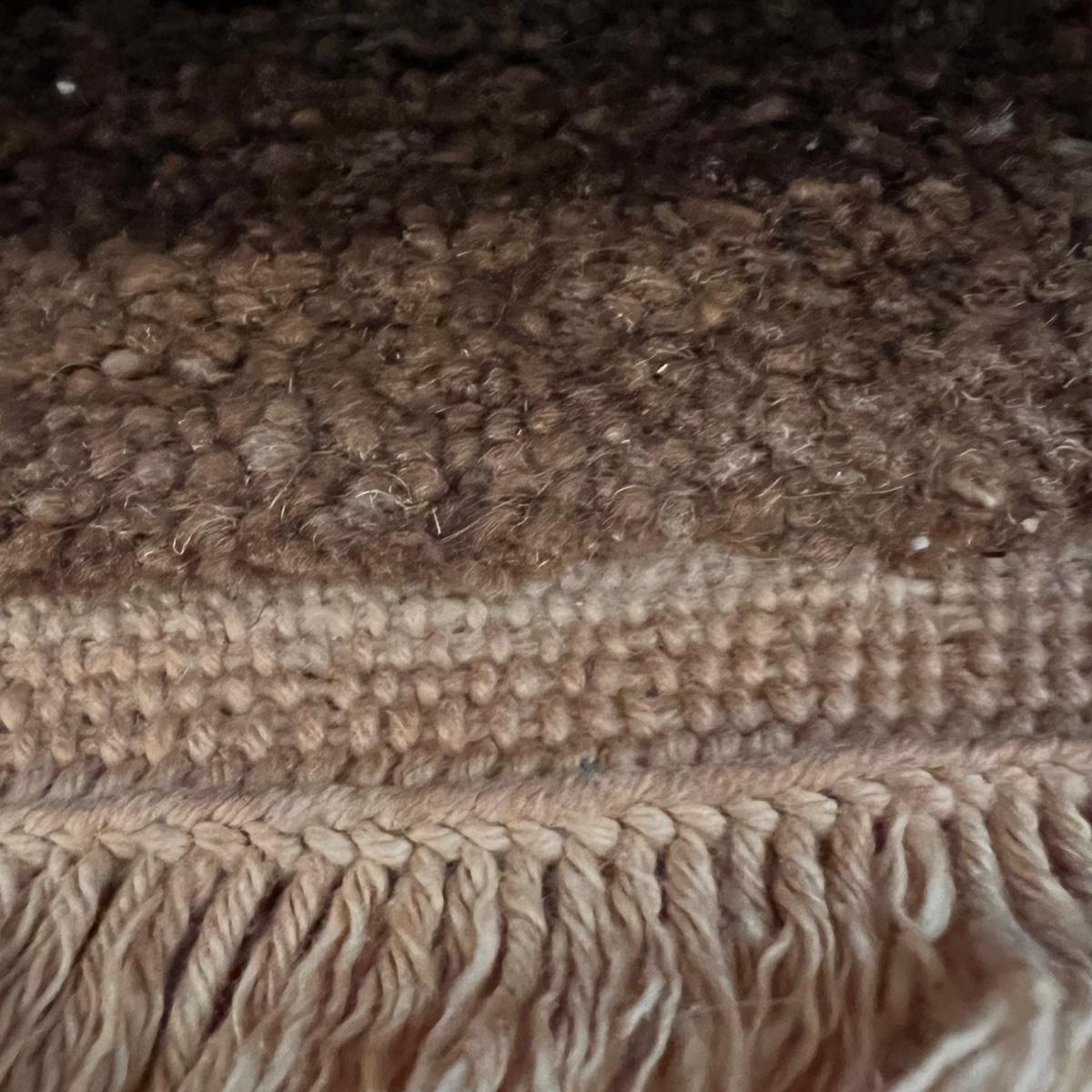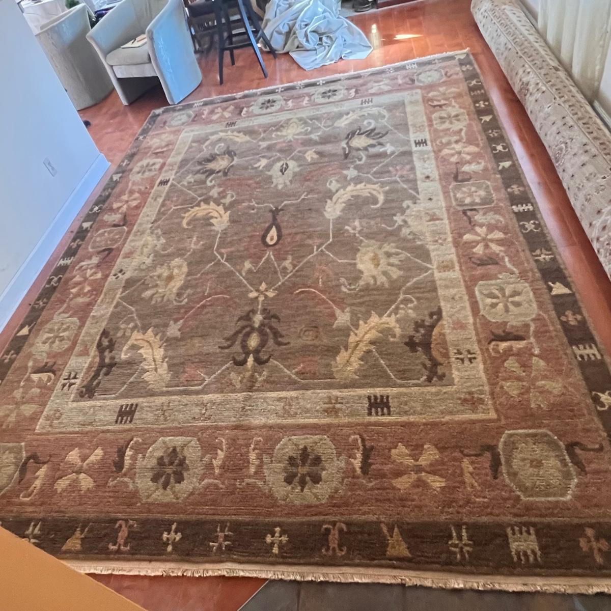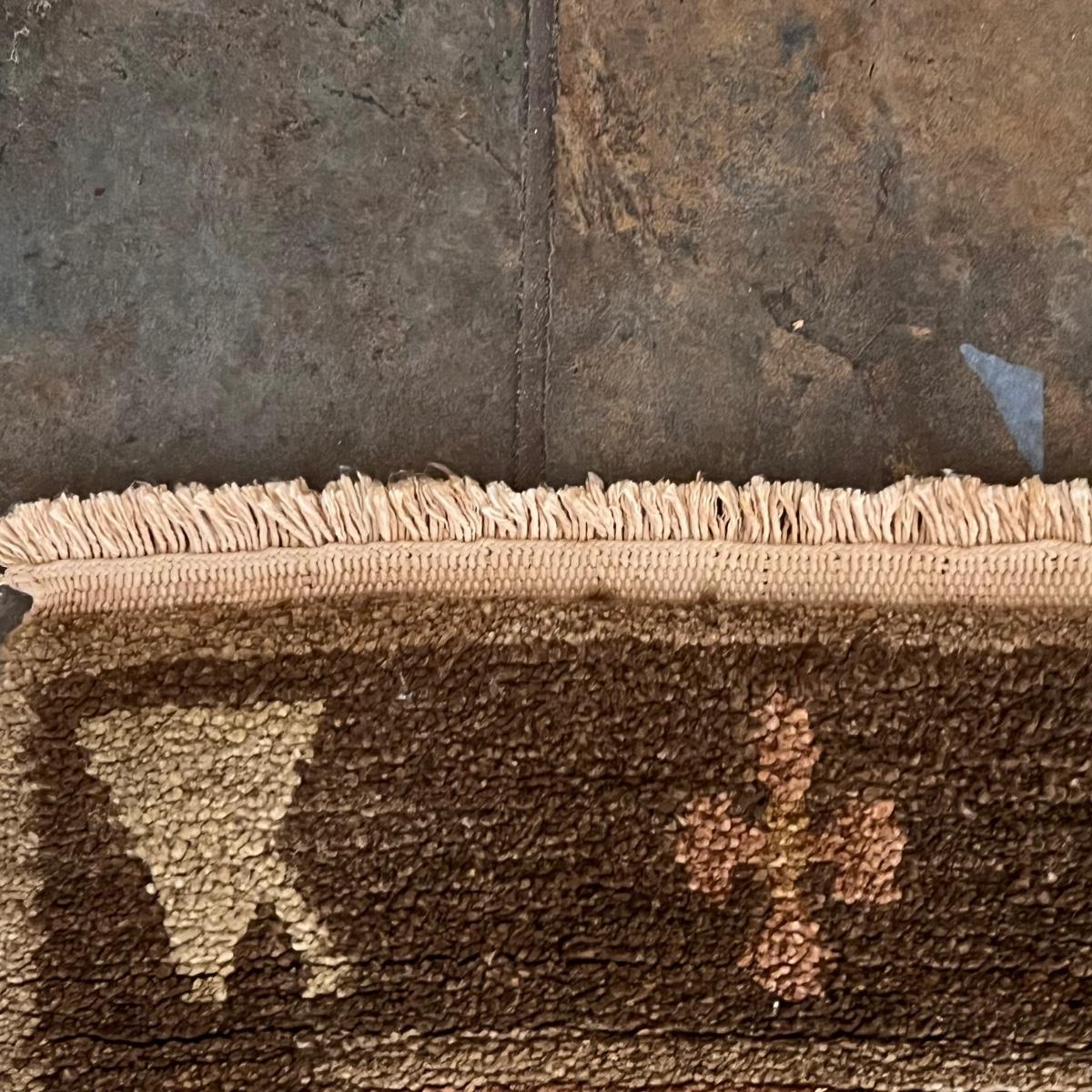An attractive earth toned rug that will complement any room. This rug has shades of brown and tans with a botanical design. This is a fairly plush rug that appears to be wool, but no label to determine its mfg. The non-slip pad is included.
