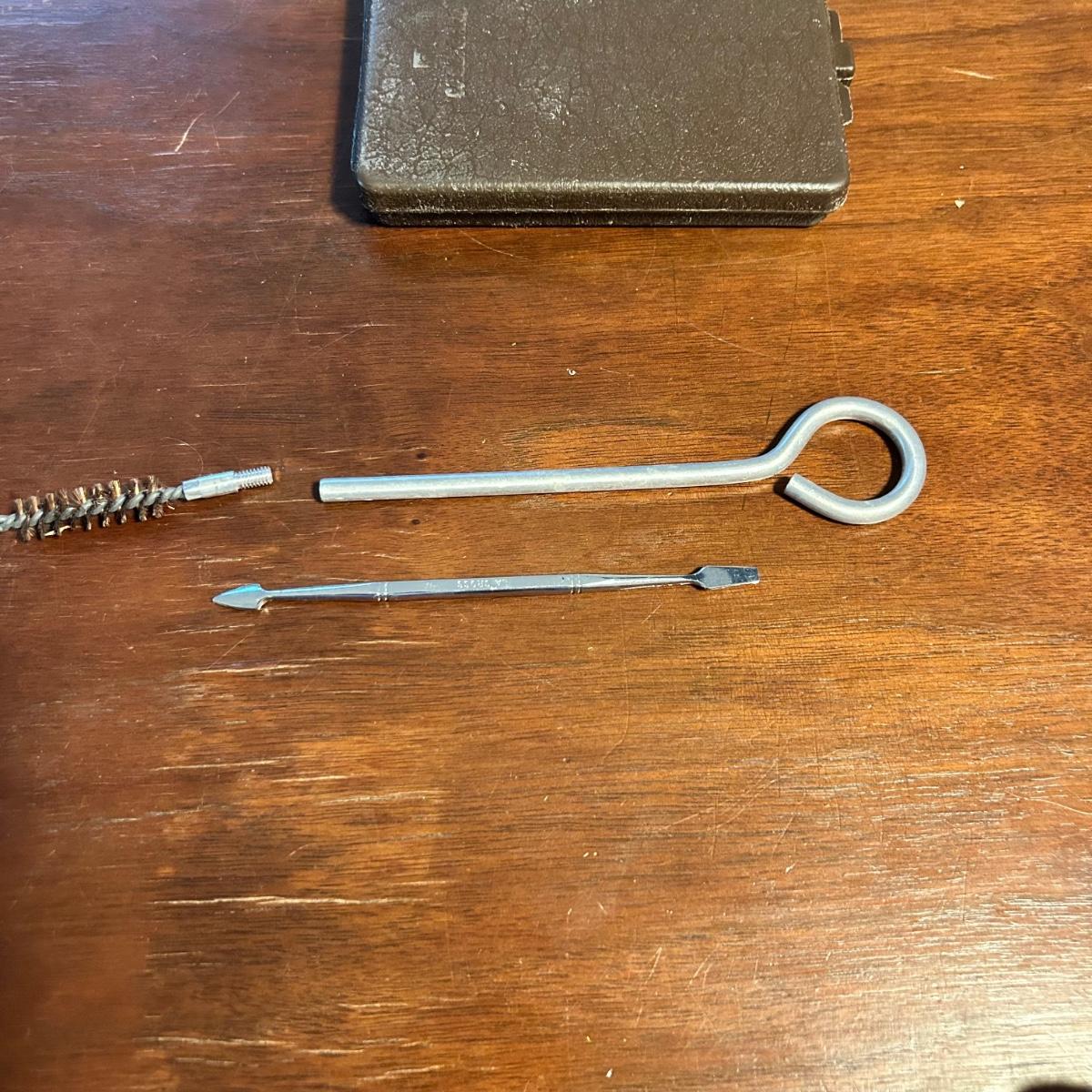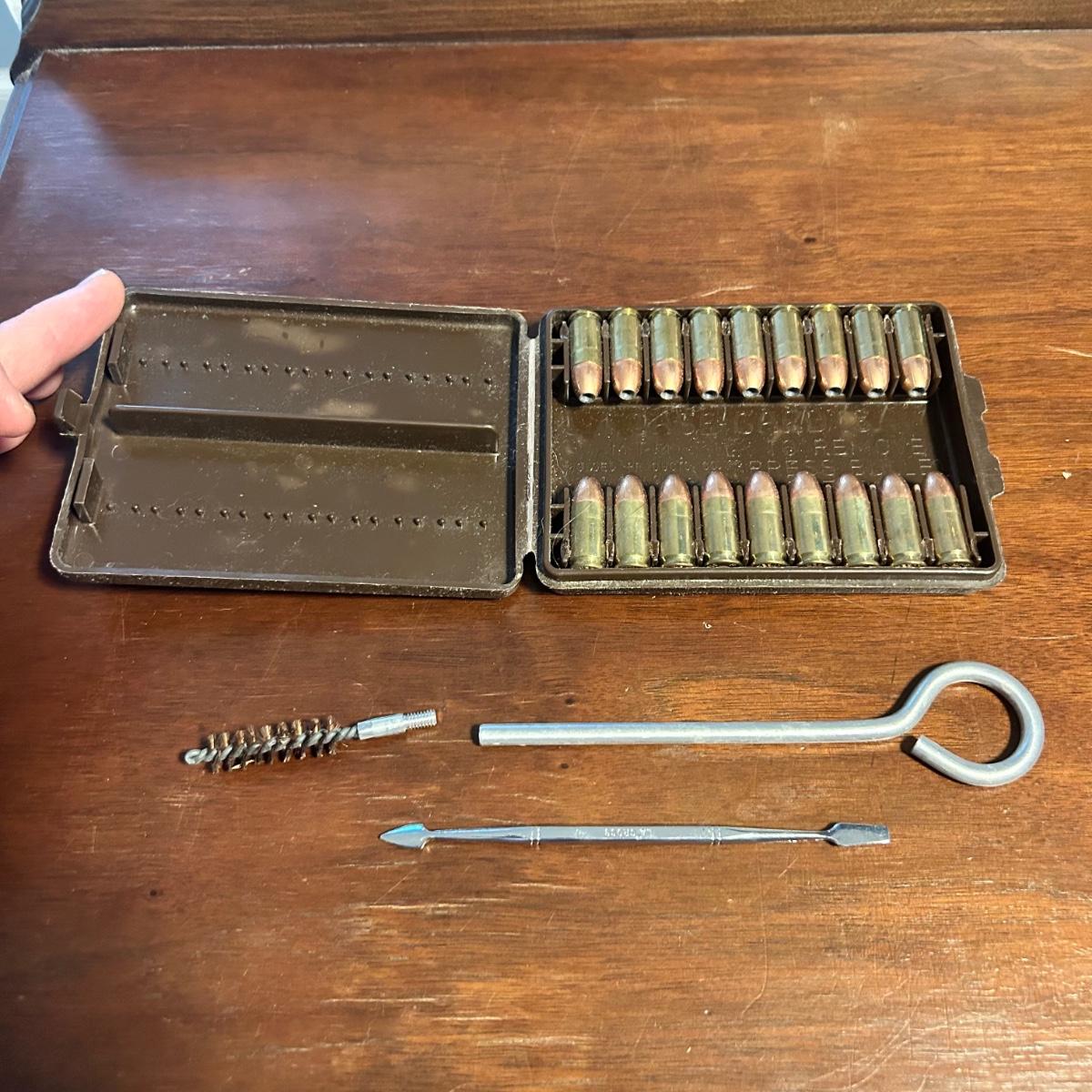 Lot includes a brown plastic carry case for 18 rounds of 9mm ammunition. It is loaded with 18 rounds. Box measures 5” x3.5” x .5” and has a plastic snap on side. Also included are two unused cleaning, pick instruments. Local pick up only.