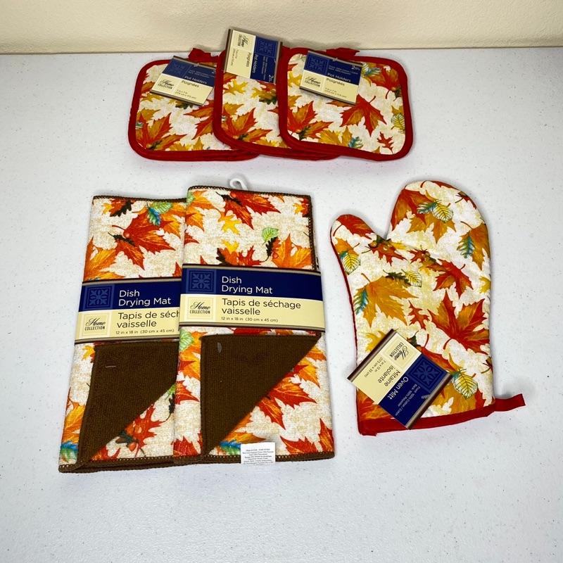 9pc Fall Kitchen Set - Pot Holders / Oven Mitt / Dish Drying Mat