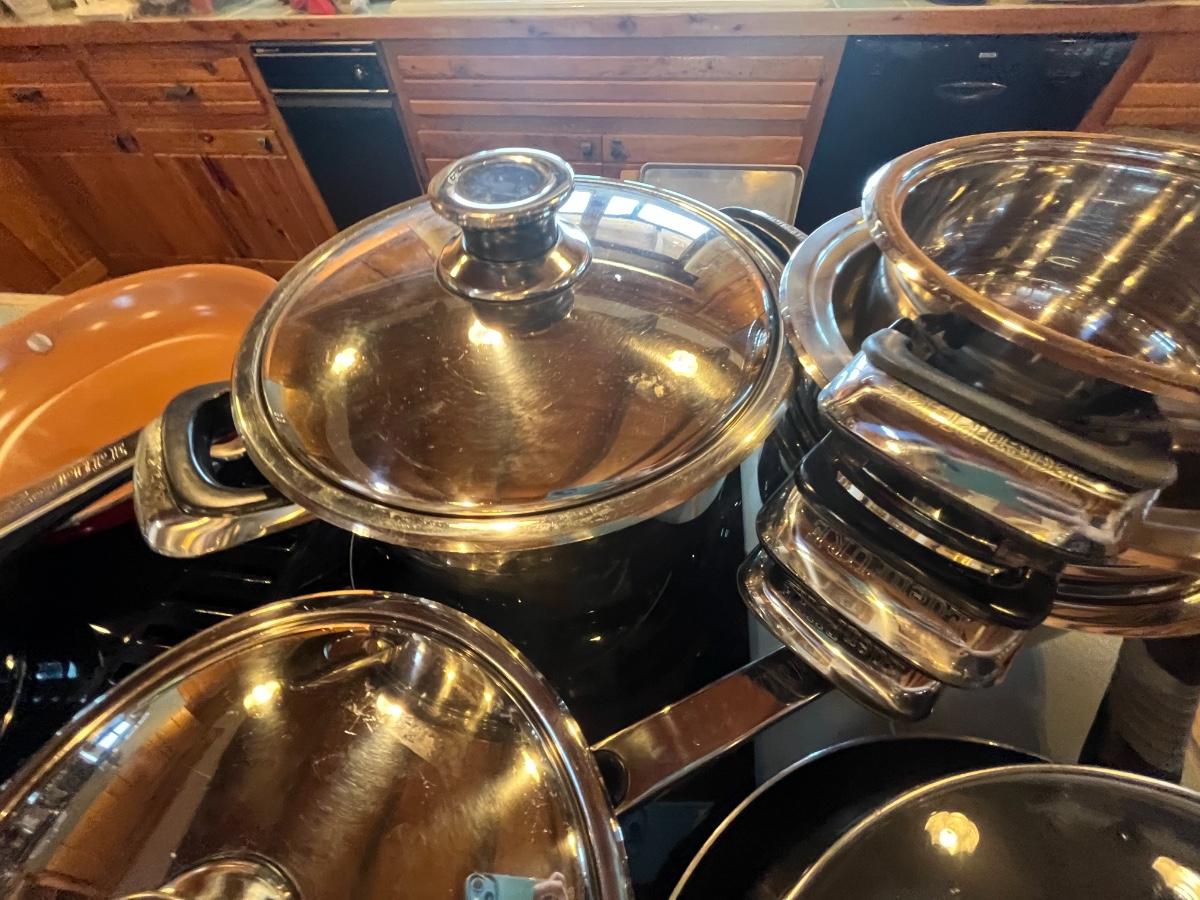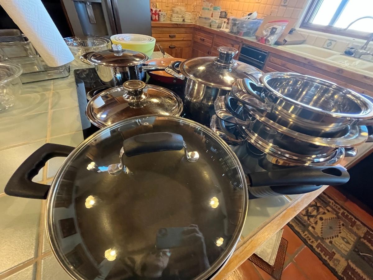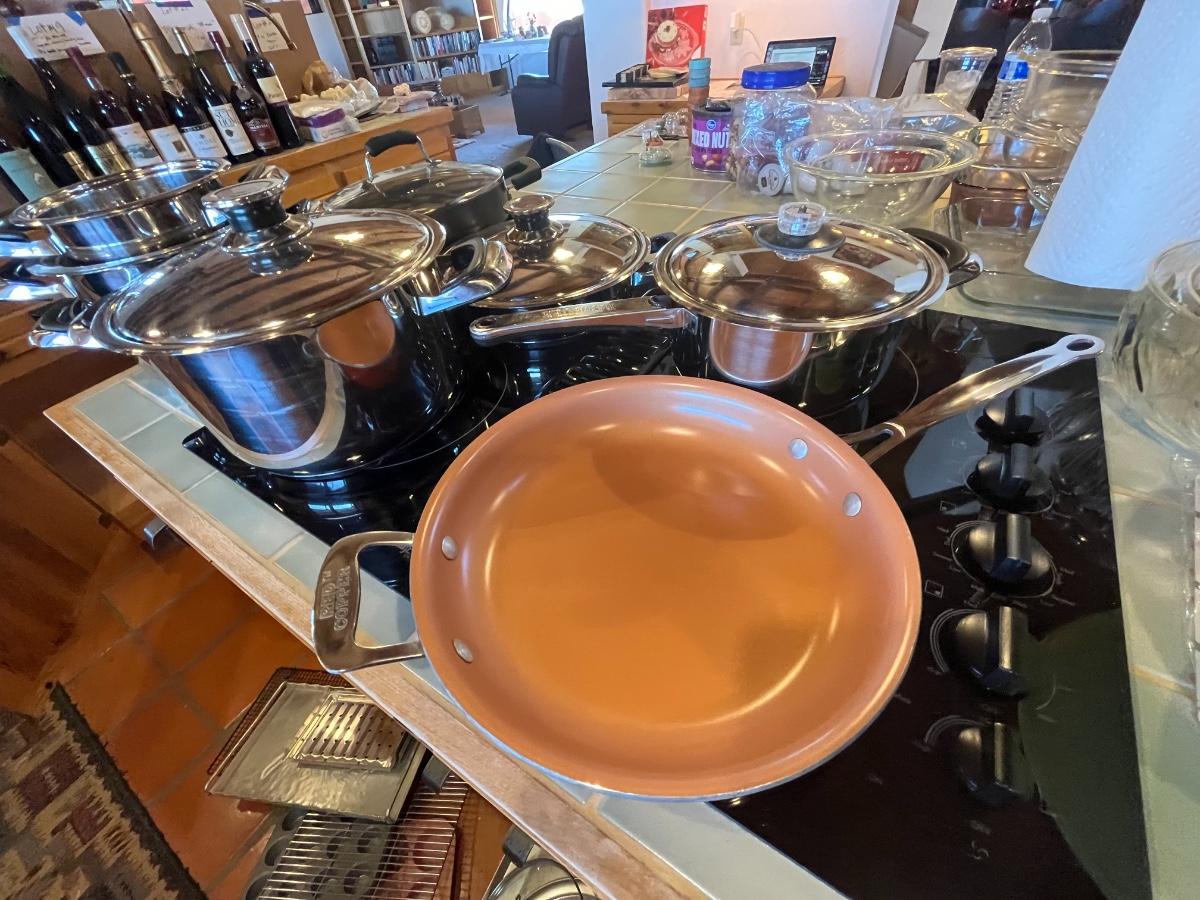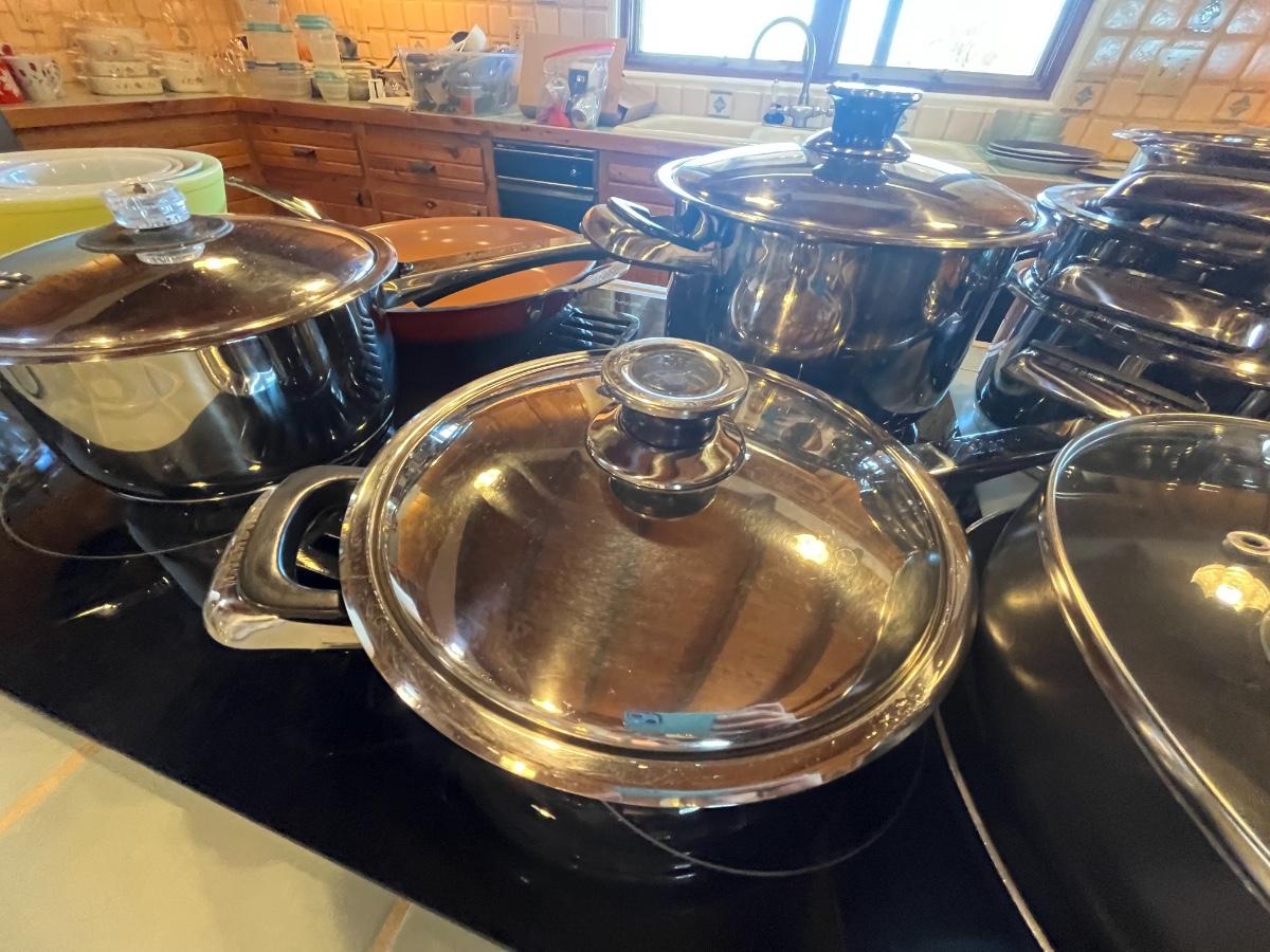Pots/pans - 9 p, brand names include: edenpure, red copper, invitations