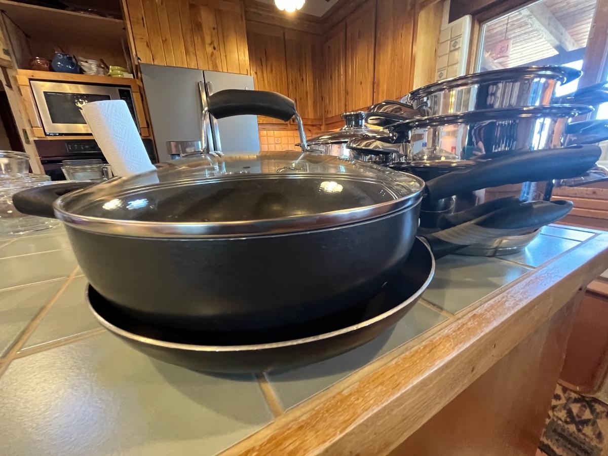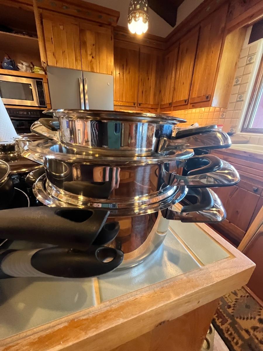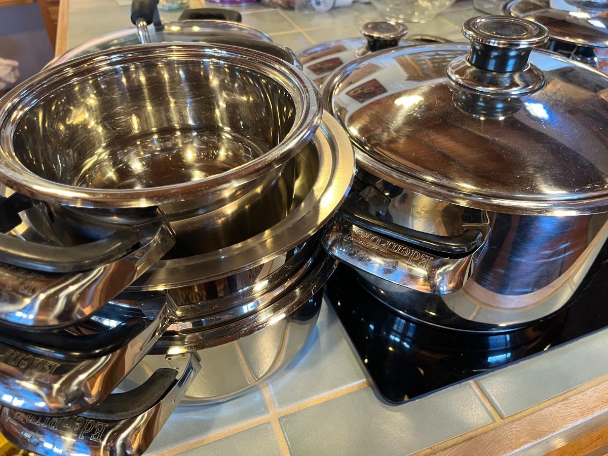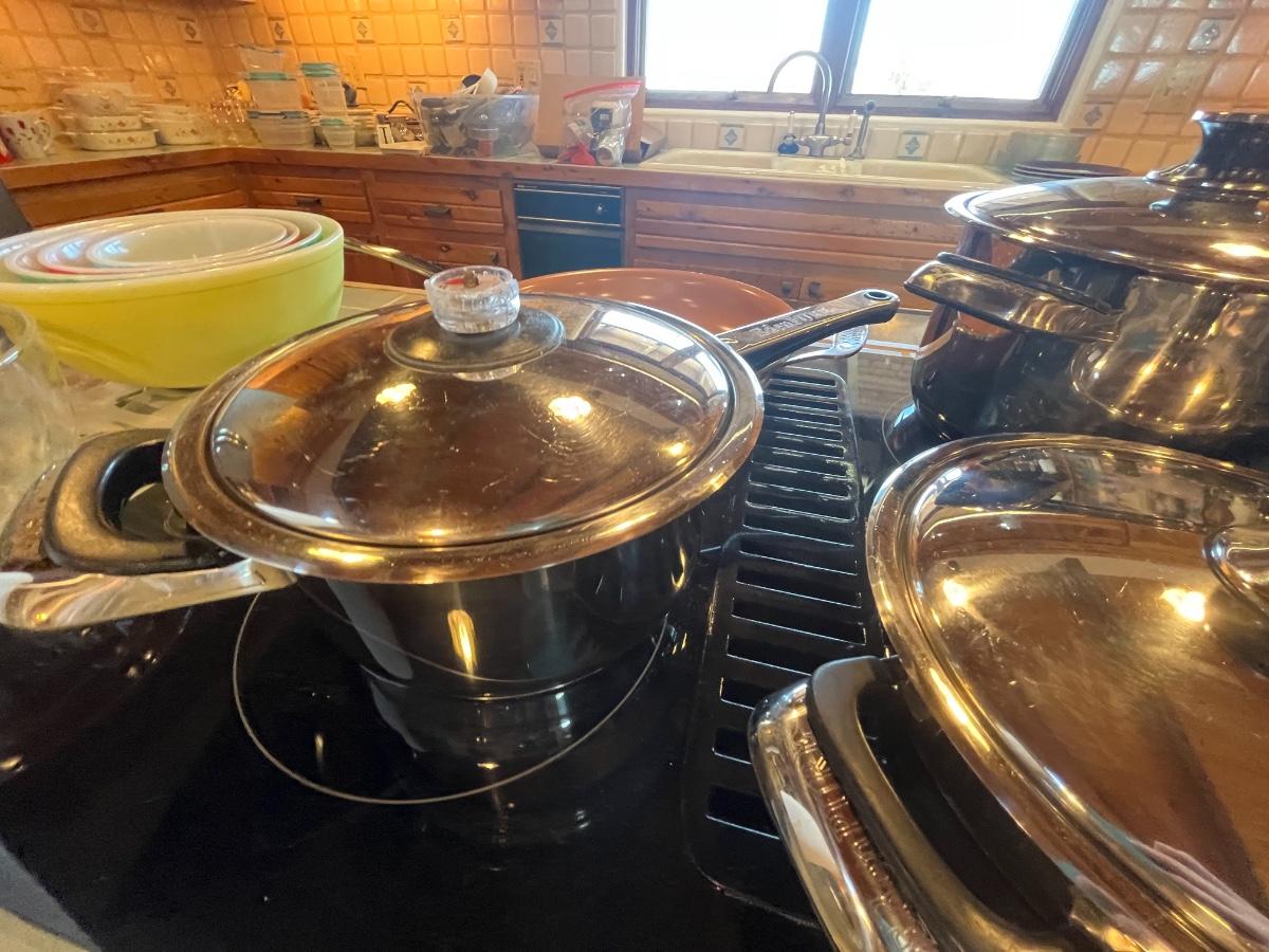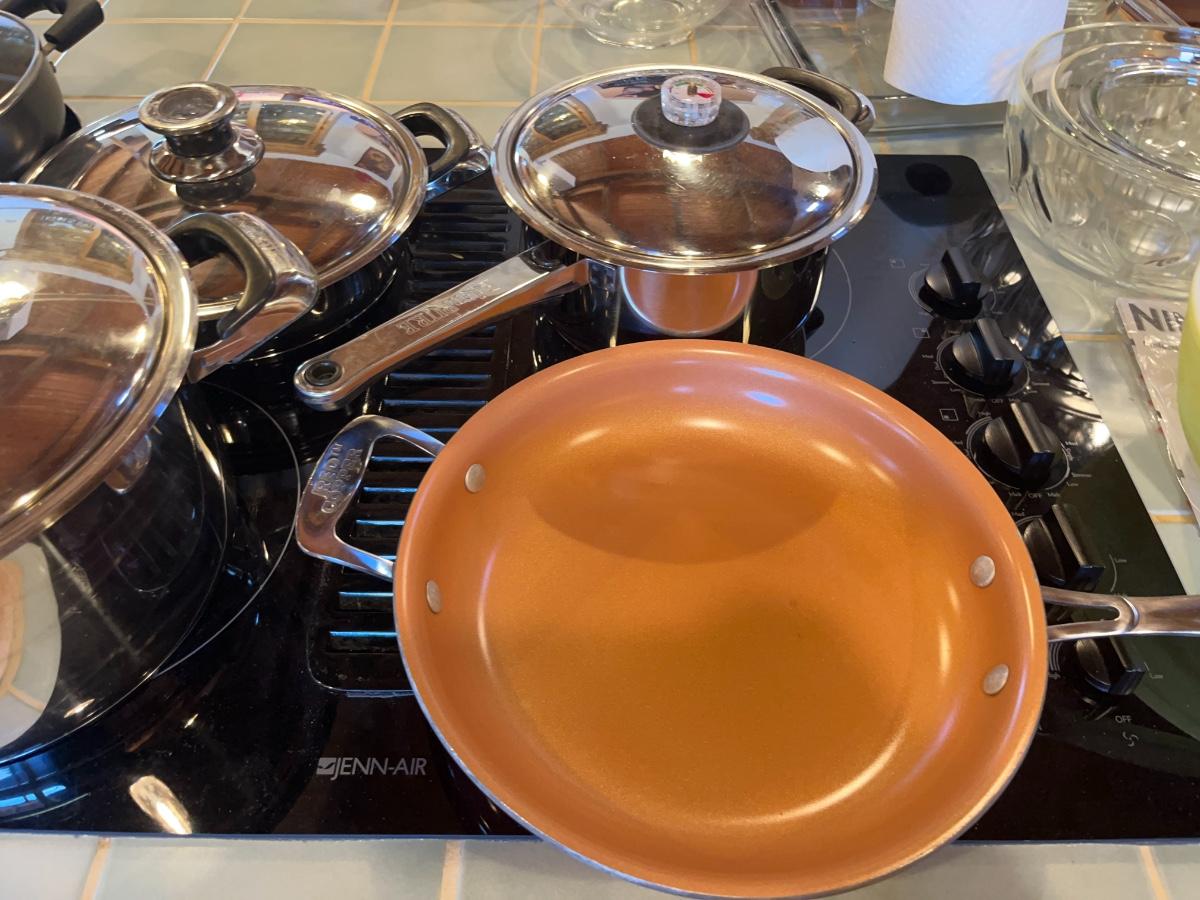 Pots/pans - 9 p, brand names include: edenpure, red copper, invitations