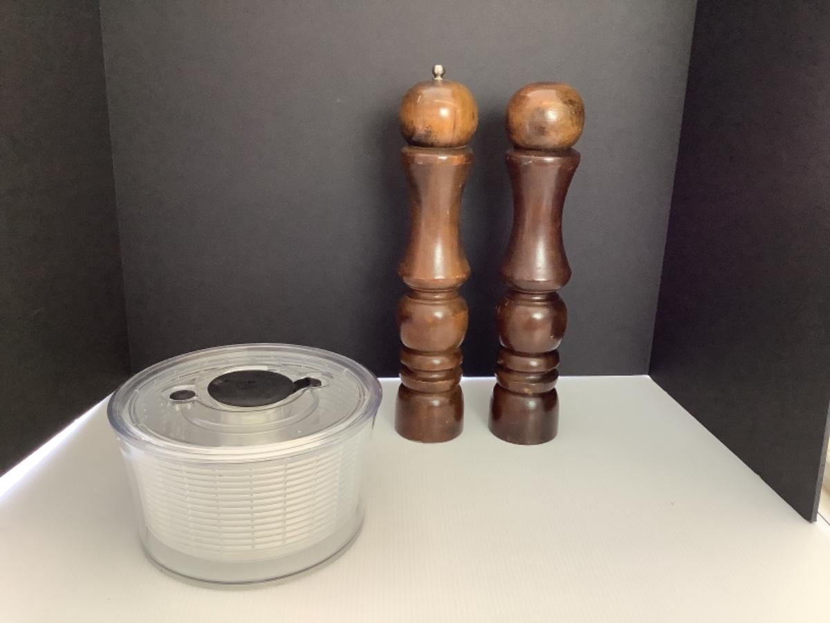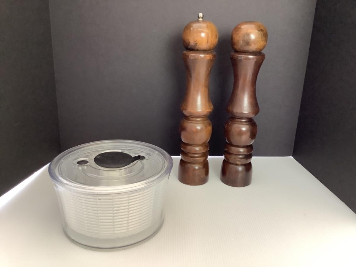 A - 223 Large Vintage Wooden Salt &. Pepper Mills / Salad Spinner