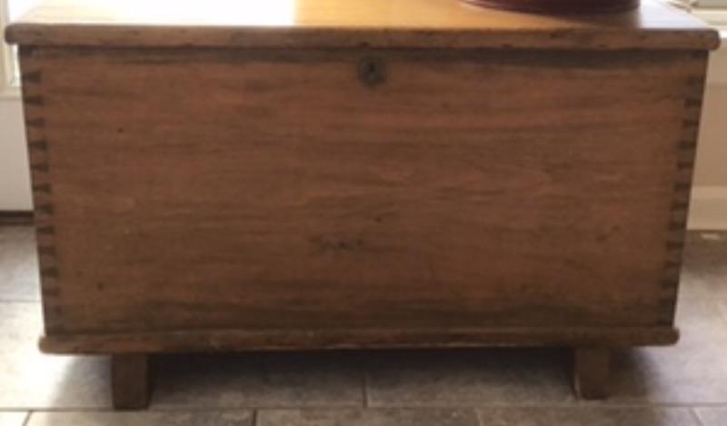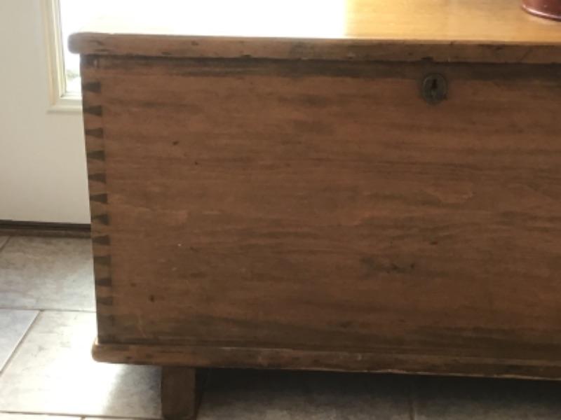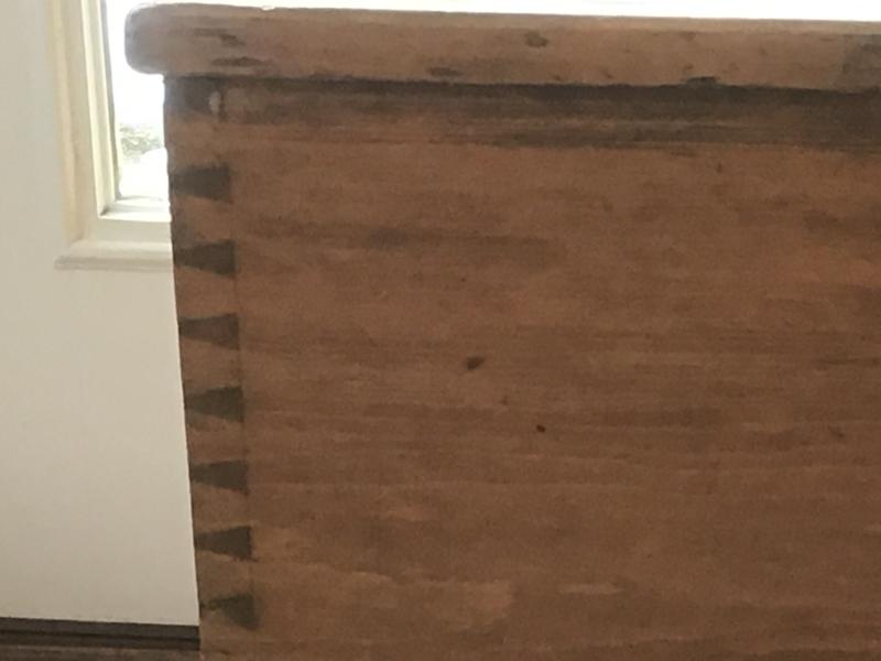 Antique Pine Blanket chest, with key, Beautiful dovetail details with 2 metal handles located on the side -