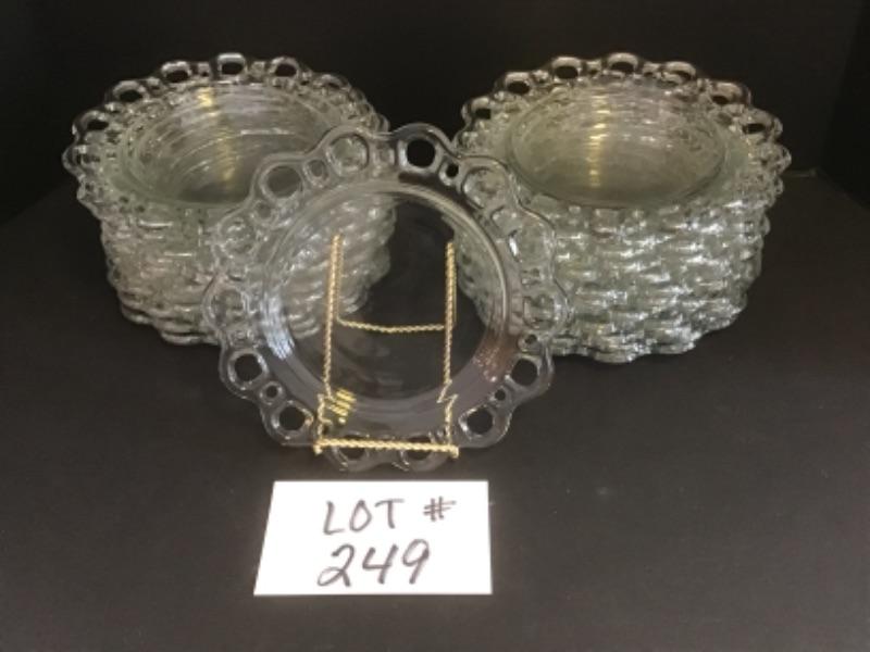 A - 249 Set of 24 Vintage Open Lace Edge Clear Glass Plates