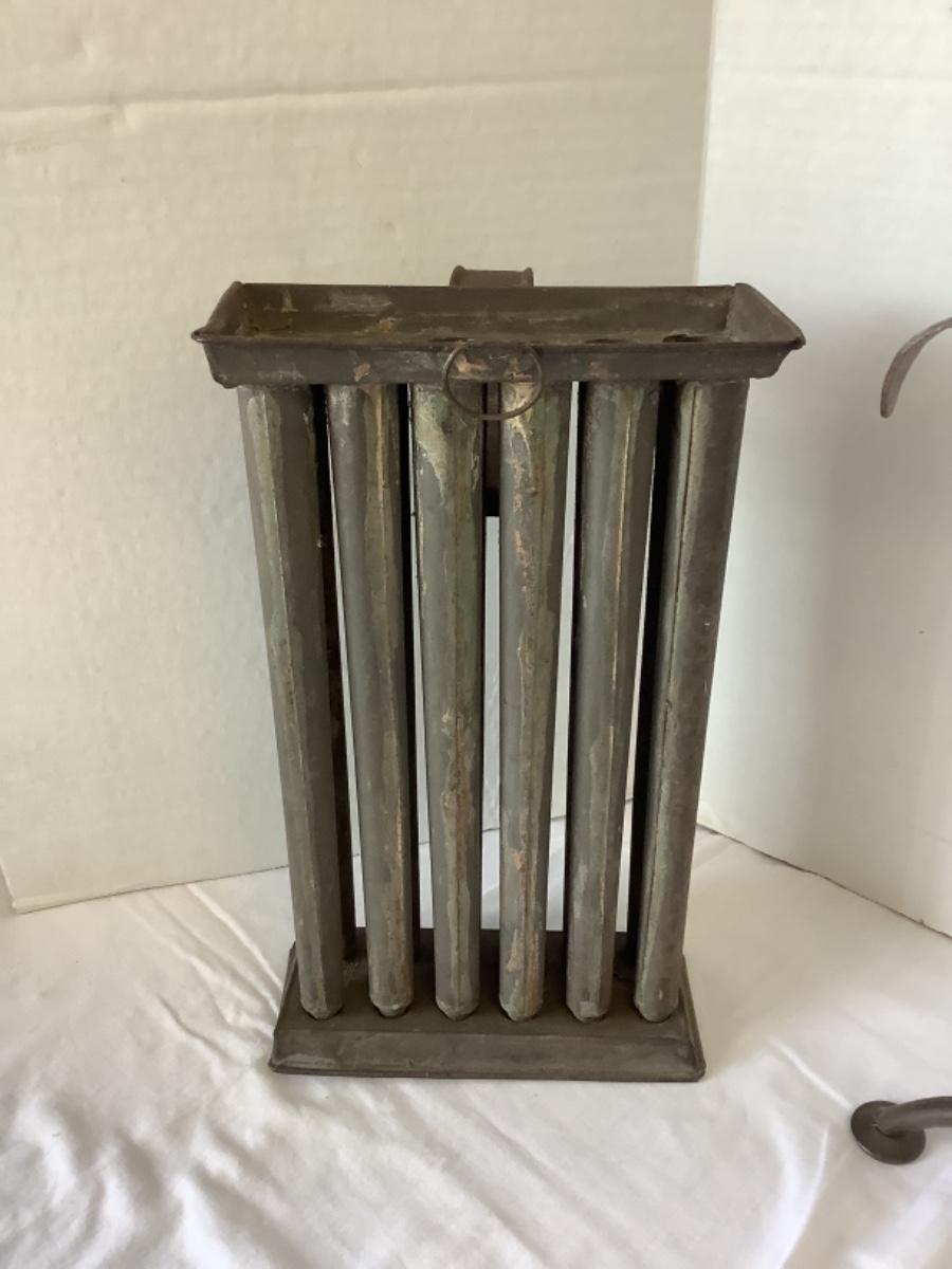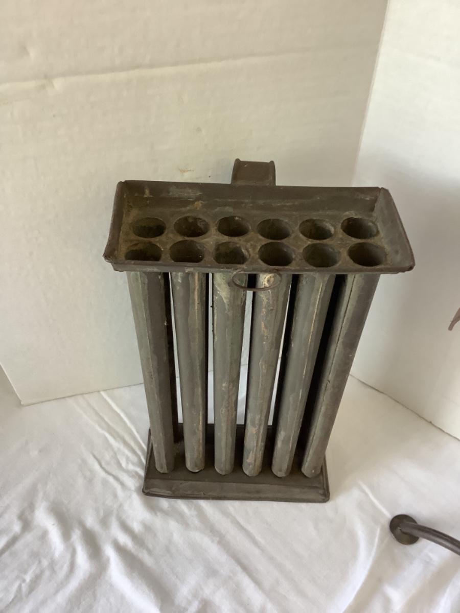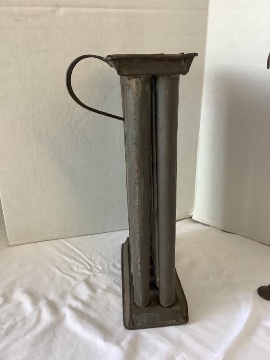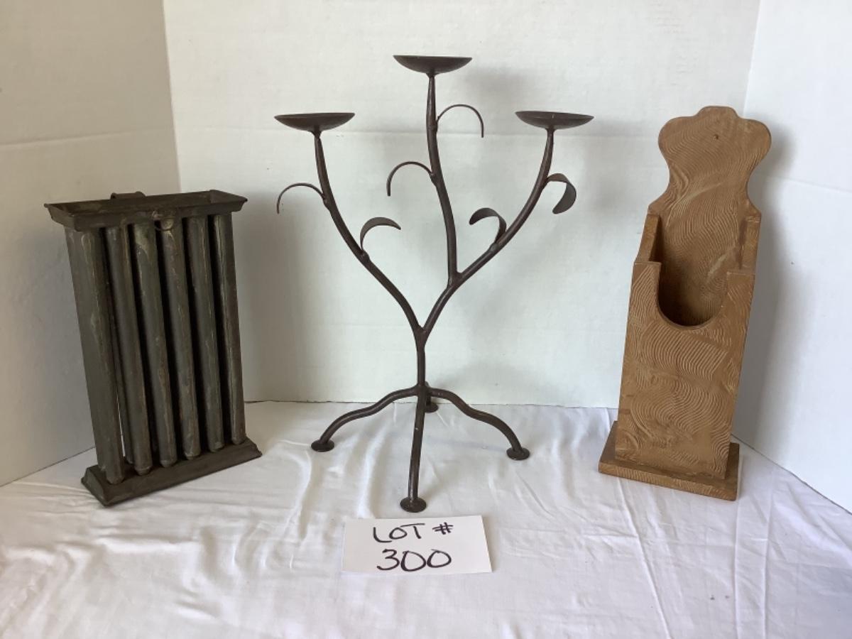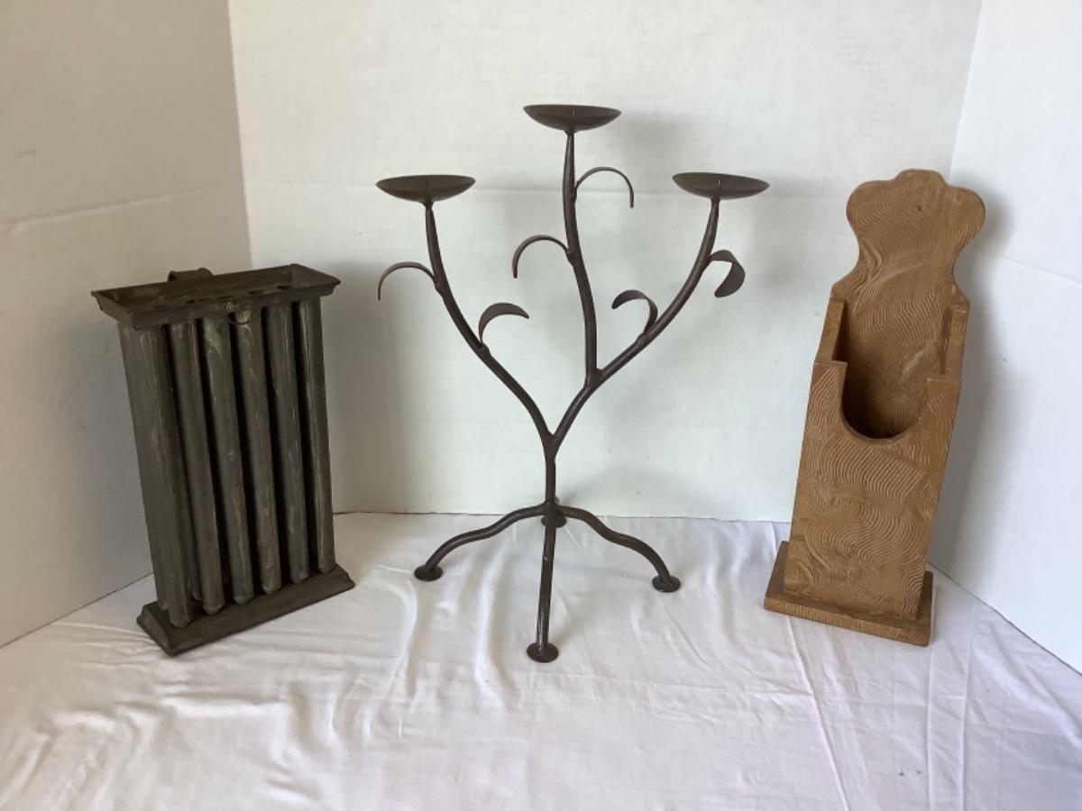 A - 300. Antique Candle Mold, Wooden Candle Box Holder, Wrought Iron Candlestick Candle Stand