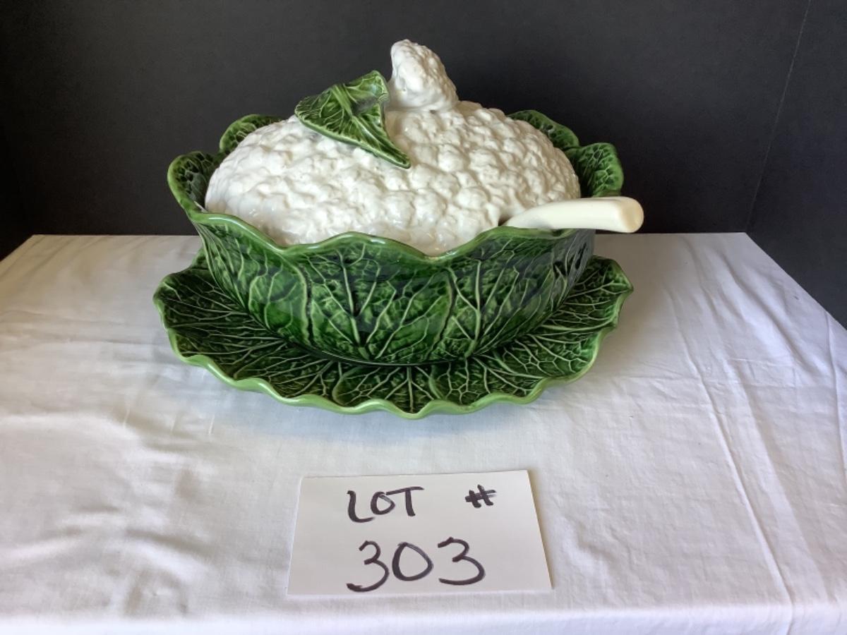 A - 303 Vintage Majolica, Subtil. Portugal, Green Cauliflower Cabbage Soup Tureen