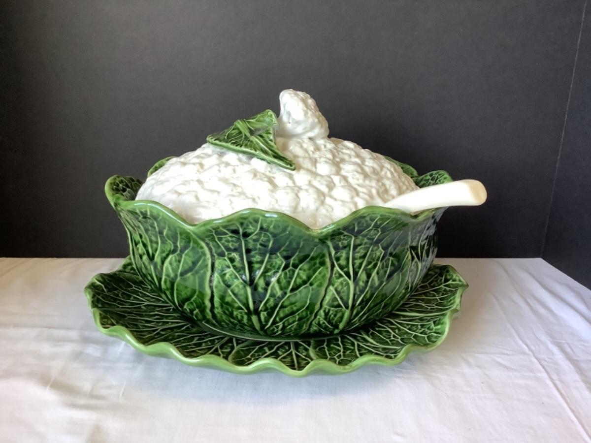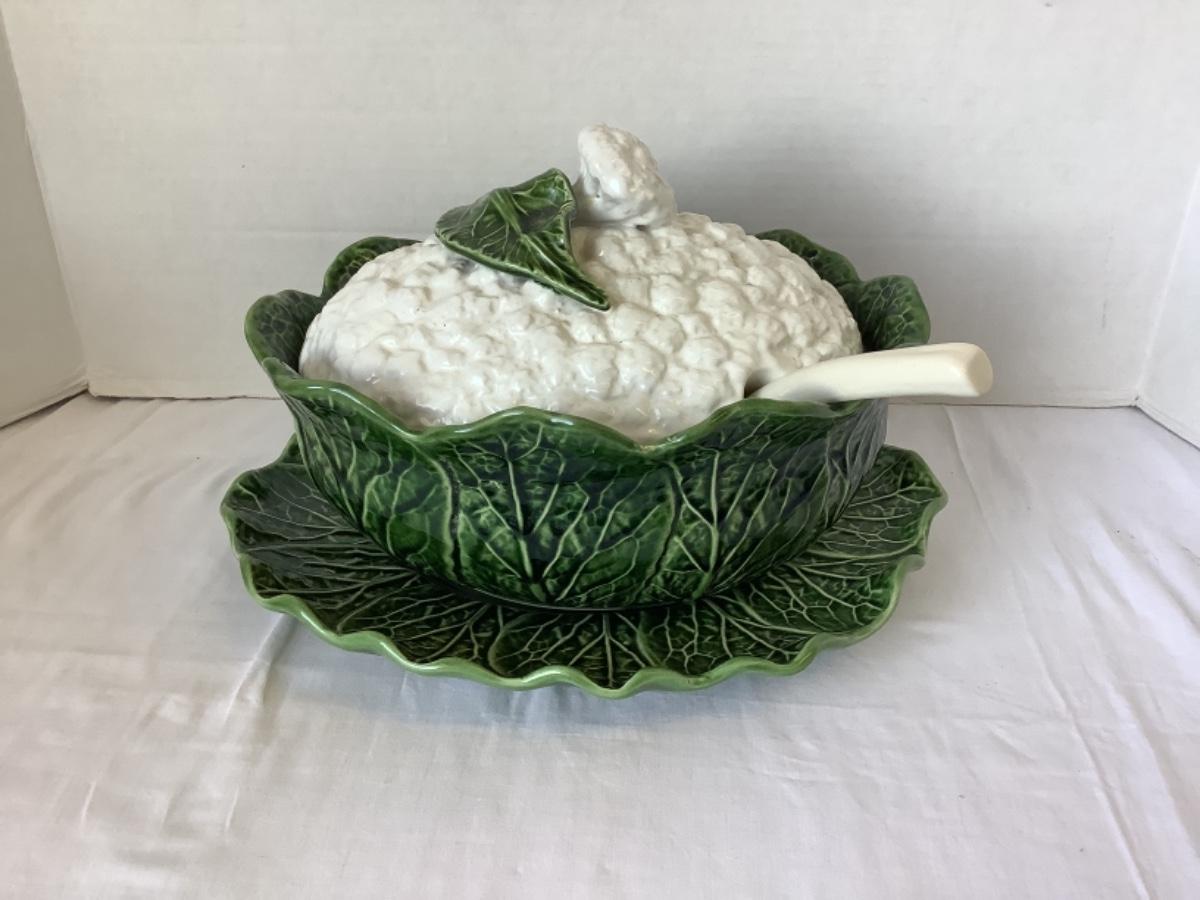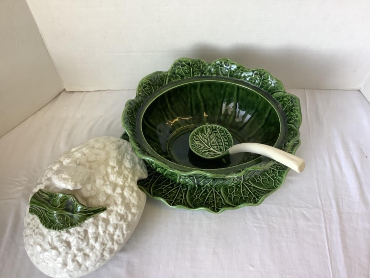 Vintage Majolica, Subtil. Portugal, Green Cauliflower Cabbage Soup Tureen with under plate and ladle