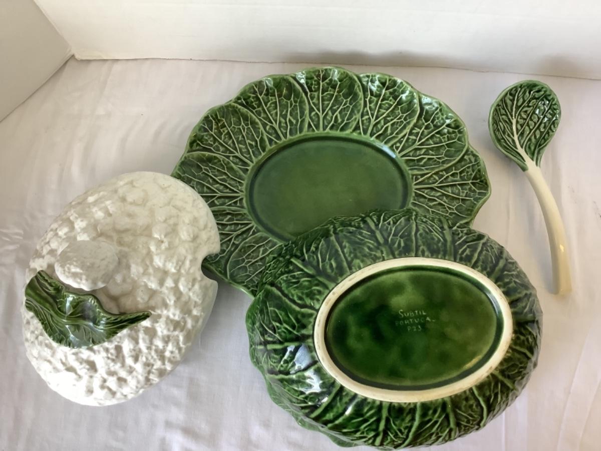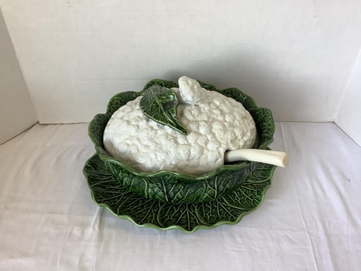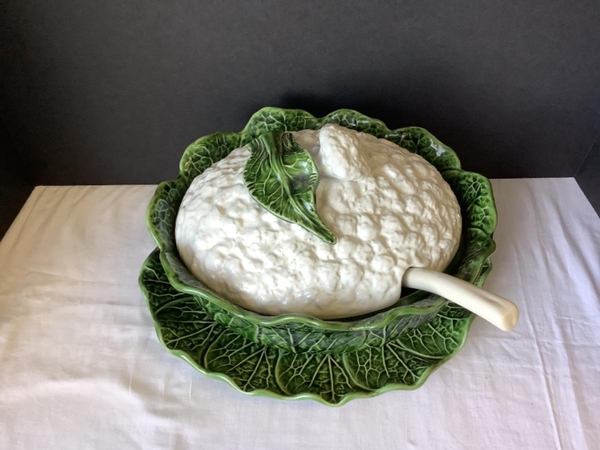 Vintage Majolica, Subtil. Portugal, Green Cauliflower Cabbage Soup Tureen with under plate and ladle