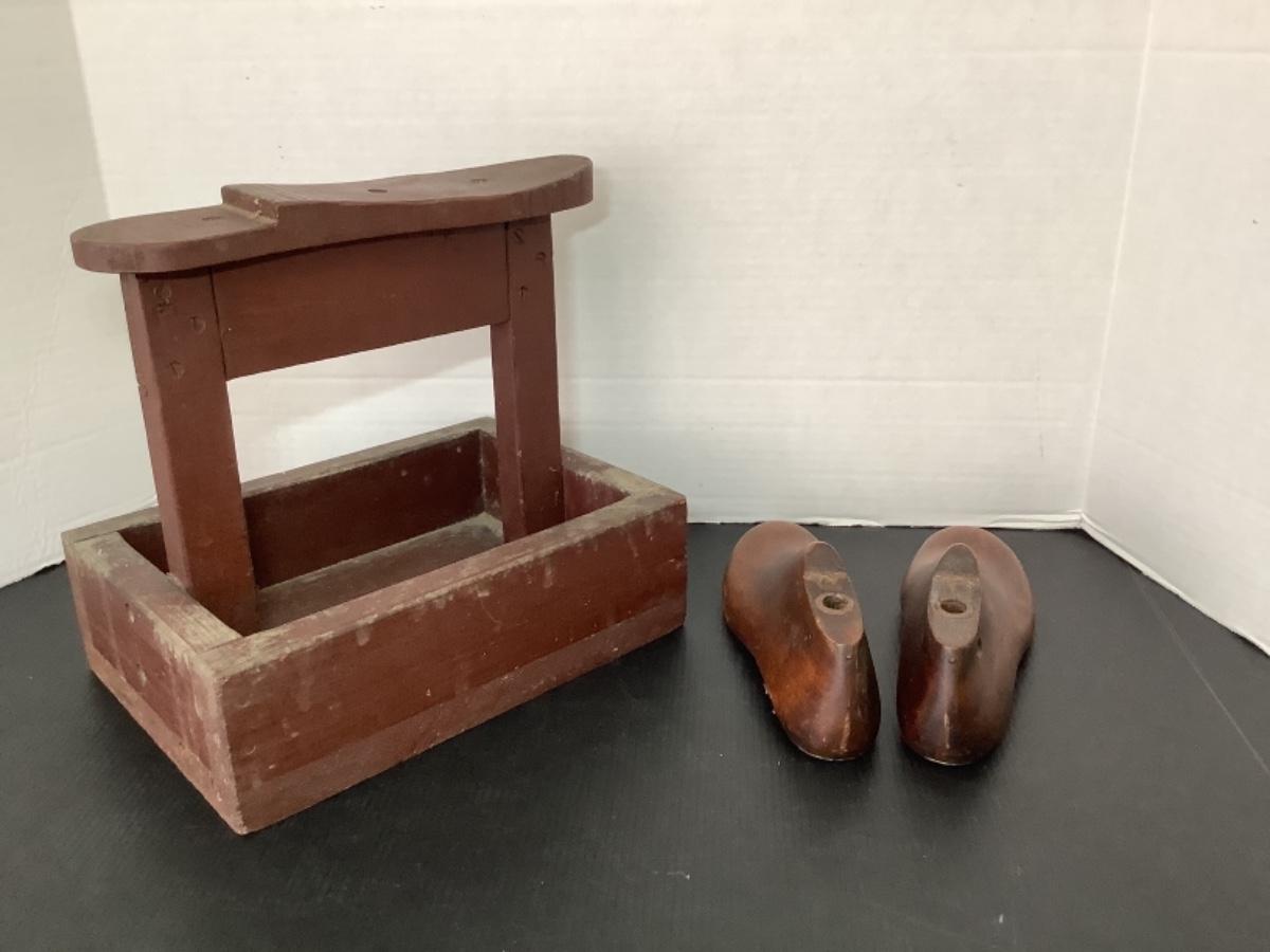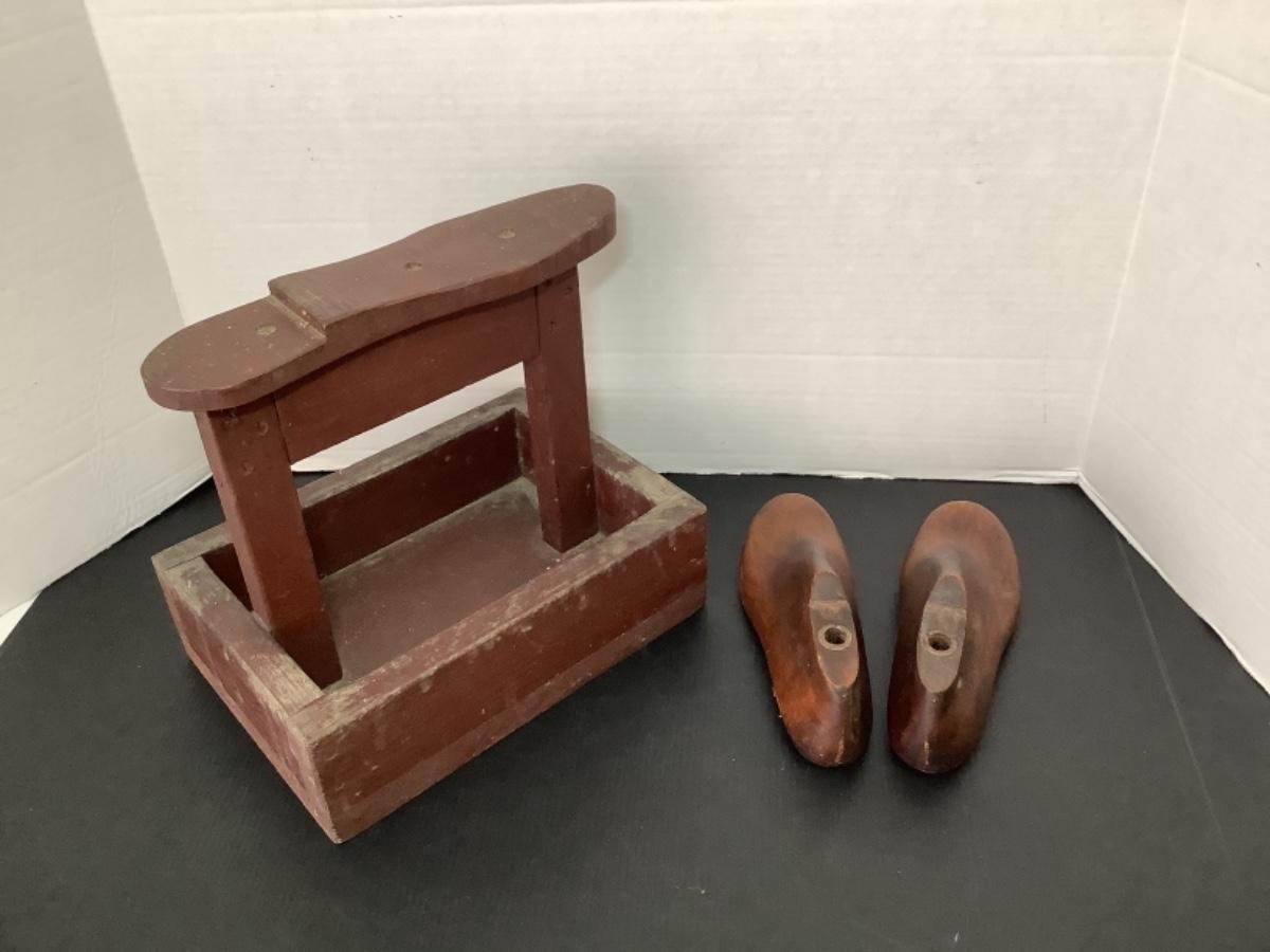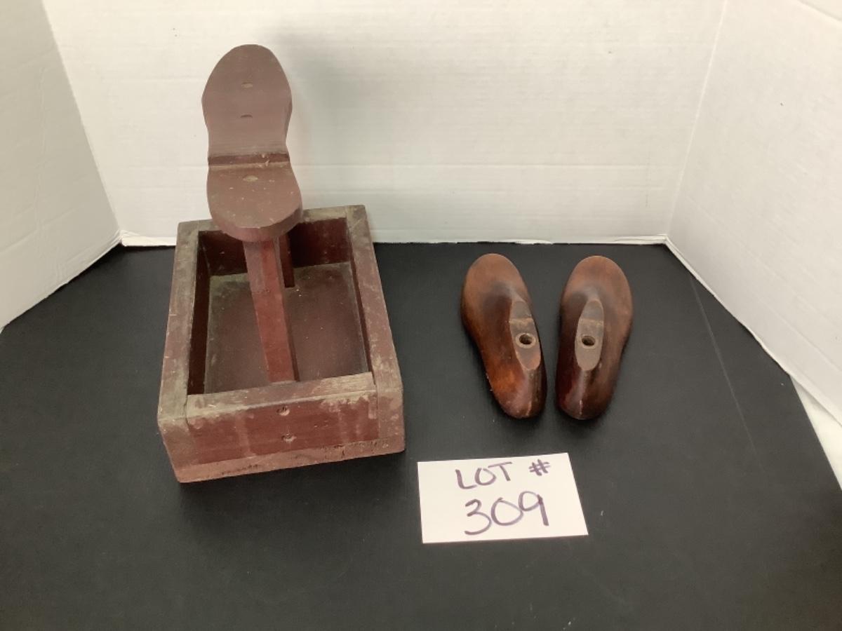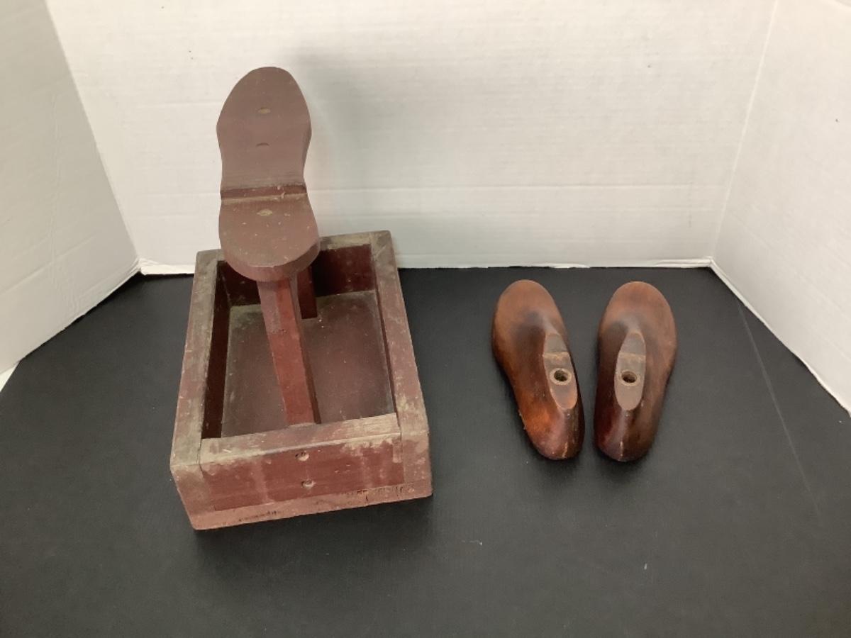 A - 309. Pair Vintage Wooden Cobbler Shoe Molds & Vintage Wooden Shoe Maker Cobbler Stand/Shoe Form
