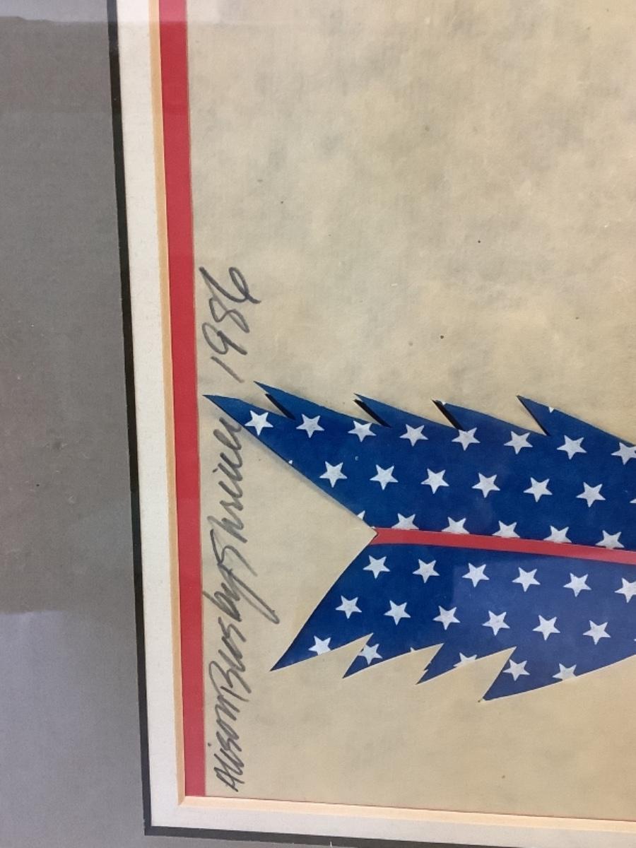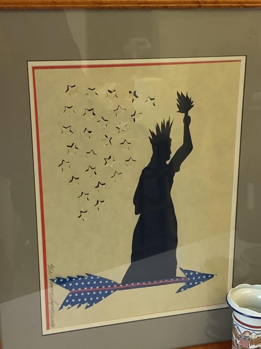 Signed Framed Statue of Liberty Artwork 1986 - Annapolis artist Alison Shriver was inspired to create a totally unique collection of silhouettes and collages which has attracted a wide audience throughout the United States and abroad. Her paper cutting collages make use of early American images and symbols and use actual antique documents and ledgers as backgrounds. The combination of antique Americana, painstaking detail, and a very clean, crisp modern design sense creates a highly prized, individual art style. Alison Shriver's artwork is exhibited and sold in prestigious shows and in stores and museum shops throughout this country as well as in Europe. She is a juried member of the Pennsylvania Guild of Craftsmen. Her work has been carried in the J. Peterman, Williamsburg, Ballard Designs, Bungalow, Sturbridge Yankee & The Orvis catalogues - it also has been featured on the cover of the Chesapeake Bay Foundation, and Spiegel catalogues. Her work has also appeared in Family Circle, Country Home, Country Living (1999 & 2006), Home, Victoria and Coastal Living magazines and was featured in a New York Times full page ad by Bloomingdales' Decorator Showroom. Alison Shriver holds a Bachelor of Fine Arts Degree, majoring in Graphic Design & Photography, from the Maryland Institute College of Art. She has worked as a designer in television in Baltimore, Los Angeles, & London. For the past 22 years she has operated Alison Shriver Designs in Maryland.