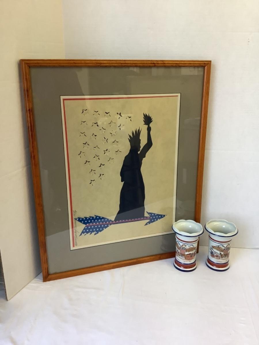 A - 324 Signed Framed Statue of Liberty Silhouette by Alison Shriver 1986 & Pair of Mottahedeh Porcelain Bicentennial Eagle Vases