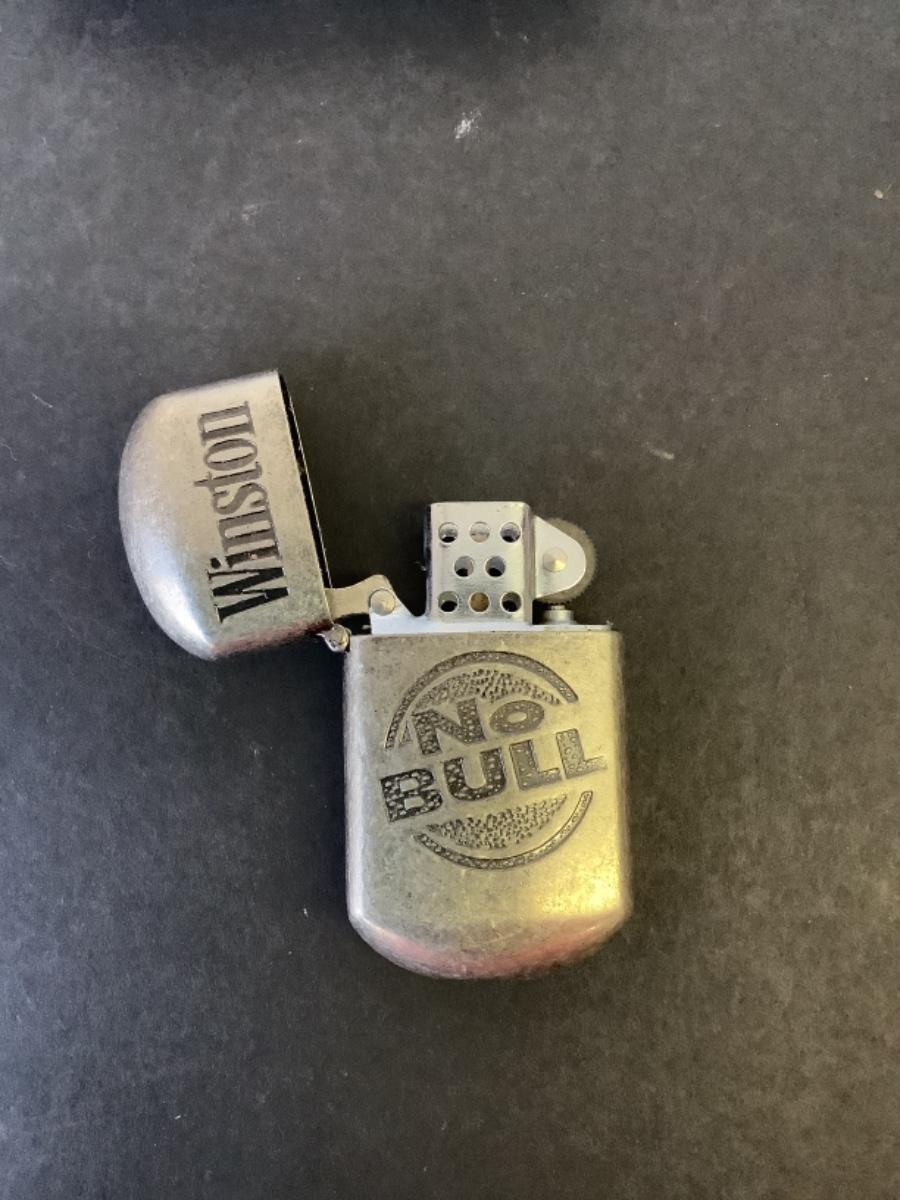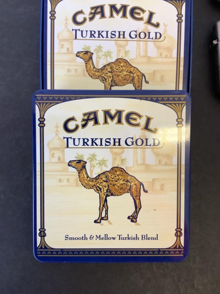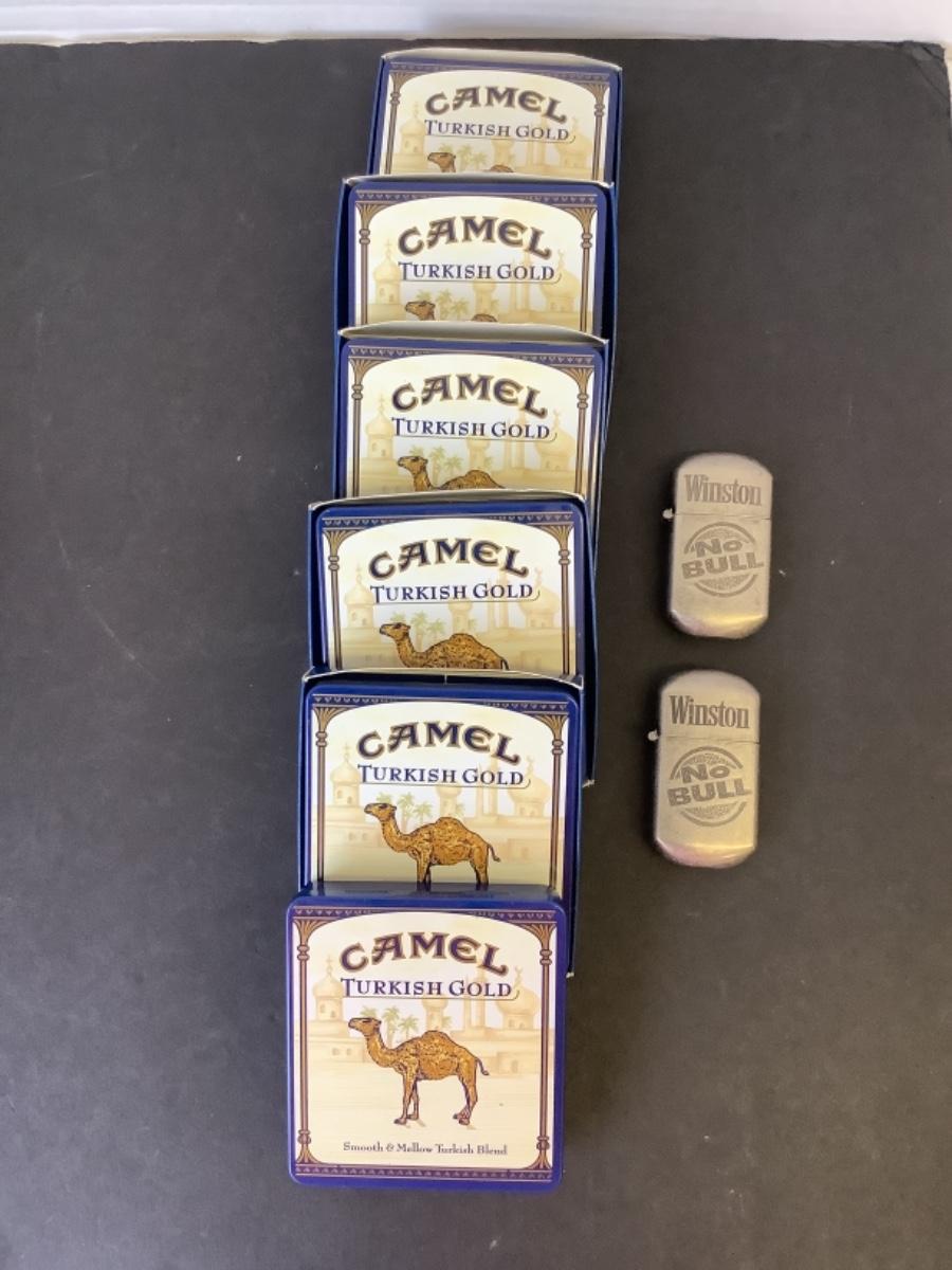 A - 356  Collection of Blue, Camel Cigarette Tin Boxes & Two Winston “ No. Bull “ Tobacco Lighters