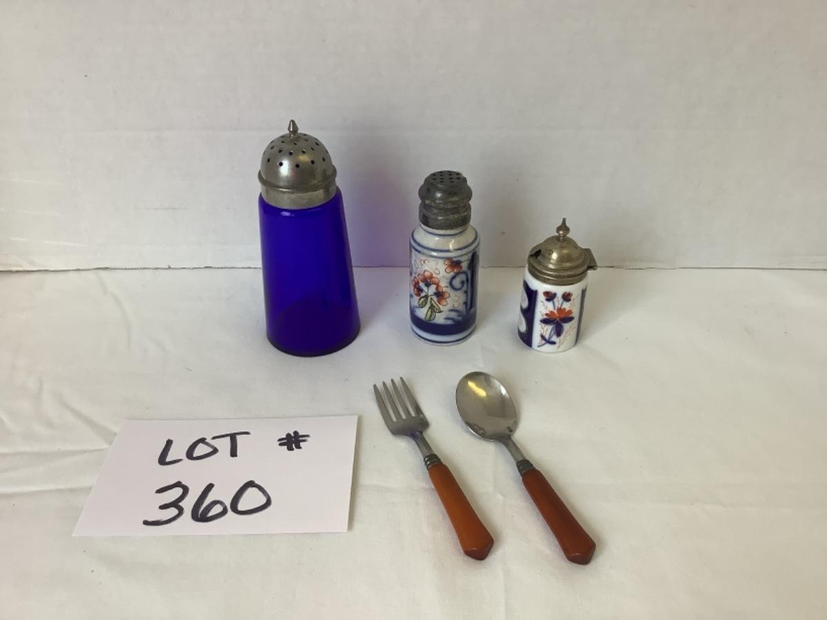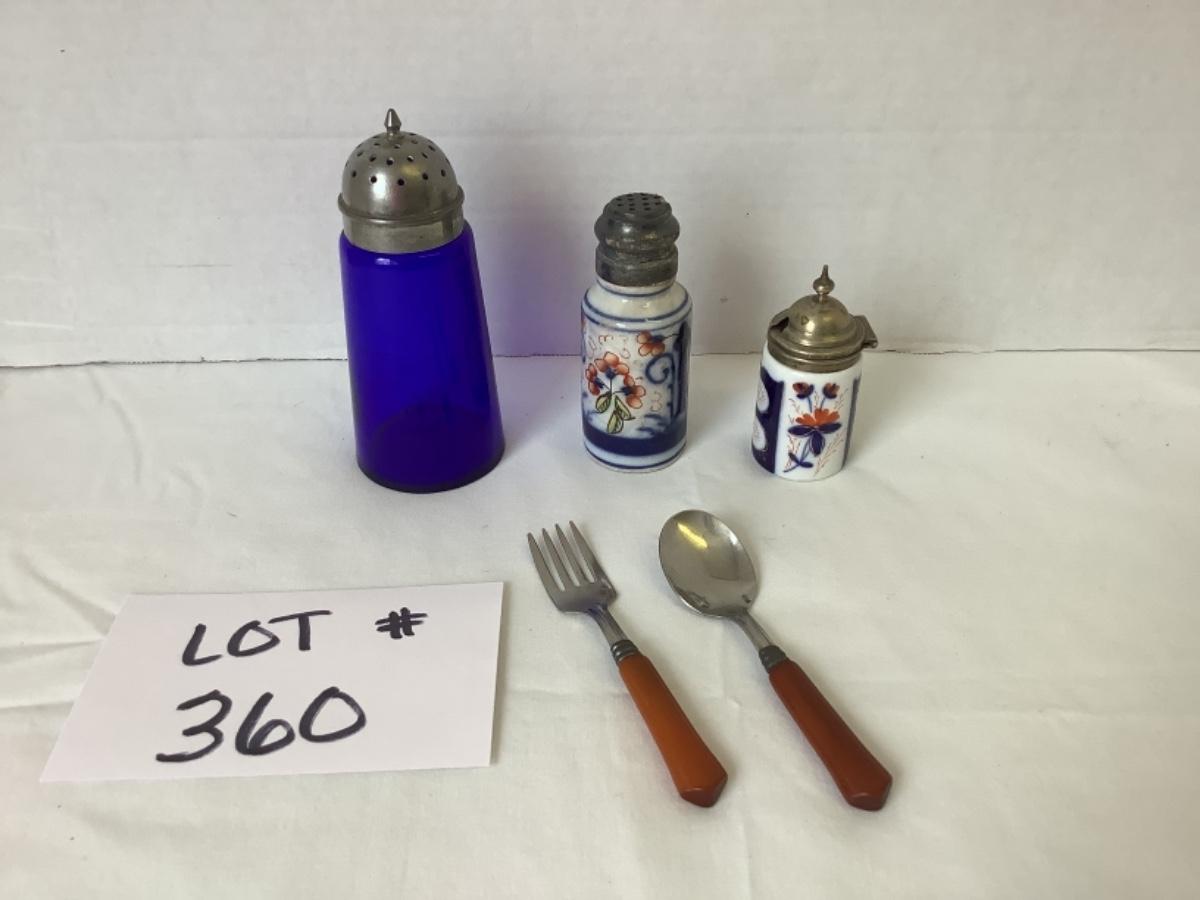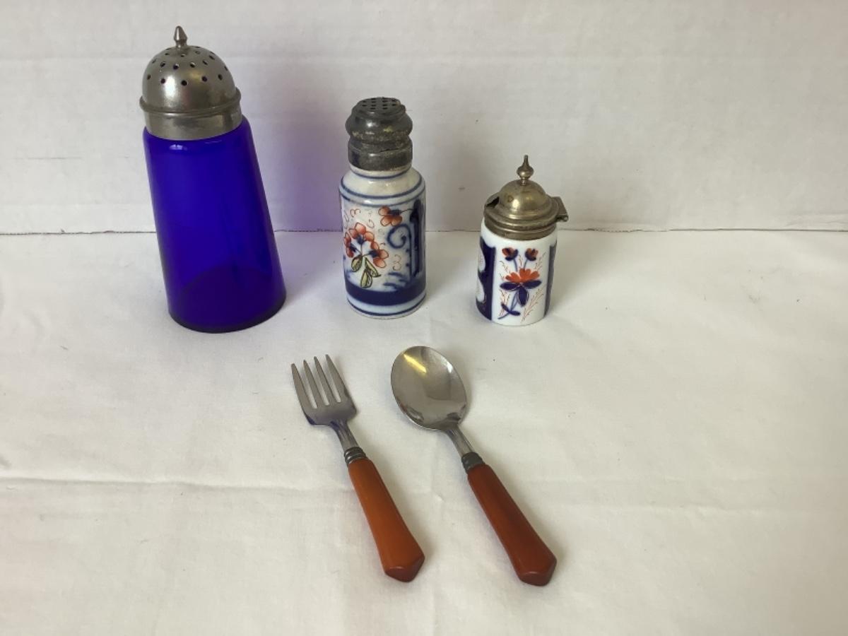 A - 360 Antique Imari Porcelain Jar, Cobalt Blue Glass Shaker, Flow Blue Shaker, Childs Antique Fork/Spoon