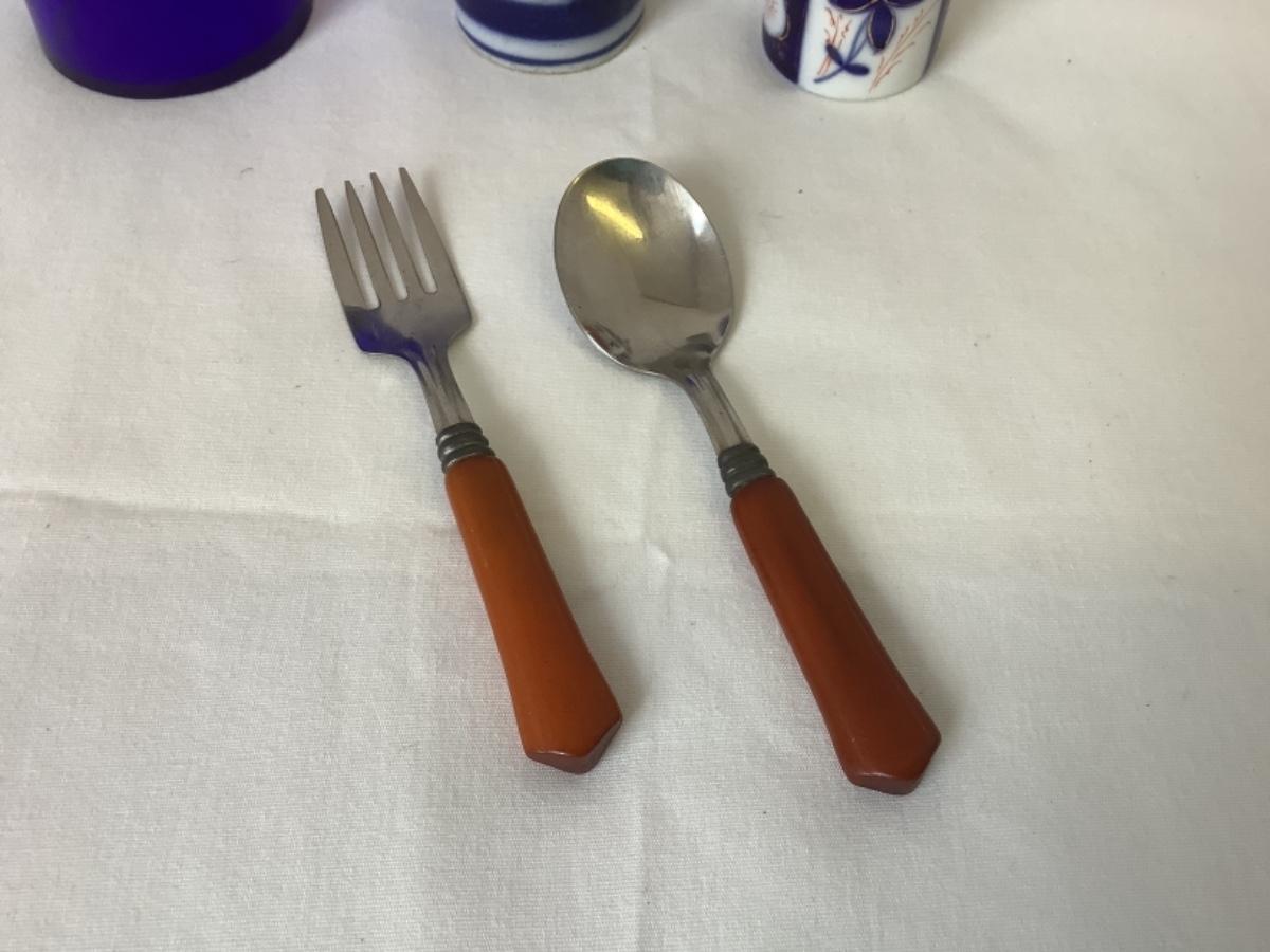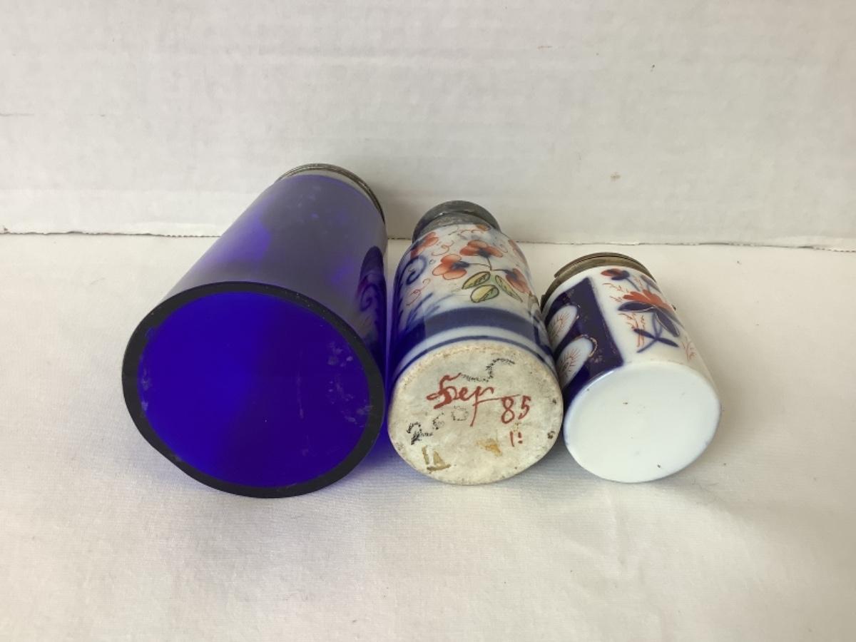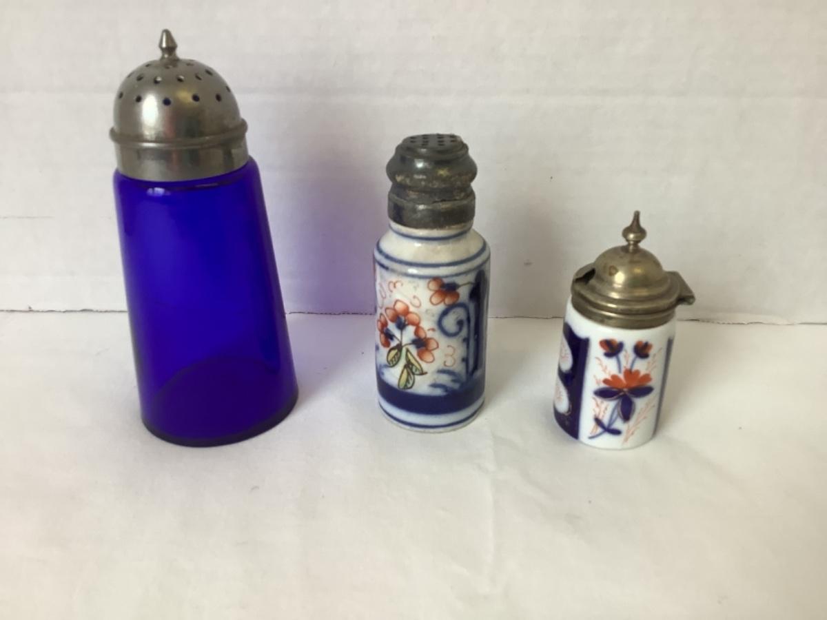 A - 360 Antique Imari Porcelain Jar, Cobalt Blue Glass Shaker, Flow Blue Shaker, Childs Antique Fork/Spoon