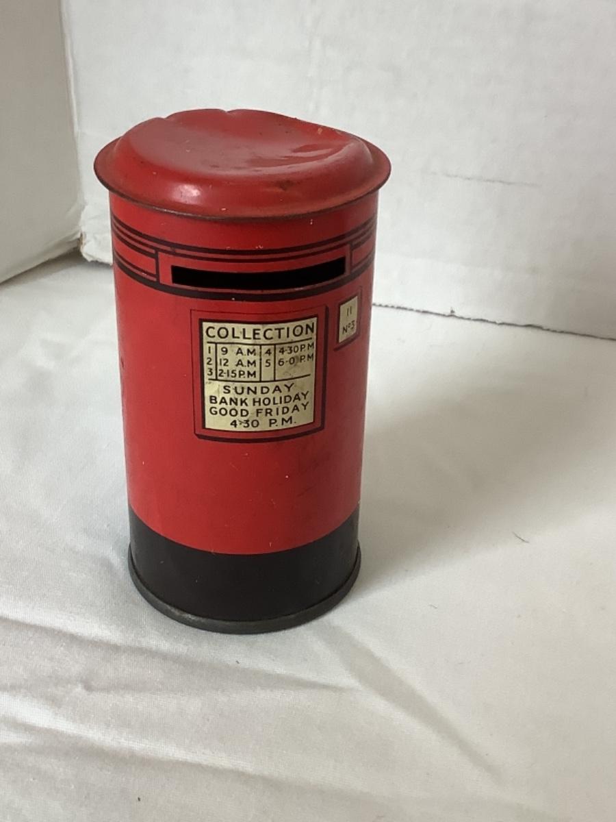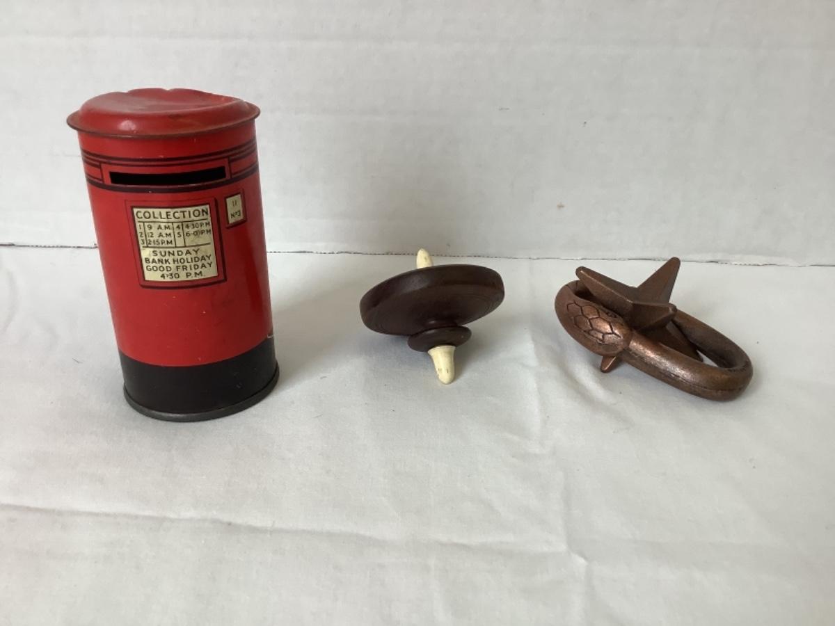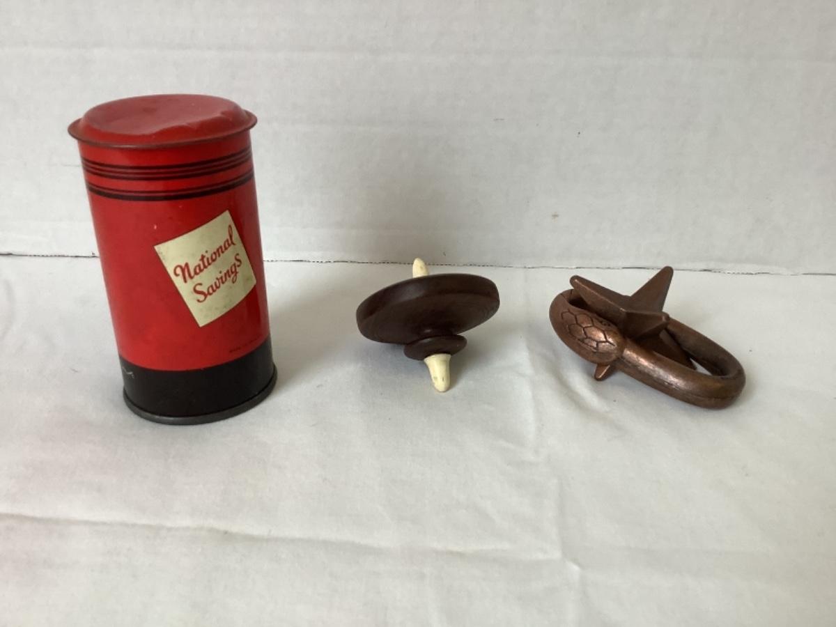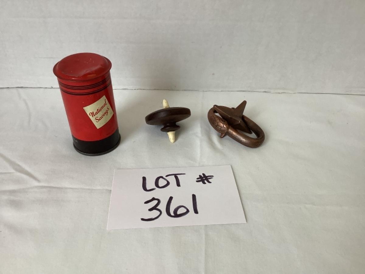 A - 361 Antique Tin Bank, Vintage Wooden Top, Vintage Bronze Colored Star Cast Metal Puzzle game